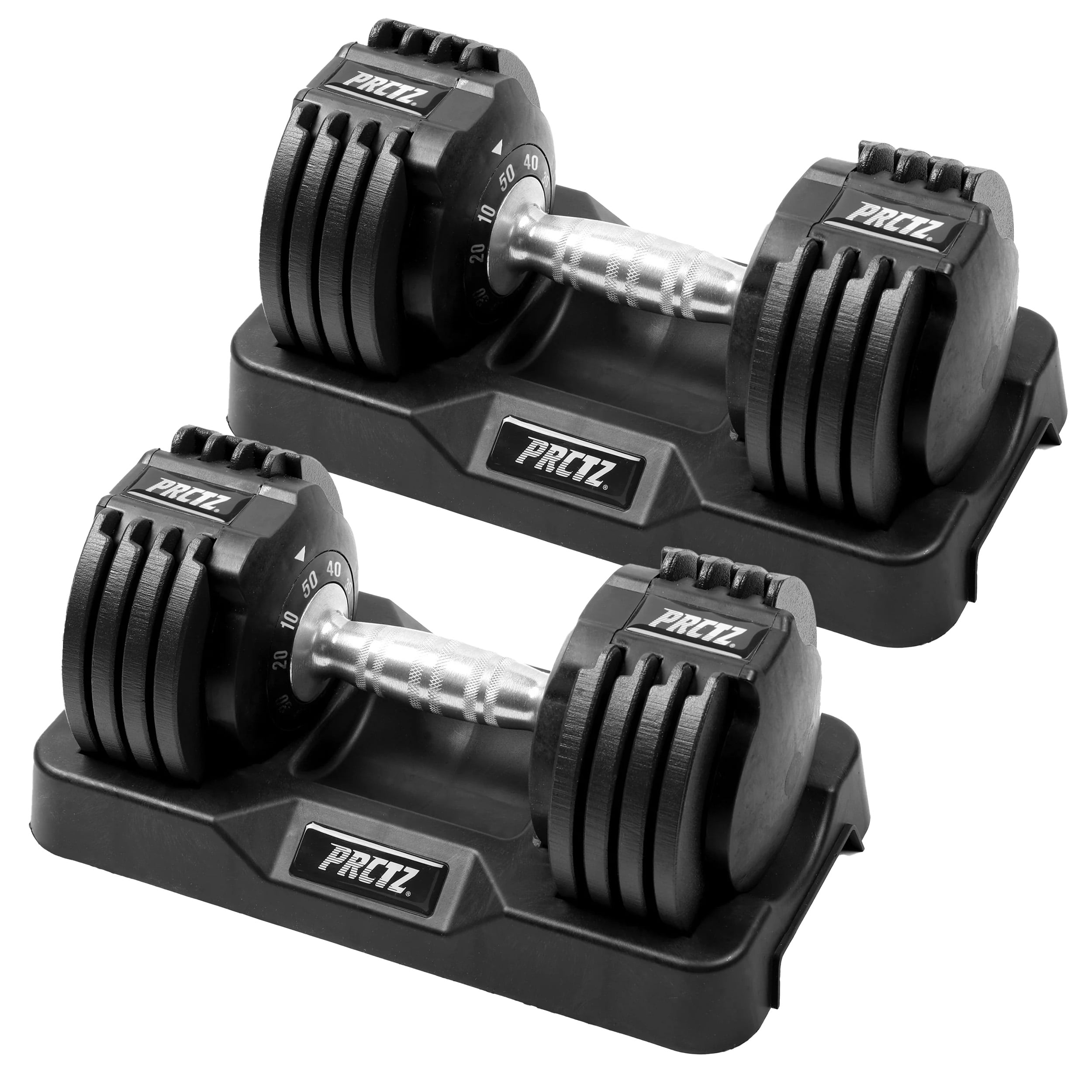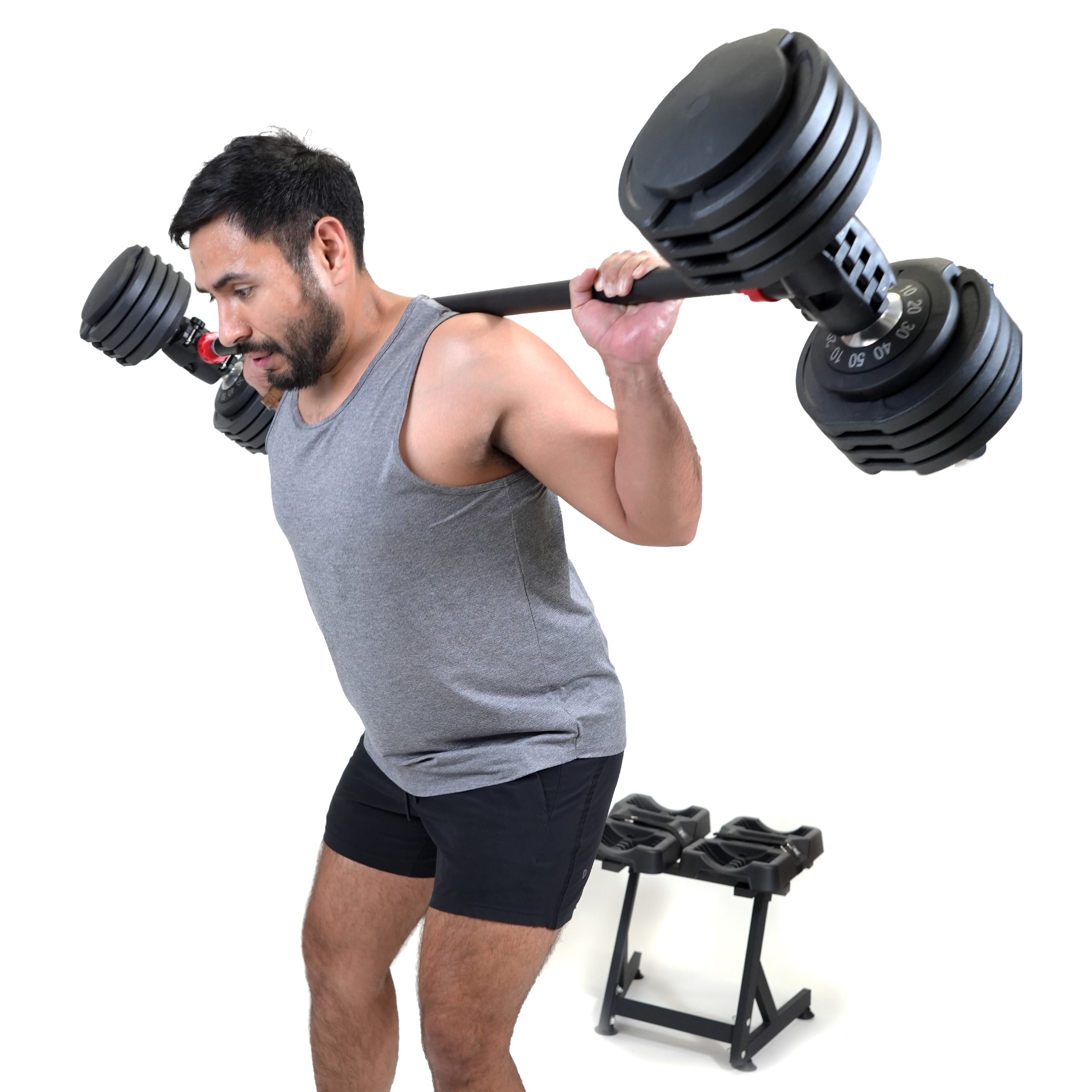 Compatible with all PRCTZ adjustable dumbbells Adjustment increments: 10lbs, 20lbs, 30lbs, 40lb to 50lbs Two-piece training barbell, 1” dia x 44” L without the dumbbell clamps or 1″ x dia 54.6″ with the dumbbell clamps Barbell weight: 7.8 lbs