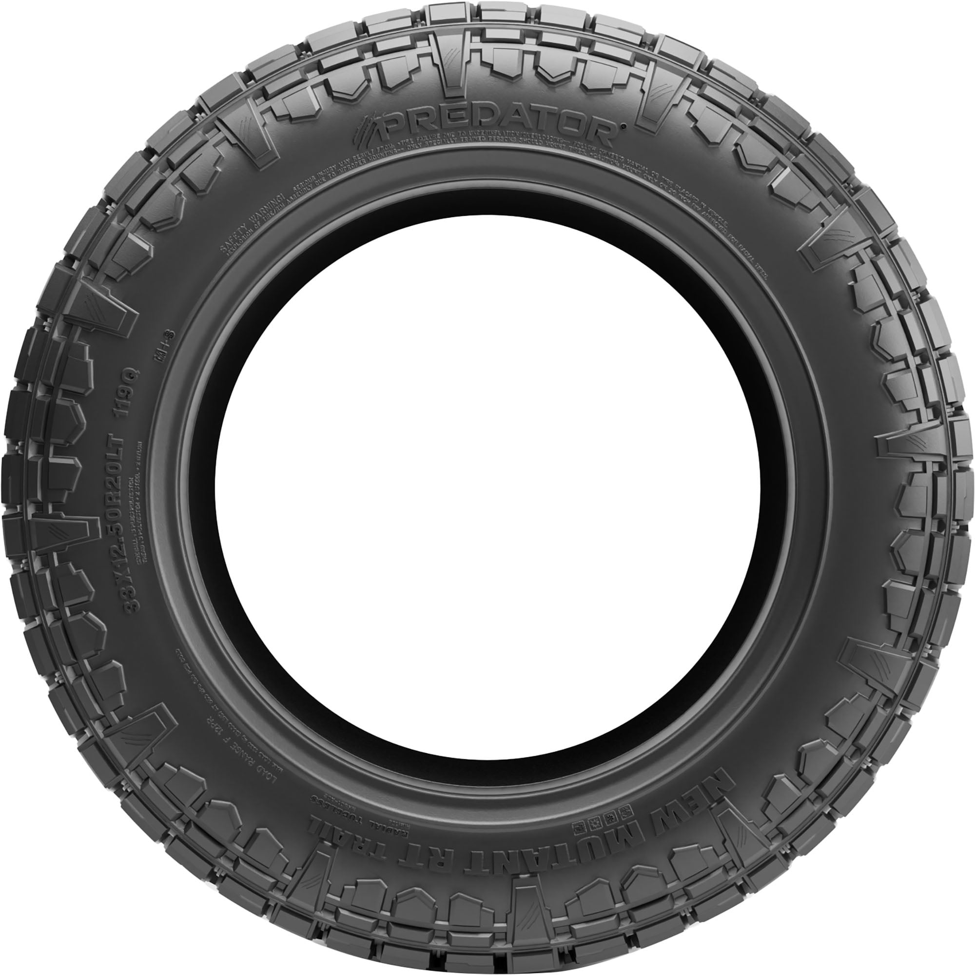 Predator New Mutant RT Trail LT285/70R17 126/123Q E OVERVIEW The Predator New Mutant RT Trail is a rugged terrain tire that’s designed for Jeeps and light trucks. Built with an advanced off-road compound, it provides exceptional grip on mud, snow, and loose surfaces and maintains long tread life and confident highway handling. In addition, the New Mutant RT Trail has reinforced shoulder grooves and aggressive sidewall lugs that offers handling without sacrificing daily drivability.