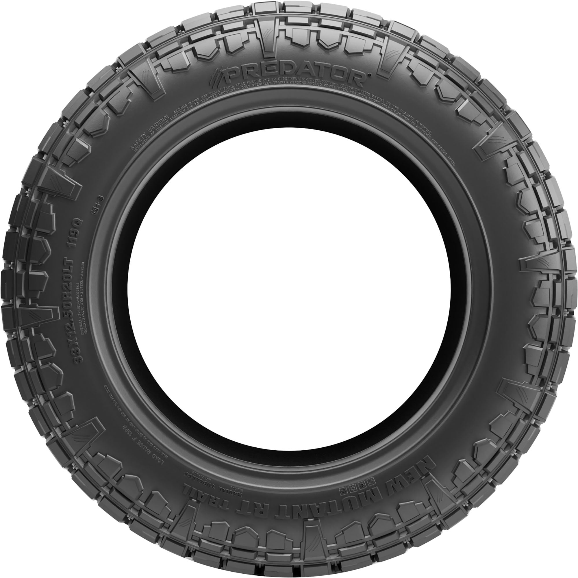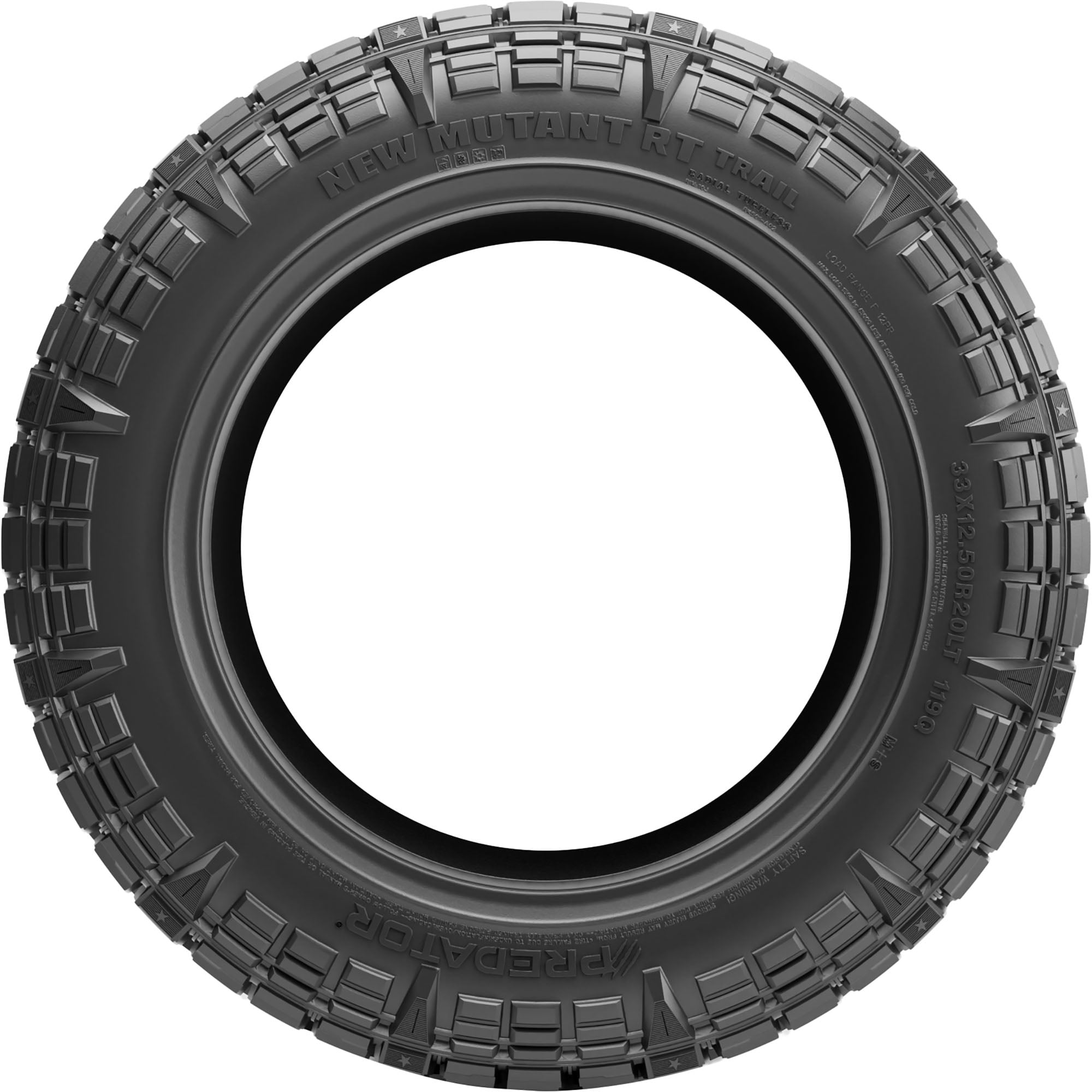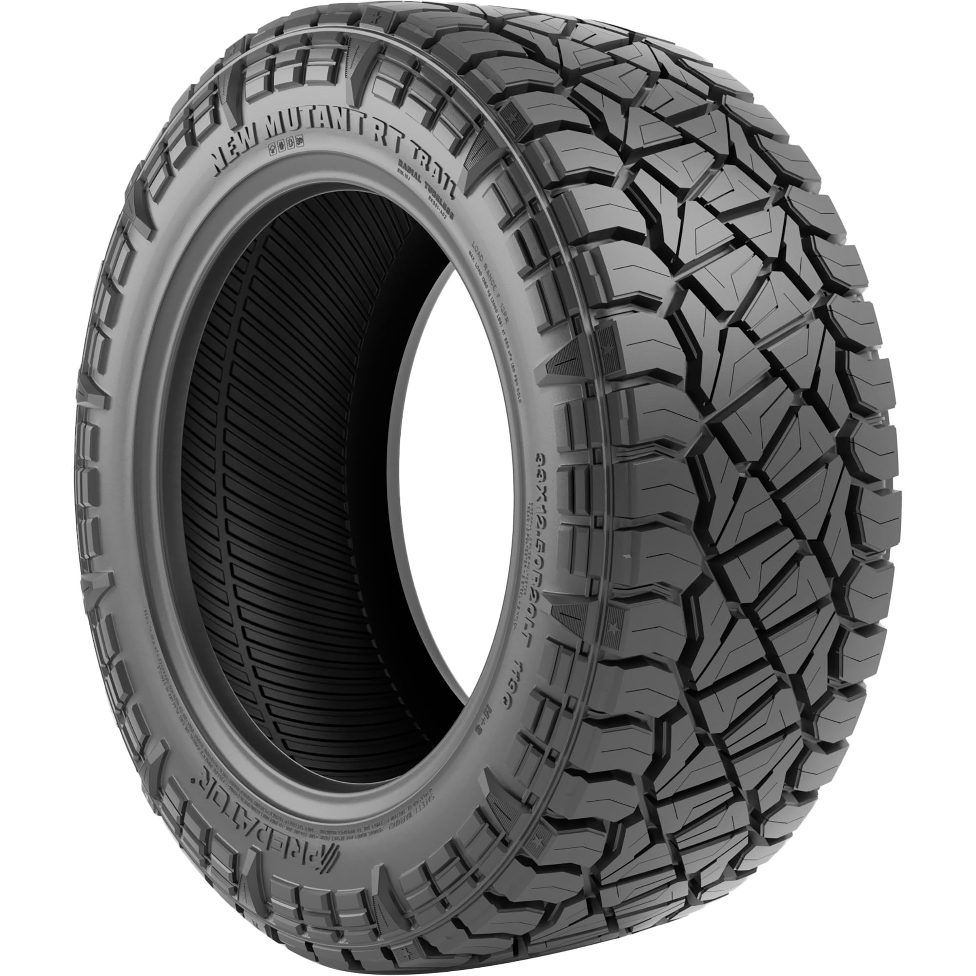 Predator New Mutant RT Trail EV LT275/65R20 126/123S E OVERVIEW Designed for electrically powered jeeps, SUVs, and pickup trucks, the Predator New Mutant RT Trail EV is a rugged terrain tire that features dual sidewall design, advanced off-road compound, and optimized tread pattern for maximum rough road performance and increased on-road comfort. While deep, siped tread blocks boost stability and handling in snowy, rainy, and wintry conditions, the durable construction allows increased resistance to cuts, chips, and abrasions for longer service life.