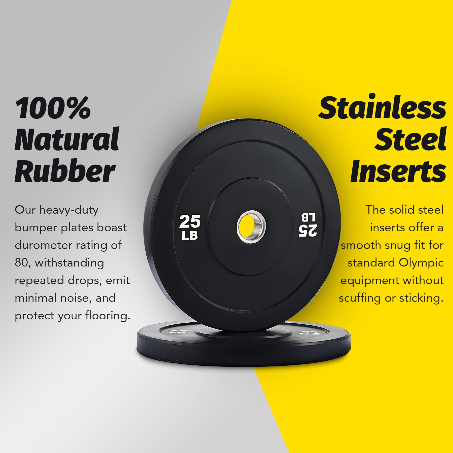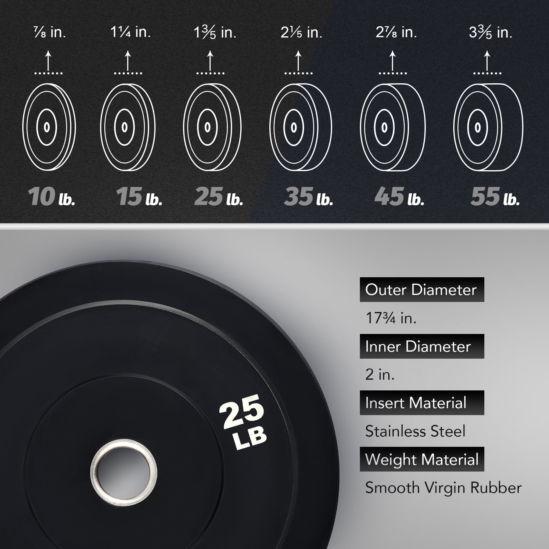 Our bumper plate set includes two 25-pound weights with 17.7″ by 1.7″ iwf dimensions and 2-inch center holes to mix and match with standard strength training equipment, including Olympic barbells, hex bars, and dumbbells, sleds, and racks. Our premium virgin rubber plates have 80-durometer density with a far quieter drop than clanging iron or steel competition, simultaneously, their softer sides and minimal bounce protect your flooring from damage and prevent accidental injury, especially when exercising with others. Each 25 lb. The weight plate has a stainless steel insert to offer a smooth snug fit for standard 2″ Olympic equipment, providing years more service than iron and bronze alternatives whether used with weight benches or for straight powerlifting and floor work. Keeping organization and change-outs quick and easy, each bumper plate is clearly marked with high-contrast white weight markings in pounds, easily read from across the room.