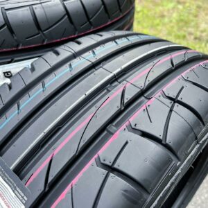 The asymmetric tread design upgrades the surface contact while the tires are in motion. The asymmetric ribbed tread design improves the steering responsiveness and the driving stability. The three center ribs maintain the surface contact throughout the performance by boosting the steering response time and accuracy, while the structure is secured against the driving stability throughout the drive. The shoulder tread design allows the tire to firmly grip the road surface with additional biting edges. In this manner, the tire is able to securely upgrade the maneuvering ability. The heat resistant silica compound and the stronger internal structure enable the tire to perform at its utmost high speed capability. As heat build-up is avoided and the structure does not deform, the tire guarantees a safer high speed performance.