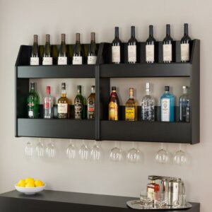 Proudly display your wine or liquor collection with these two rack. The unique wall-mounted system has a compact design to conserve space in your bar, living room, kitchen, or dining area. Slide your stemmed wine glasses into the hidden channel underneath to store both bottles and glasses in one convenient location. Solid construction and available in a variety of finishes to complement any existing decor. Mount individually or as a pair to increase your storage space.