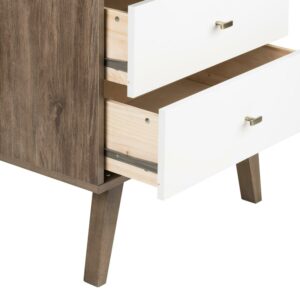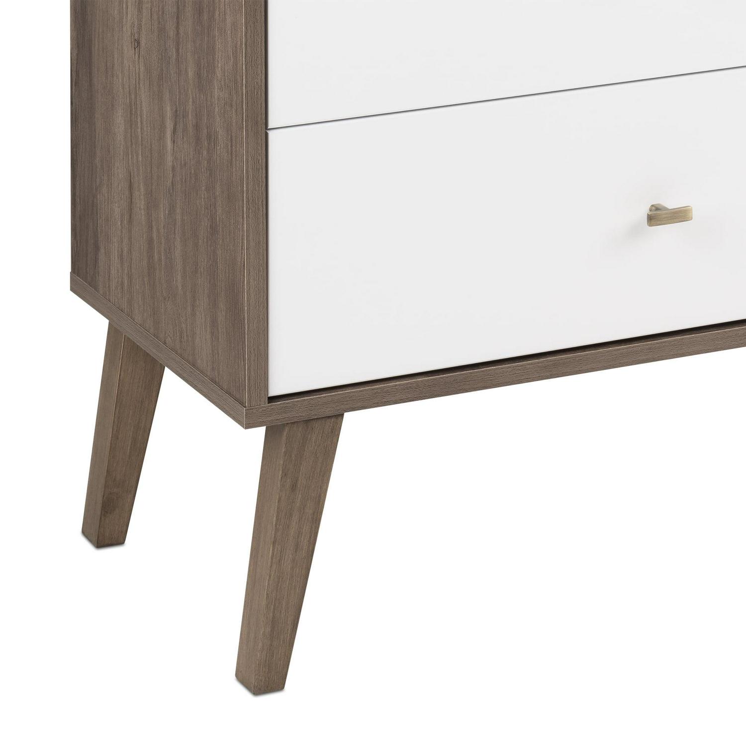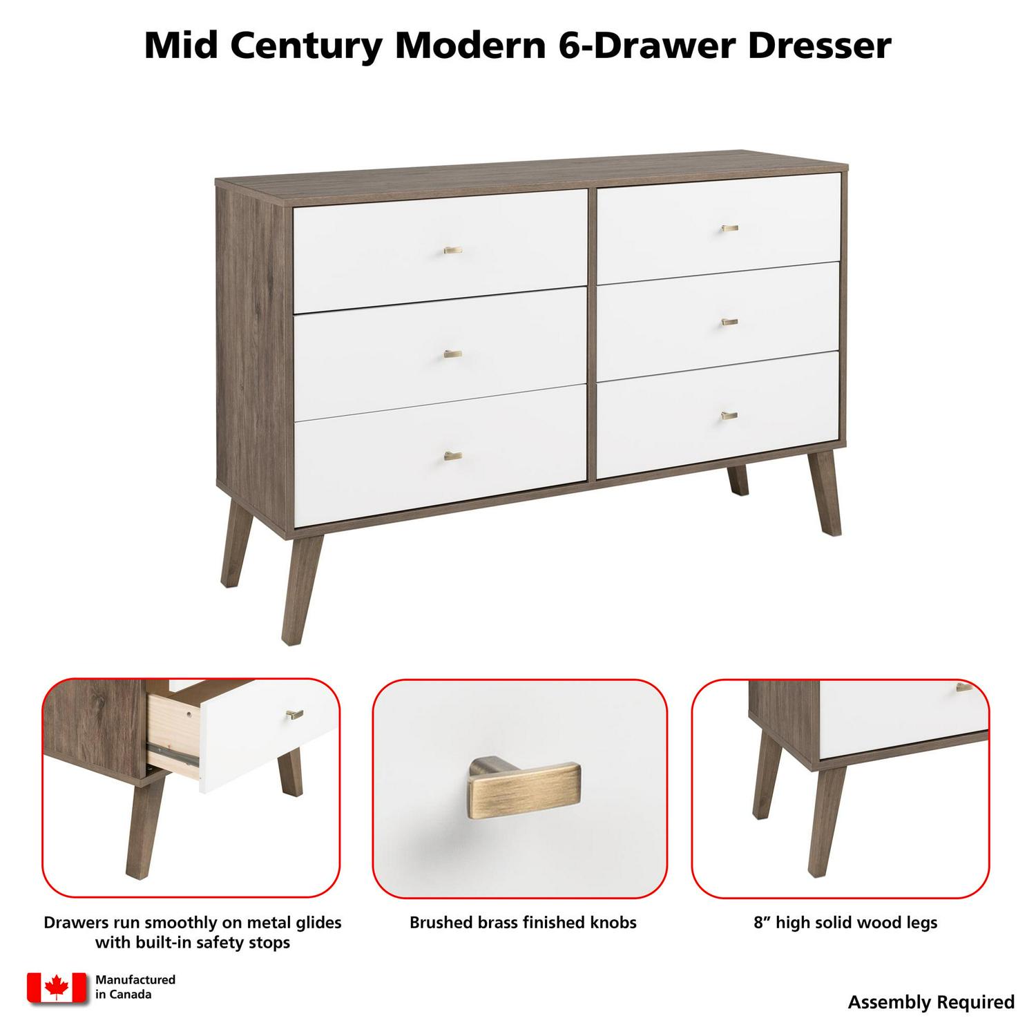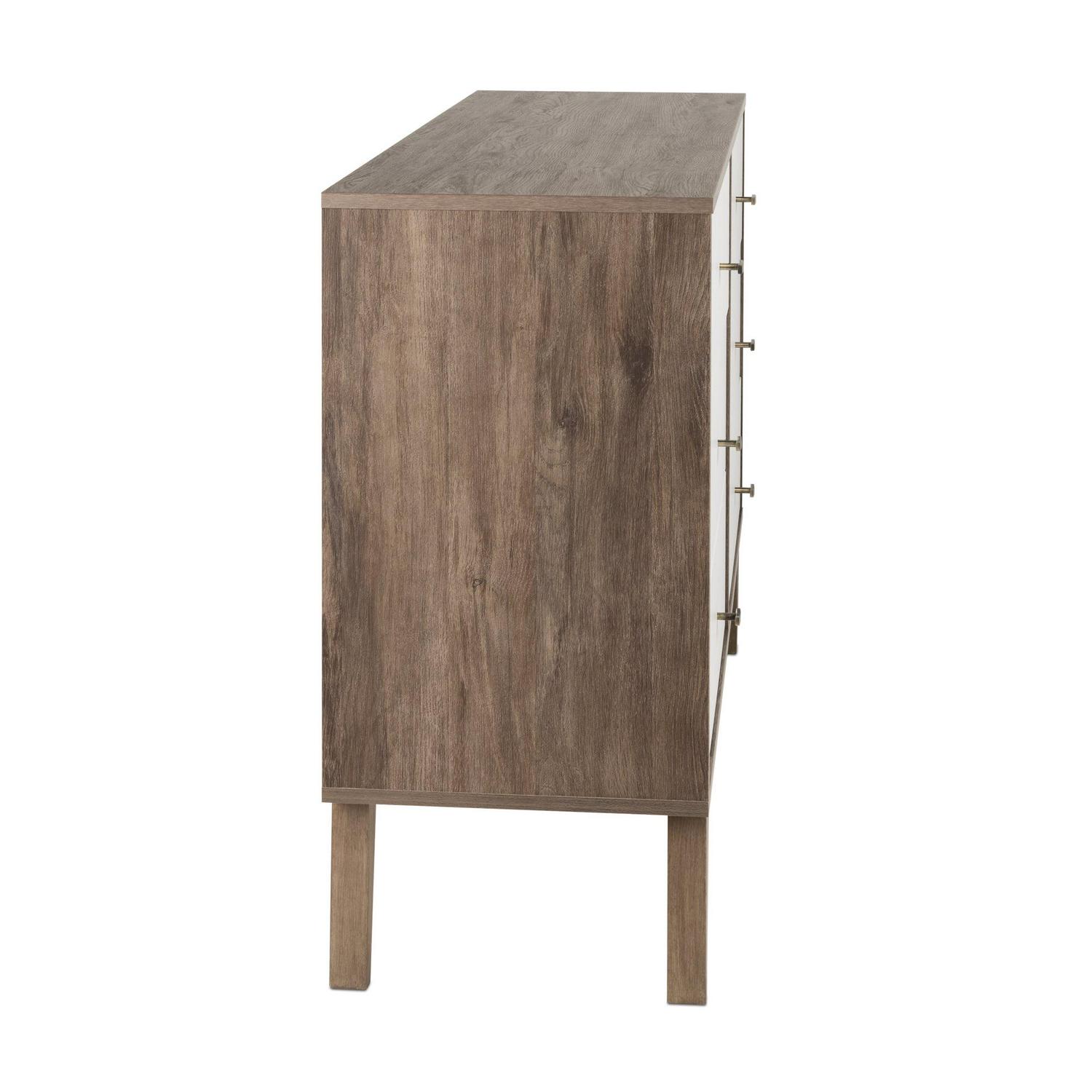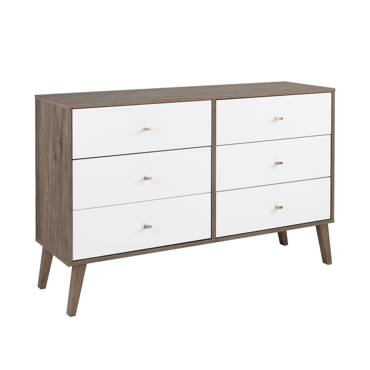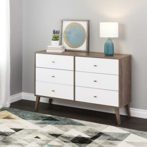 Bring a mid-century design to your clothing organization with the Prepac Milo 6 Drawer Dresser. This retro-inspired dresser features a brown and white laminate finish with tapered solid wood legs and inset drawers, adding a chic and clean accent to your bedroom layout. Featuring two columns, six total sizable storage drawers for clothes run on smooth metal glides with built-in safety stops, keeping each individual drawer stable and secure. This functional multi-drawer organizer is complete with brushed brass-finished knobs, adding to the mid-century appeal and easy access to clothing and other personal belongings. This fashionable storage dresser is a space-saving clothes organizer for bedrooms, but it also makes for an excellent storage cabinet in your walk-in closet, living room, or even as an accent table in the entryway. Thanks to the wide and flat surface area, this double-column drawer dresser can also act as TV stand or as a display for small lamps, electronics, picture frames, and more. Made from a non-toxic, CARB-2 compliant laminated composite wood with a sturdy back panel, this dresser will reliably protect your clothing. Measuring 16″ D x 52.50″ W x 33″ H with each deep drawer measuring 12.75″ D x 23.25″ W x 5″ H, this horizontal double drawer dresser is a must-have piece of bedroom furniture. Style this dresser on its own as a mid-century focal point, or combine it with any of the products in the Milo collection for a timeless bedroom furniture set.