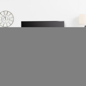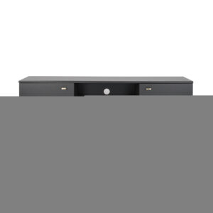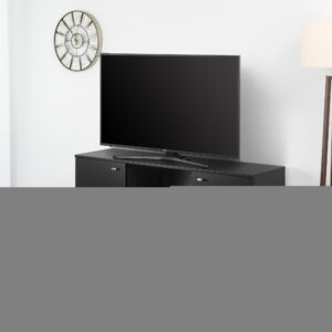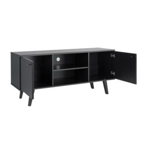 The Prepac Milo Mid Century Modern TV Console for TVs Up To 55″, Black is a modern take on a retro style. The console’s mid-century modern design and functionality make it the perfect fit for all entertainment spaces. Its sleek design offers space for all of your entertainment storage needs. Place TV’s up to 55 in. on top of the console, and store media accessories below in the three compartments. Place books, games and DVDs behind the two large doors and use the middle compartment with an adjustable shelf to place cable boxes and gaming consoles. Keep wires neatly organized and concealed with the cut-out in the middle compartment. Tapered solid wood legs ensure durability and the brushed brass finished knobs deliver a vintage look. Clean lines add to the retro-chic design of this functional and stylish console.