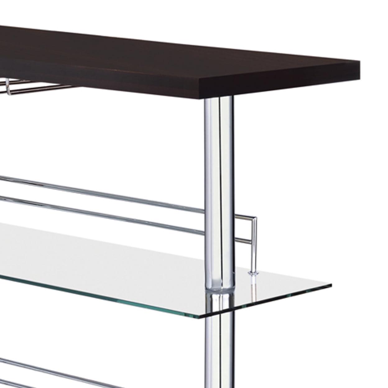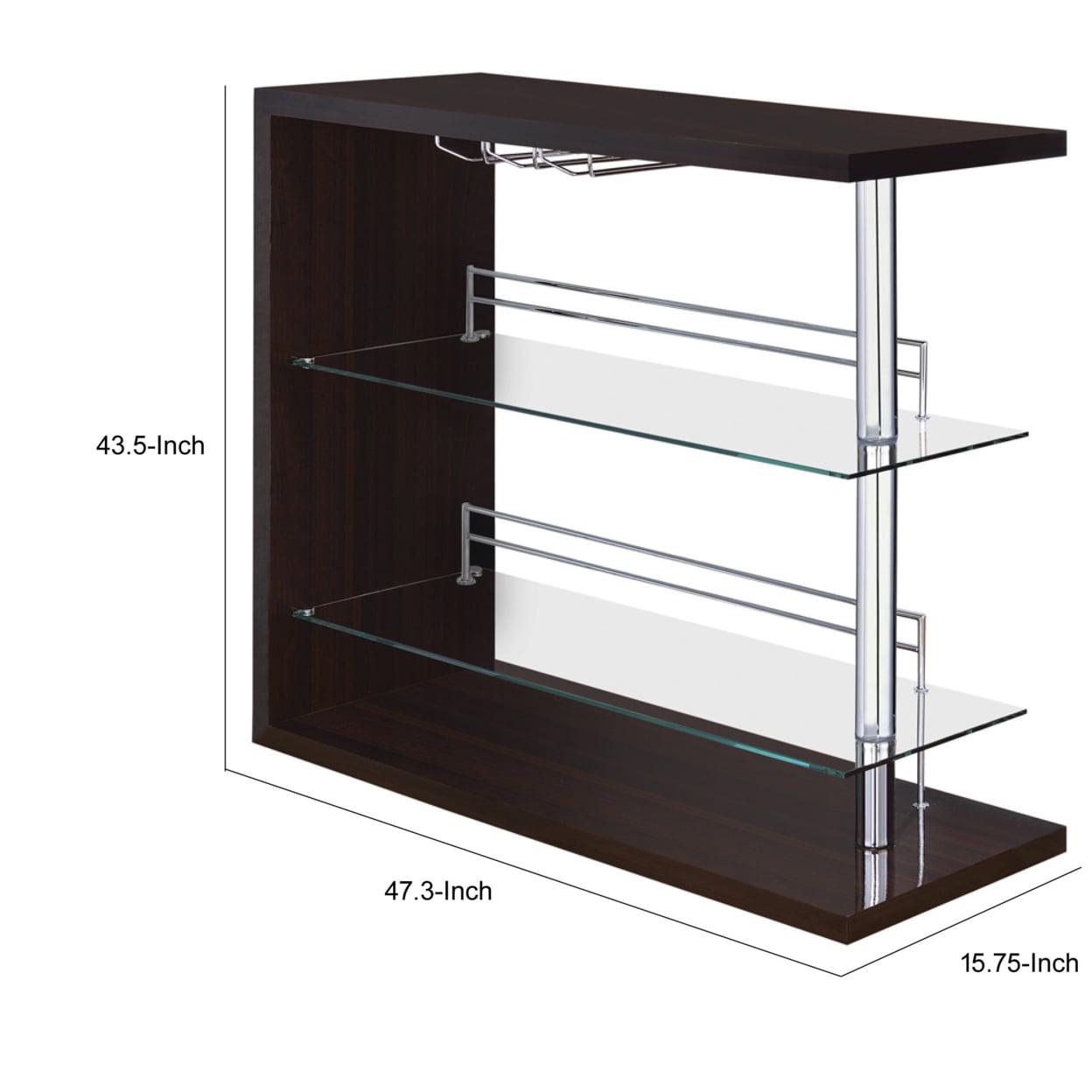 Modish Rectangular Bar Unit with 2 Shelves and Wine Holder, Brown- Saltoro Sherpi Entertain your friends in total style with this sleek contemporary bar unit. This piece features 2 glass storage shelves and a wine glass holder to store all your drink-making needs. Finished in a high gloss and detailed with chrome accents, this is a sophisticated looking piece.