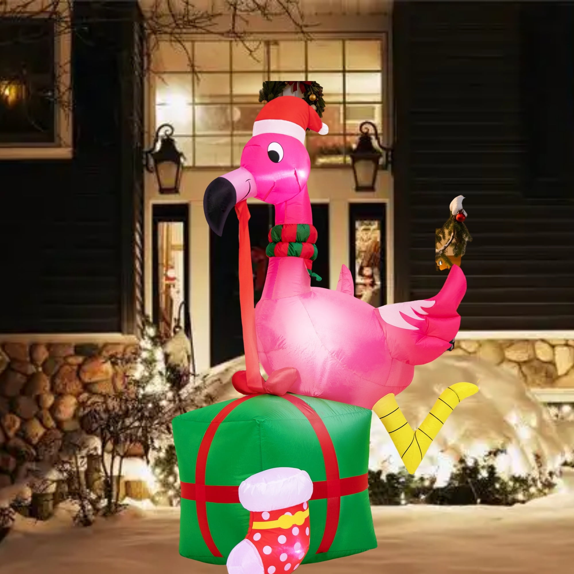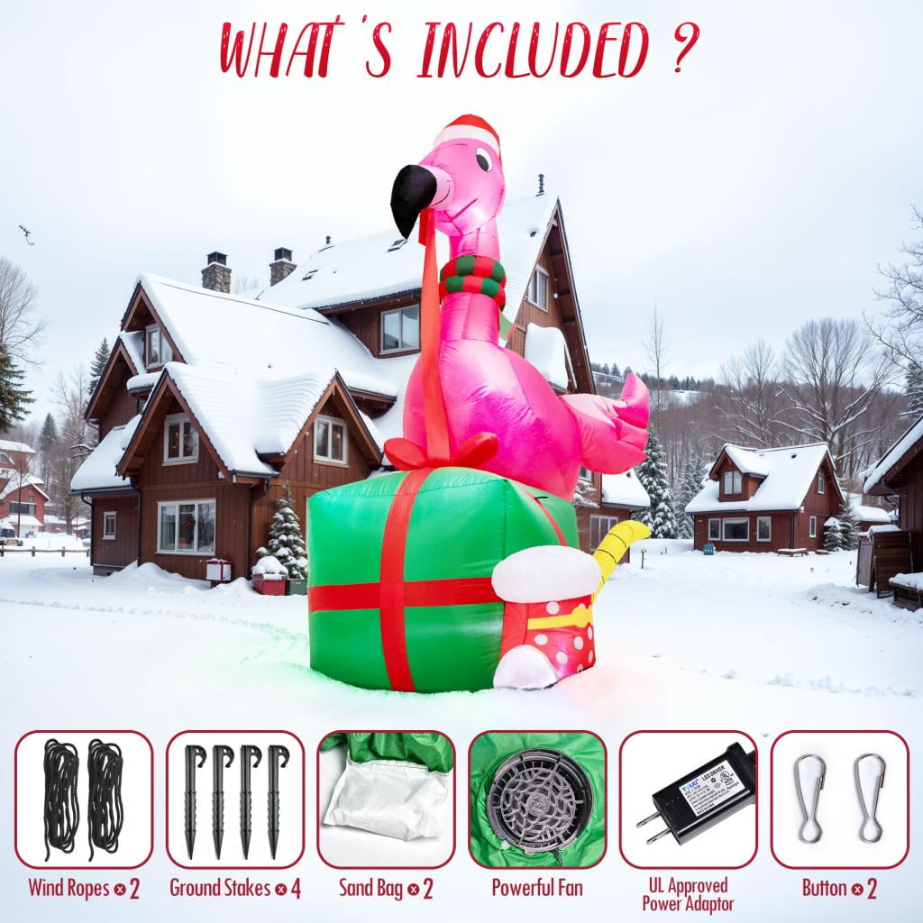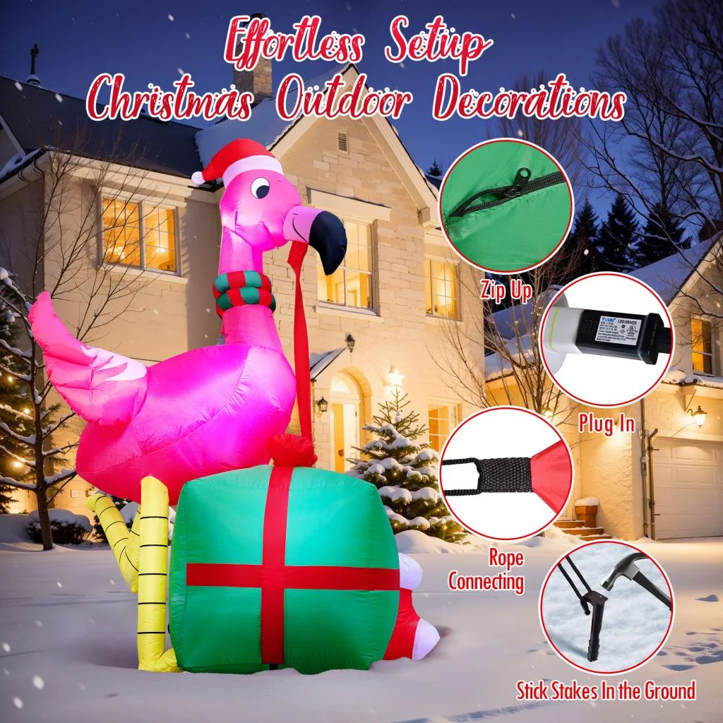 Features: Impressive Size: 6 ft tall inflatable flamingo for eye-catching outdoor Christmas decor Easy Setup & Storage: Hassle-free installation and quick inflation for instant holiday charm Tropical Elegance: Unique design with a cute flamingo holding a gift box and bright LED lights for a festive touch Versatile Decor: Suitable for both indoor and outdoor use, enhancing your entire home’s Holiday spirit Weatherproof Durability: Constructed from durable, rip-resistant, and waterproof materials, ensuring it lasts season after season, even in windy conditions
