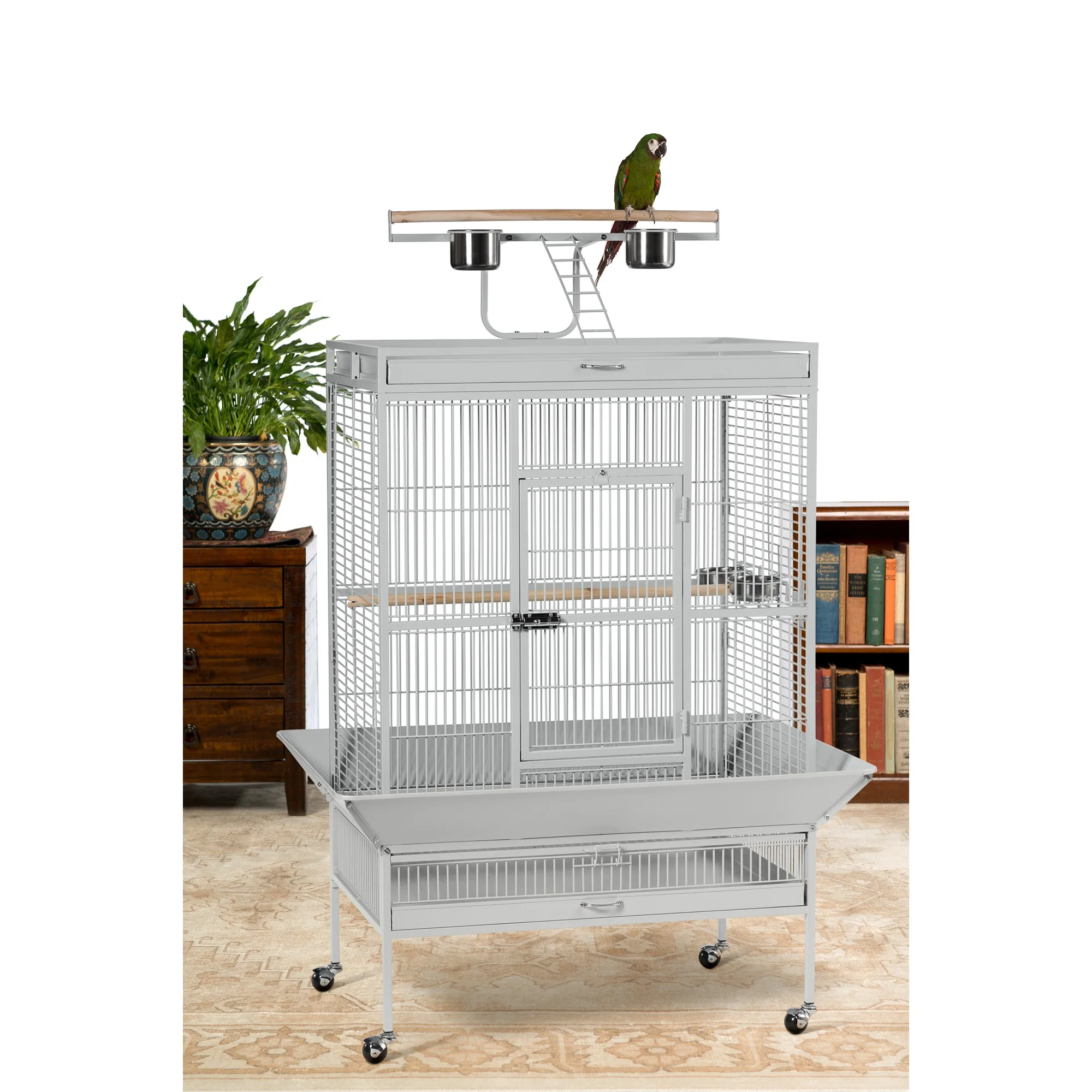 Prevue Pet Products powder-coated steel construction Select Bird Cage in Pewter 3154W offers quality craftsmanship at an affordable cost. Powder-coated steel construction with a cagetopplaystandto keep your bird entertained and content, the heavy-duty push buttonlock keeps your bird securely inside its cage when playtime is over. This select bird cage also includes four stainless steel cups, two wood perches and a casteredstand for portability. Both tray and bottom grille are removable for ease of cleaning while the rounded corner seed guards control mess around the bird cage. Our powder-coated steel construction Select bird cagein Pewter measures 36’’ long, 24’’ wide and 67’’ high with ¾’’ wire spacing.