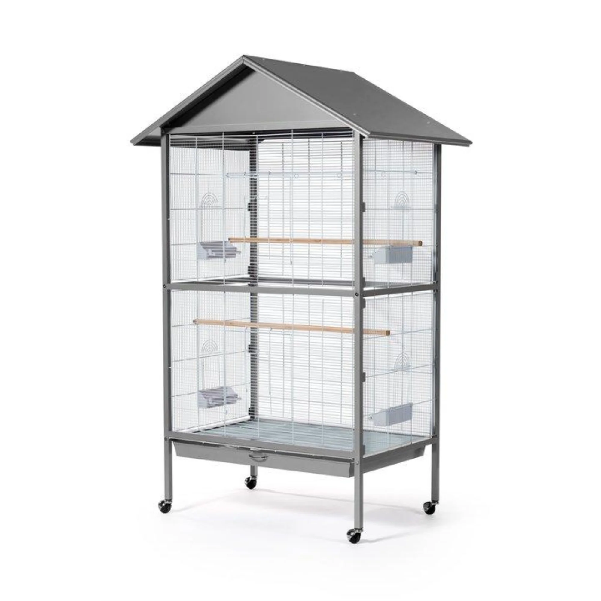 Prevue Pet Products Charming Aviary in Metal Gray F036 Comes with a toy bar for easy toy hanging and two wooden perches Easy to clean Ideal for small to Medium size birds Attractive house-style roof provides shade and a secure spot for hiding 35 3/8″L x 23 5/8″W x 68 5/8″H. Roof overhang 42 3/8″L x 29 3/4″W