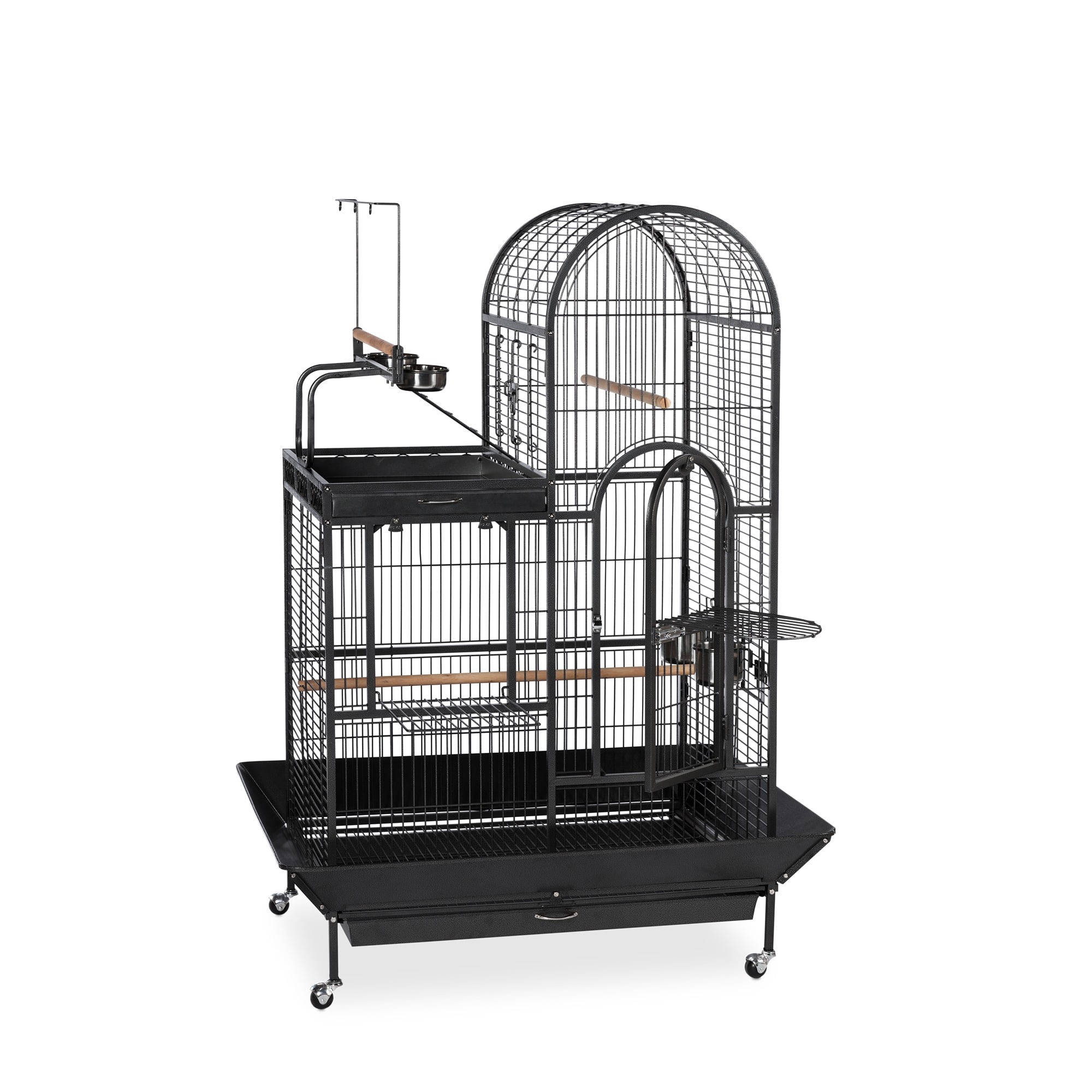 The Deluxe Parrot Cage with Playtop Area is so much more than your run-of-the-mill birdcage. The dometop cage, which has a black powder-coated hammertone finish, features a two-in-one front door which opens down as a landing-style door or swings out for full access to the entire cage. Also, a triple-toy hook design provides plenty of space for hanging toys or treats. Your parakeet or canary can move easily from one area to the other thanks to the slide-out door between the two areas. Three stainless steel cups store water and food. The pull-out bottom grille and tray, along with the rounded-corner seed guard, contain the mess to make cleaning easy. Dimensions: 36L x 27.5W x 61H inches with 0.875-inch spacing.