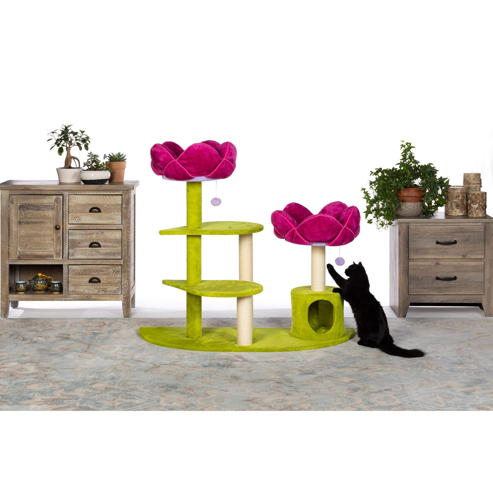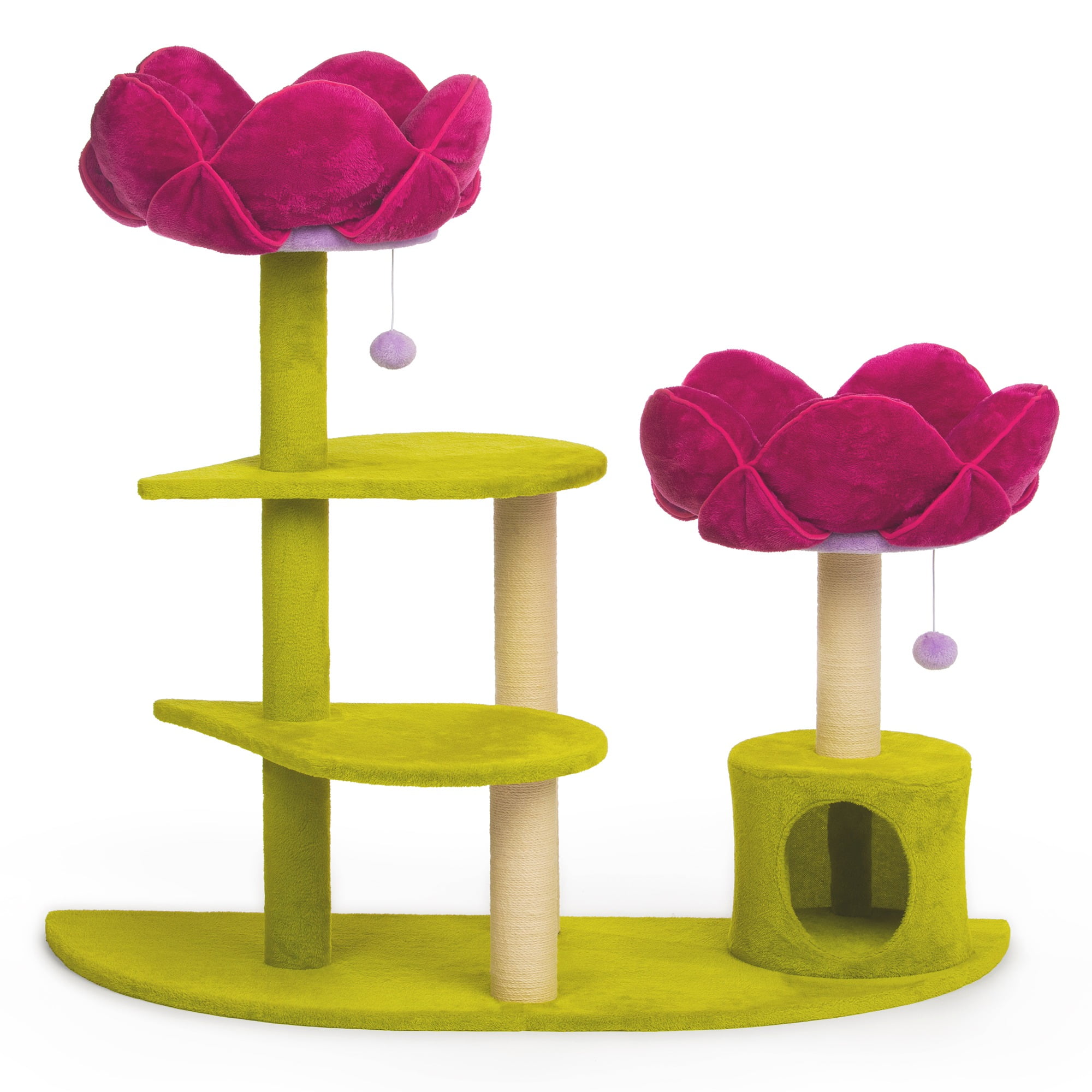 Prevue Pet Products Flower Garden 7324 combines super soft, plush fabrics with durable jute to provide the perfect place for your cat to sleep, lounge and play! Watch as kitty engages in energetic activity playing with the plush dangling swat toys, scratching the sisal covered posts or pouncing and jumping from the petal platforms. Three natural, jute rope scratching posts offer an appealing texture to cats, curbing inappropriate scratching behaviors while encouraging exercise as your cat scratches and stretches, toning muscles, grooming nails and strengthening paws. Two incredibly plush flower beds, encompassed in velvety soft pillows, surround your felines in total comfort letting your cat or kitten feel more secure and less vulnerable to sneak attacks while a lower level cozy hideaway helps them to relax by avoiding social stress. Our whimsical Flower Garden design in bold shades of fuchsia and lime green is a multi-level, multi-purpose cat tower that is sure to add a delightful presence to any room! Prevue Pet Products Flower Garden 7324 measures 48 7/8 Long, 21 1/4 Wide, and 44 1/2 High.