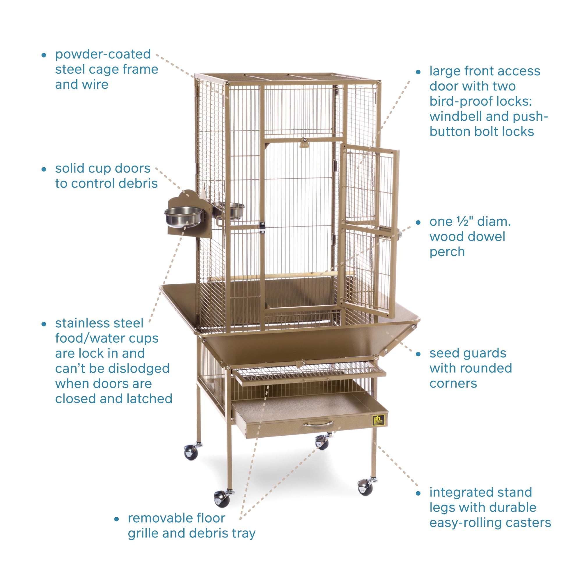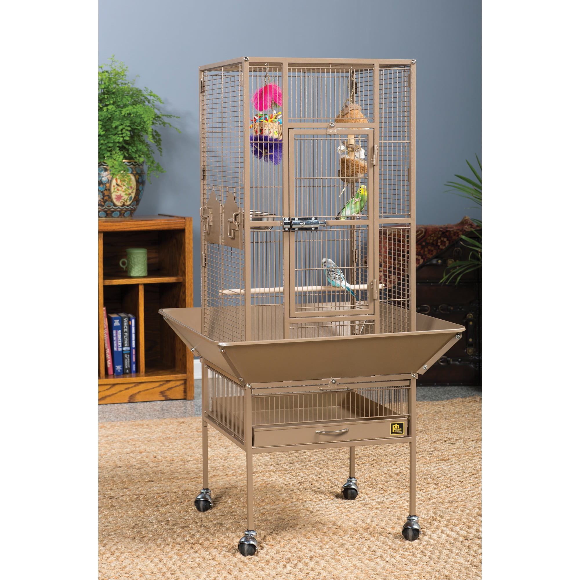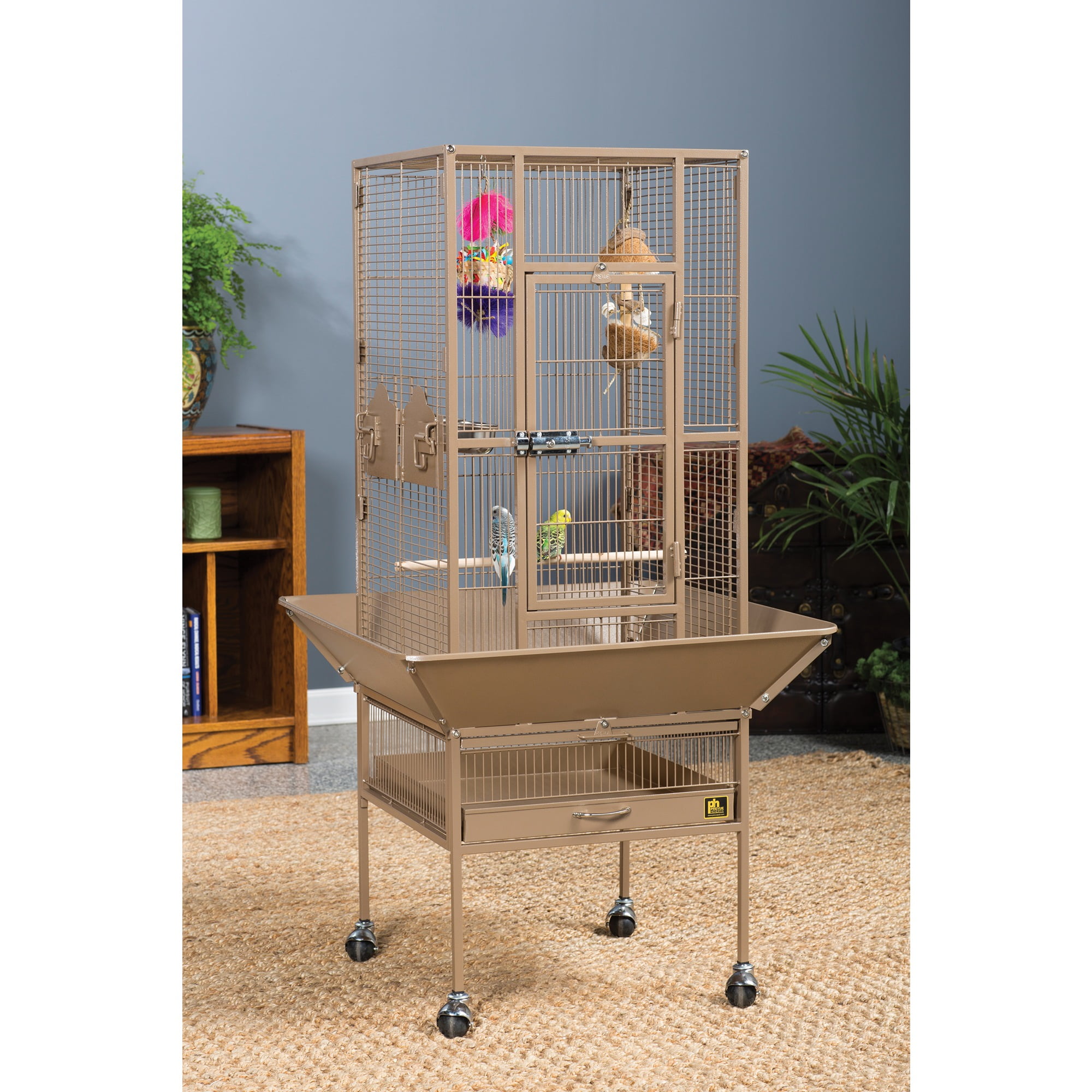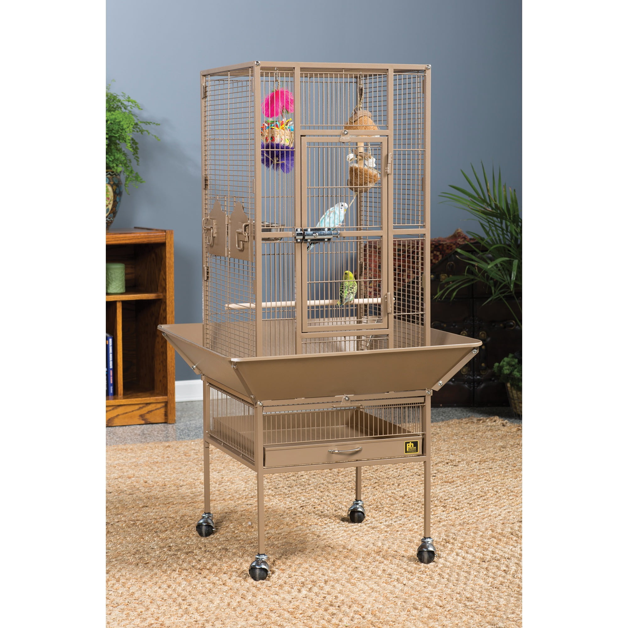 Our popular powder-coated steel construction cage re-engineered for small birds Large hinged front access door with dual locks Solid-panel cup doors & wide seed guard to control debris Pull-out grille and debris tray for easy cleaning Cage stand base with easy-rolling casters Ideal for parakeets, canaries and other small to medium birds Model NO : 3351COCO Park Plaza Bird Cage Coco