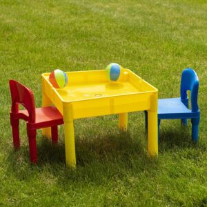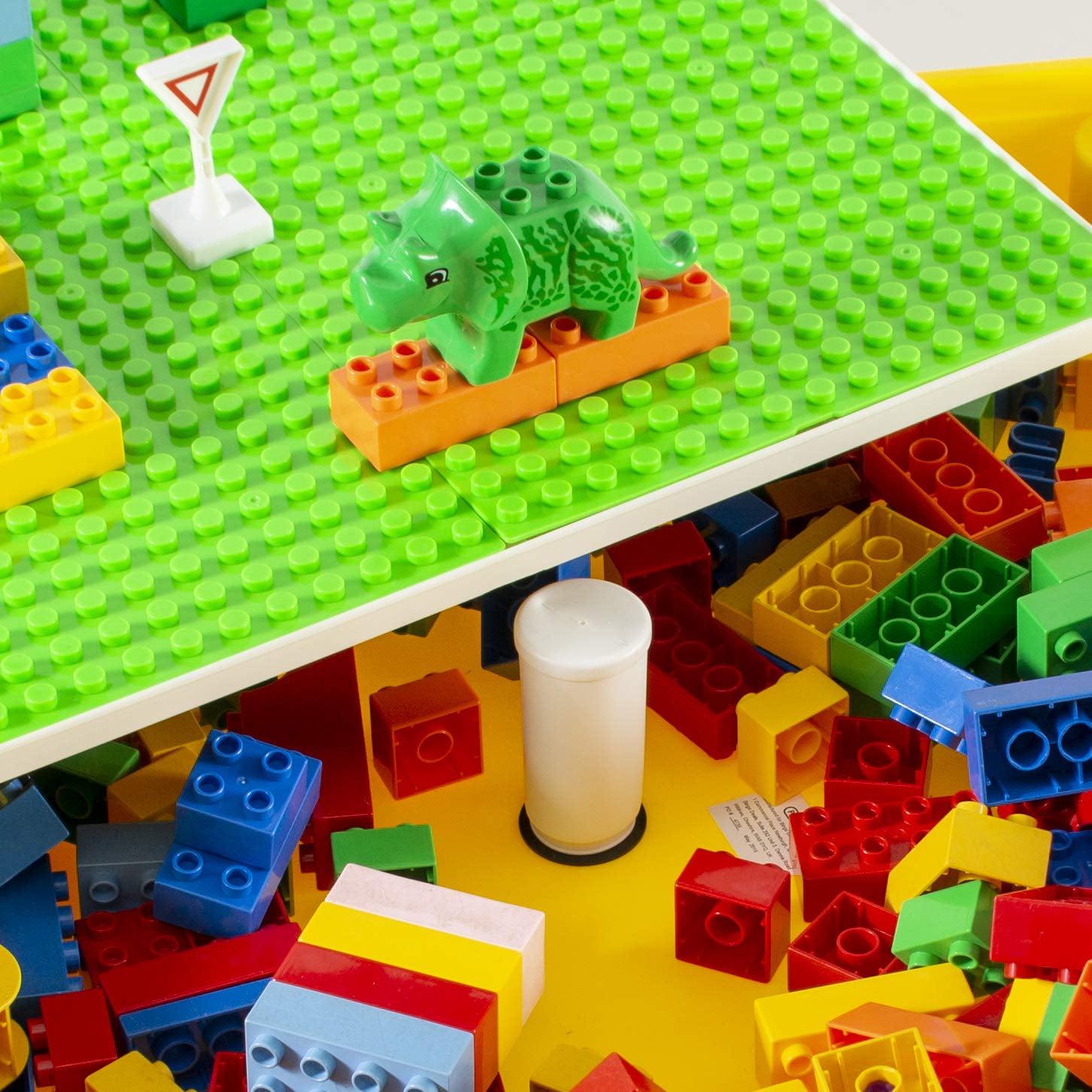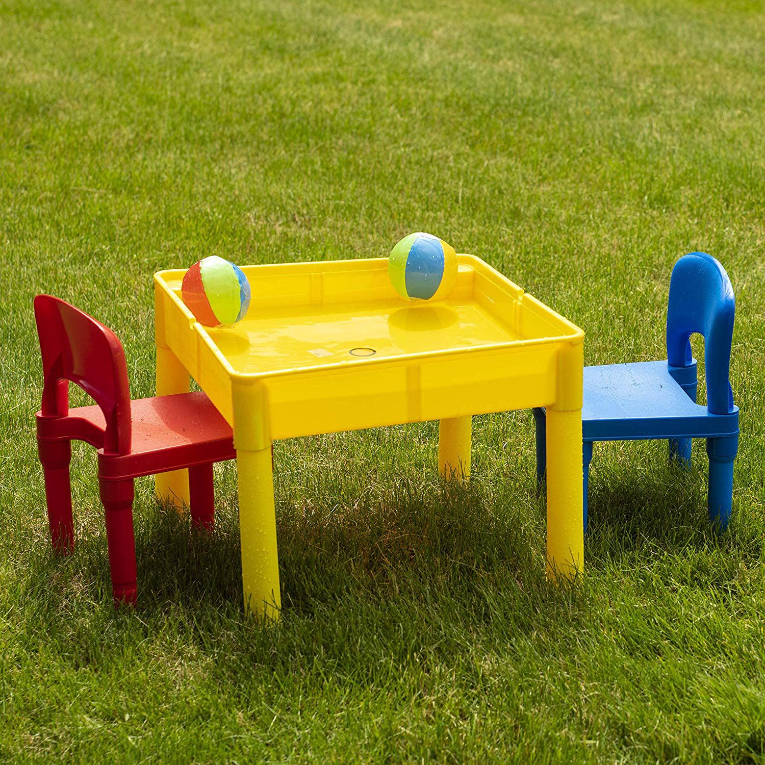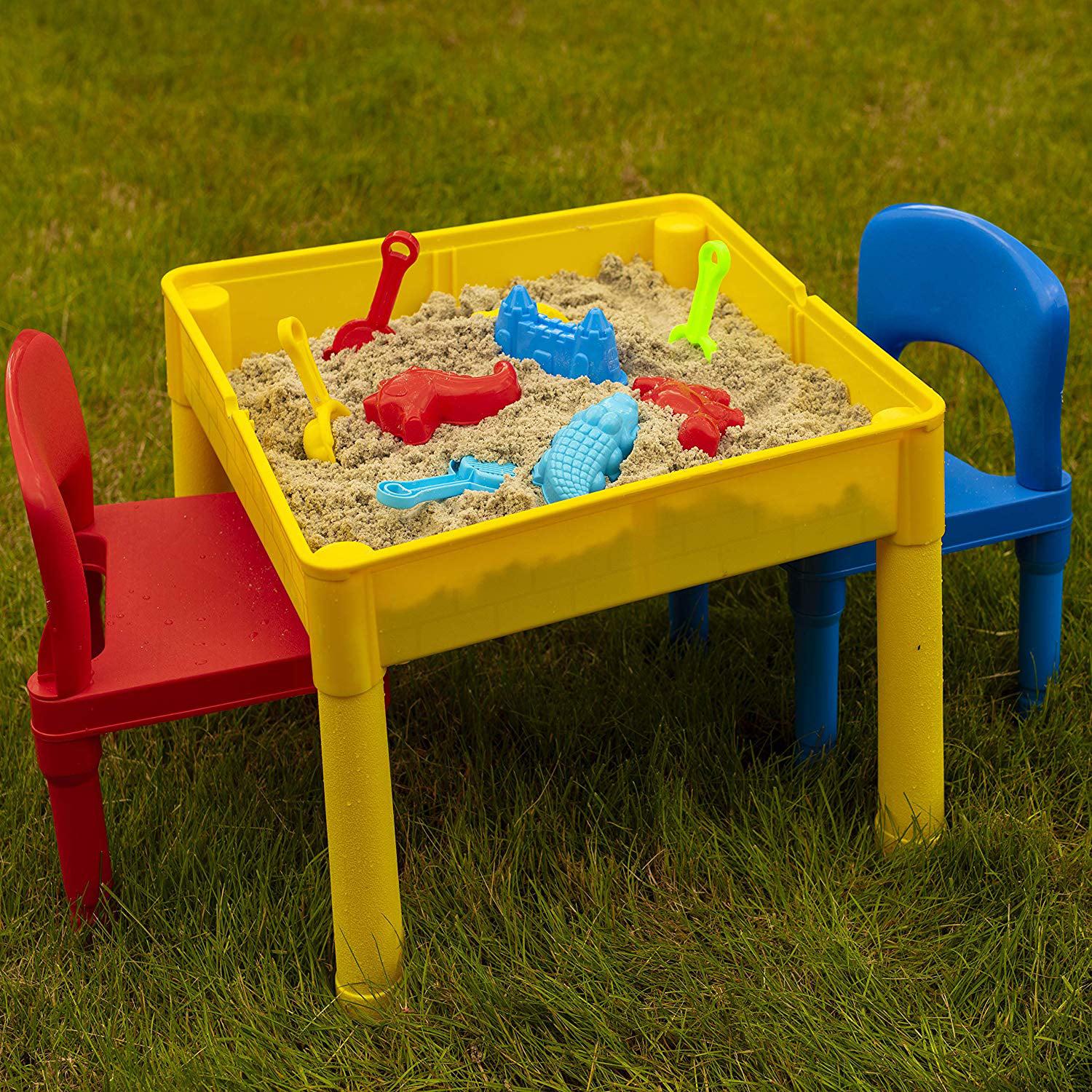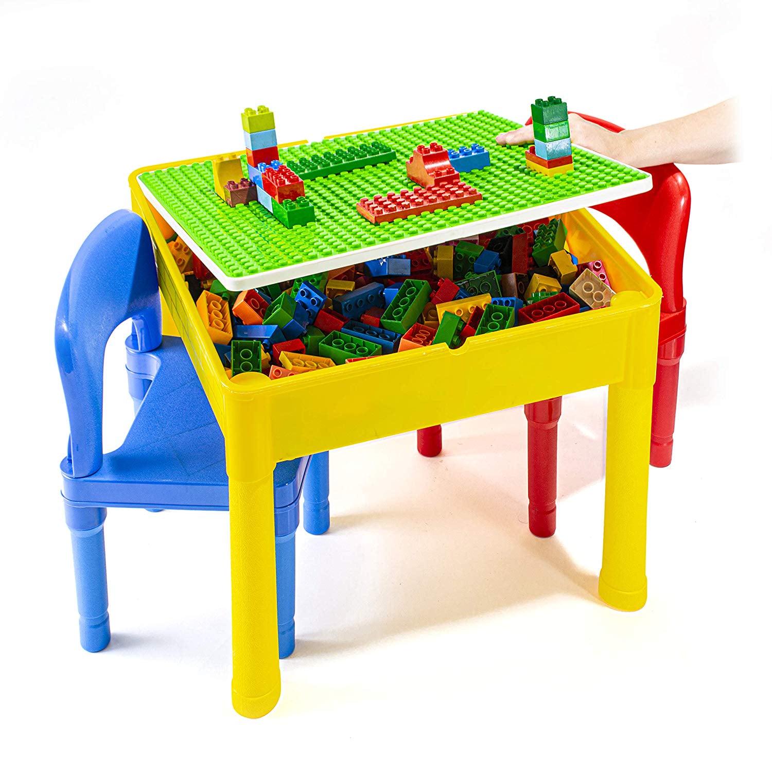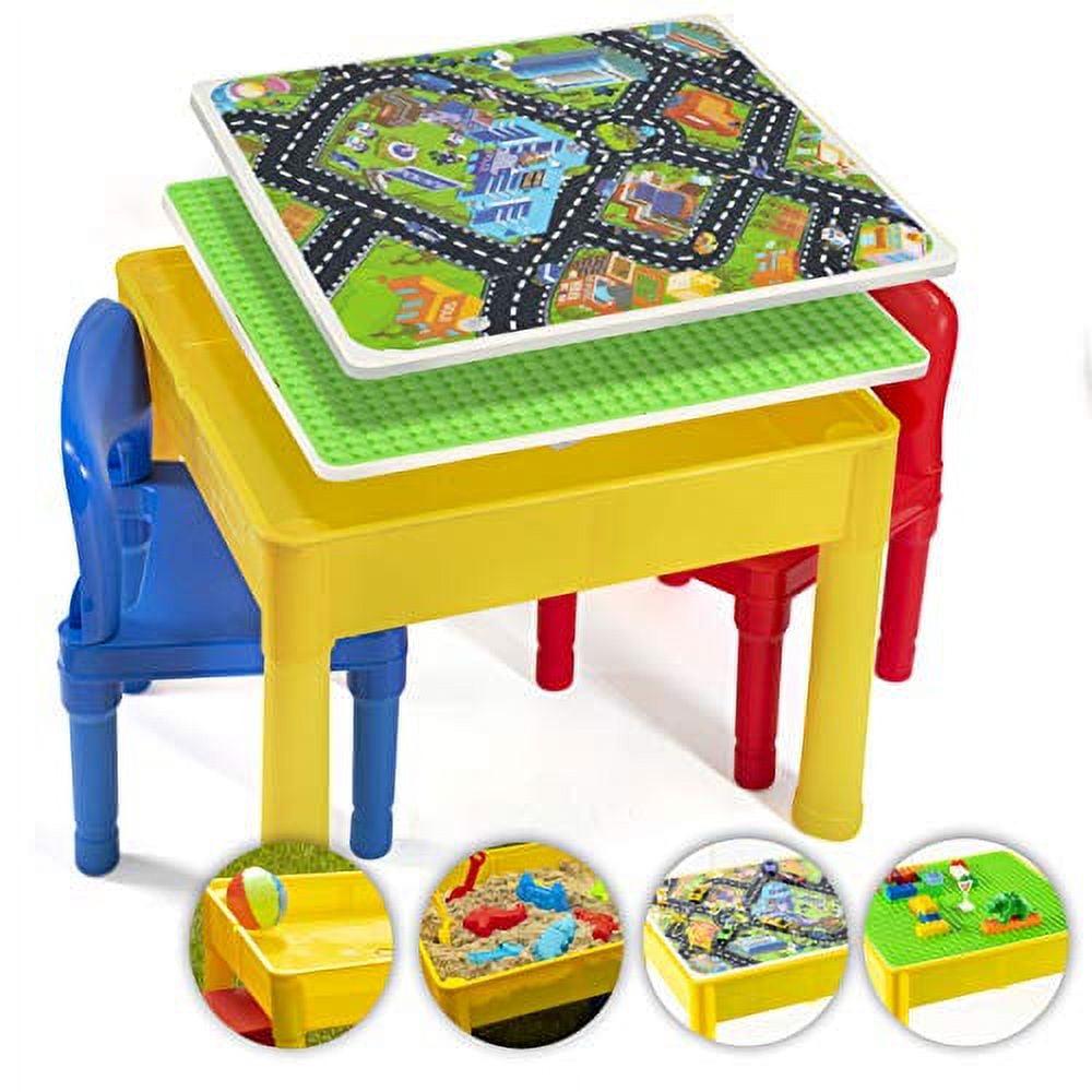 Prextex adorable little activity play craft table set includes 2 chairs, storage table with double sided table top double sided table top. It includes giant brick building board compatible with bricks of all major brands and city action road map for hours of play interior of table. It can be used for sand and water play indoor or outdoor with easy drain plug when all set and done store your cars bricks and water toys in the interior of the table. Product dimension: table 20 x 20 x 16 . Chairs 9 off the floor. (bricks, cars, water toys not included)activity play table set with 2 chairs- 5 in 1 store and play craft, bricks, water & car roads.