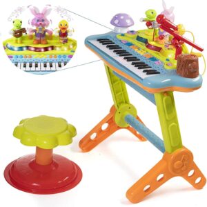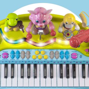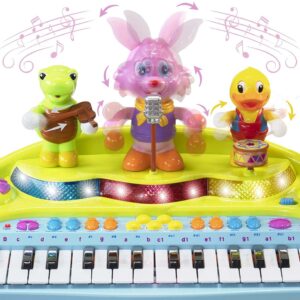 Prextex 37-key piano for kids with working microphone, stool features a flashing and dancing animals! Adjustable volume lets you turn the party up or down. Different Sounds Includes: Guitar, Organ, Violin, Trumpet, Flute, Harp, Music box, Rock, Slow rock, Twist, Disco, March, Waltz, Swing, Tango. Your little one can explore a variety of sounds along. 22 practice songs feature light up keys for your child to follow, and even record their own song! Uniquely designed with a singing rabbit, drummer duck, and turtle violin player all dancing and clapping while your little one plays the piano. This Toy Piano Keyboard for Kids with Real Working Microphone will last for years and will make the best gift your little one will ever get!