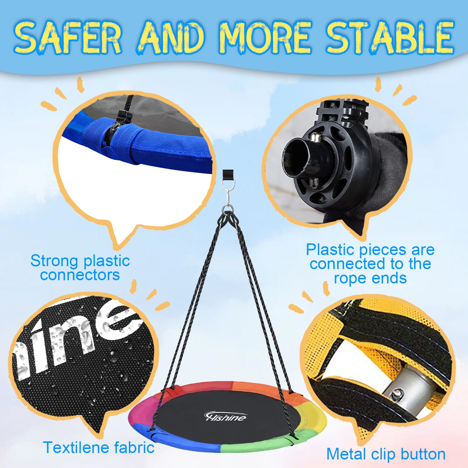 700lbs Weight Capacity- The heavy-duty swing seat and circular steel frame could hold up to 700lbs, strong enough for 3 kids swinging together. Have fun together with your friends. The nest swing is fun for all ages. Your whole family would love it! Easy Installation- The saucer tree swing is easy to set up. Follow the detailed instructions we provide, the swing will be fully assembled in 5 minutes. Please make sure all parts are properly assembled and use it under adult supervision. Strong Integrated connector- Strong integrated connectors connect ropes with frames, better than traditional screw assembly ways where screws are easily rusted and fall out. It shortens the installation steps, reduces the assembly difficulty, prolongs the swing use time, makes kids safer and away from danger. Durable Fabric Seat- We use tightly- woven, well-seamed Textilene fabric to make the round mat swing seat. The swing mat is much thicker and stronger than normal oxford fabric, won’t fade, break, tear apart or sag down for years. It is also waterproof, UV-resistant, wear-resistant and long-lasting. Adjustable Length & Height- The length of the swing can be adjusted from 44″ to 91″ by ropes and straps. Multistrand ropes are adjustable in length. 12mm multistrand ropes ensure your kids’ safety. Heavy-duty straps also can be adjusted, help to hang your swing on a tree or a swing set. You will find endless fun in your backyard. 3 Hanging Options-360° rotating swivel -Customize your fun with a swivel ring! Hang the spinner swing with a swivel hook to enjoy swinging like a flying saucer. 2 point hanging- swing back and forth to enjoy a wonderful quiet leisure time. 1 point hanging- easily hang the swing on one point to swing freely. Everything Included- Textilene fabric seat 1x | Stainless steel frame parts 4x | Adjustable ropes 2x | Heavy duty hanging straps 2x | Reinforced carabiners 2x | Swivel hook 1x | Instruction mannual 1x | Storage bag 1x