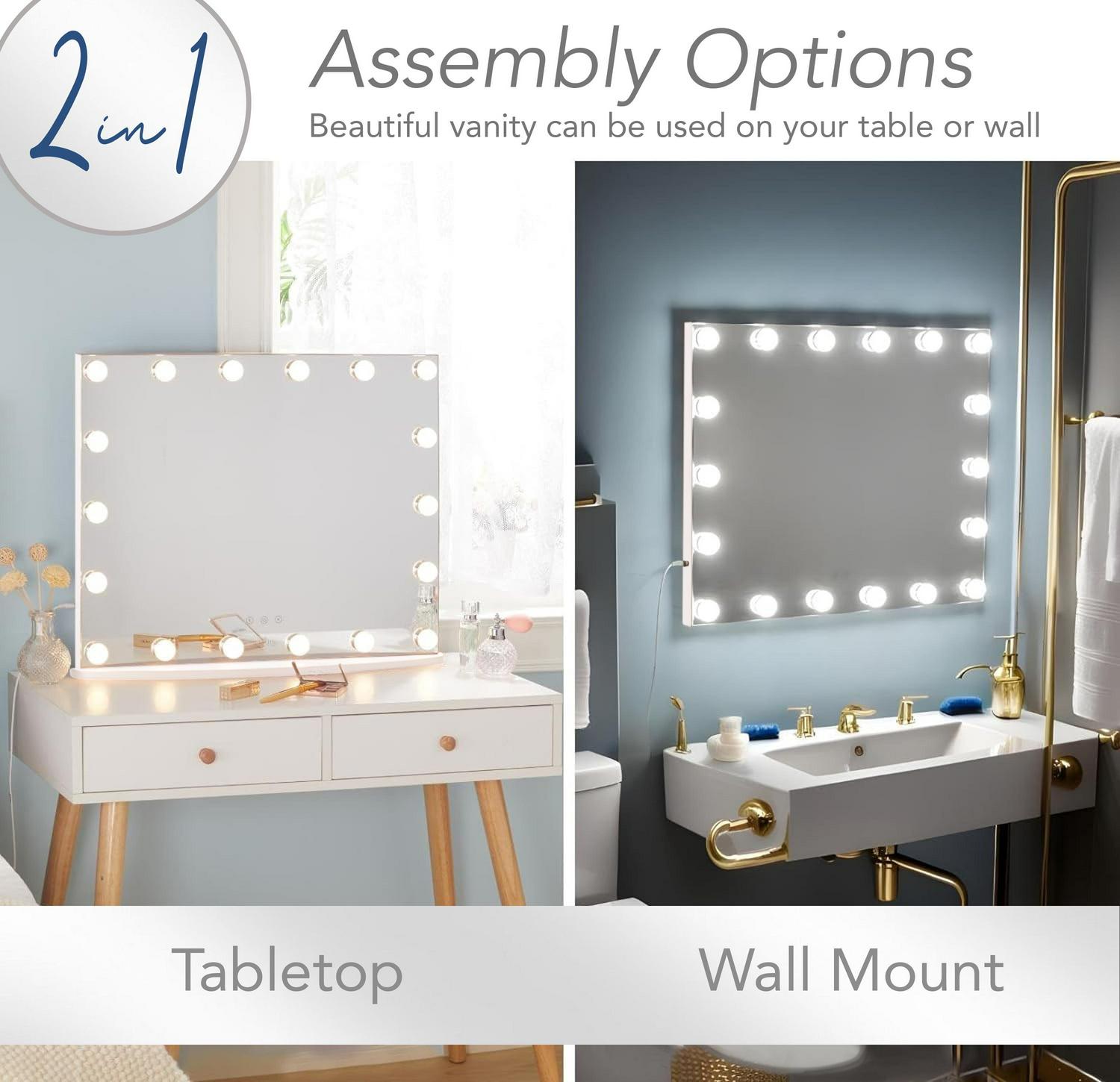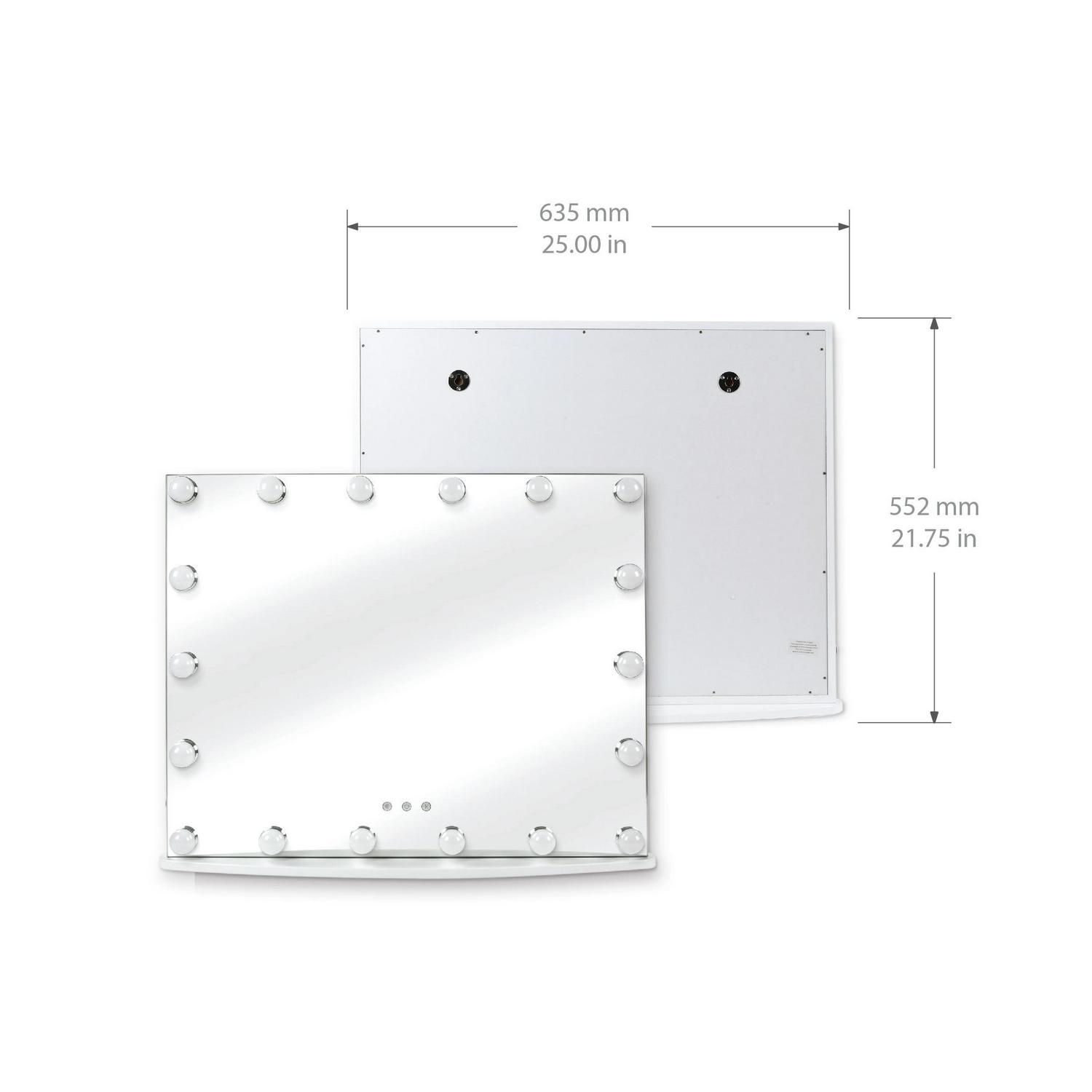 Add a bit of Hollywood glam to your bedroom, dressing room, or bathroom with our functional, stylish LED illuminated vanity mirror. The Hollywood-style makeup mirror features three lighting modes and adjustable brightness settings controlled by Smart Touch buttons located on the front of the mirror. The versatile design allows the mirror to stand on a dresser or vanity table or be hung on a wall. The frameless silhouette, clean white finish, and large size make it a great choice for either classic or contemporary home decor styles.