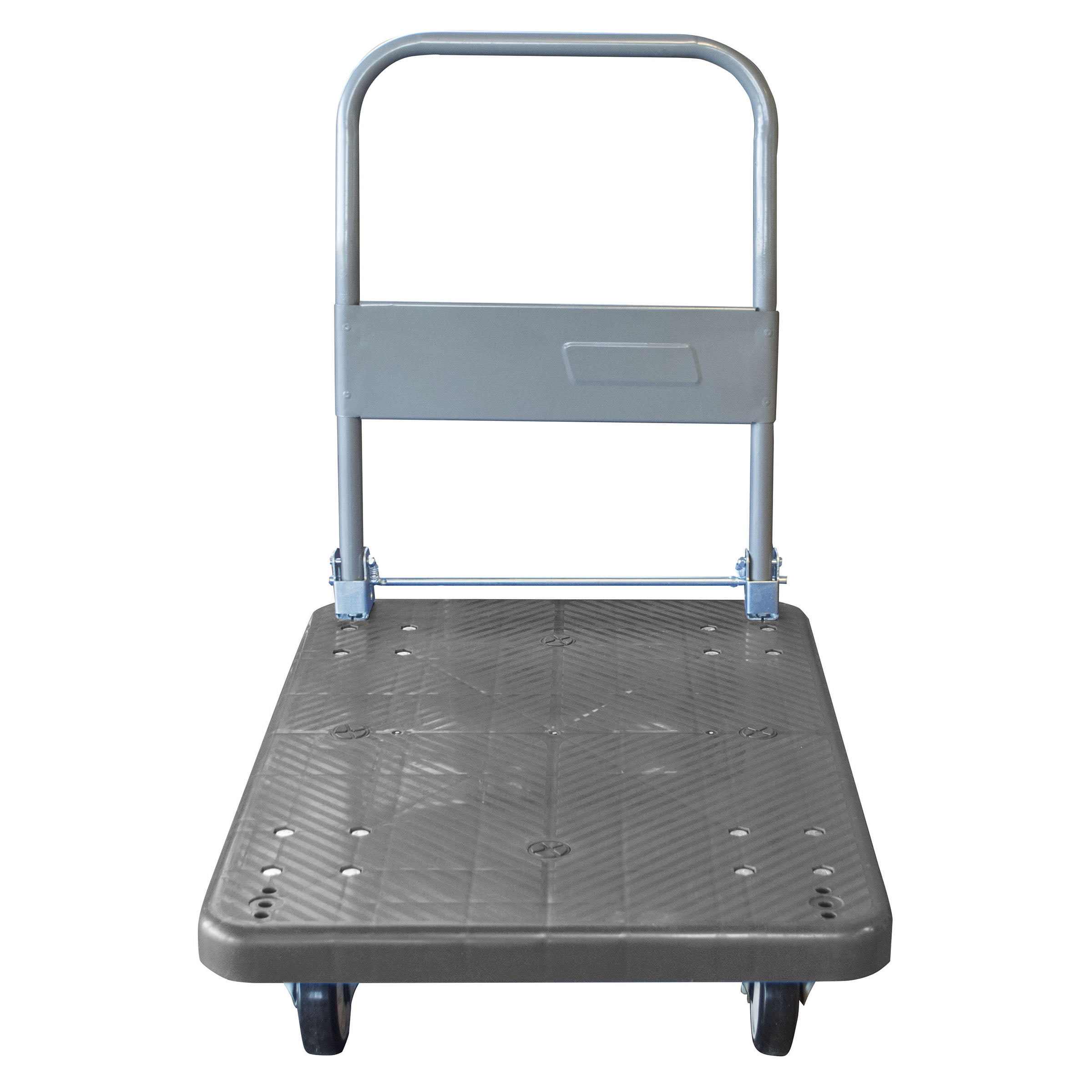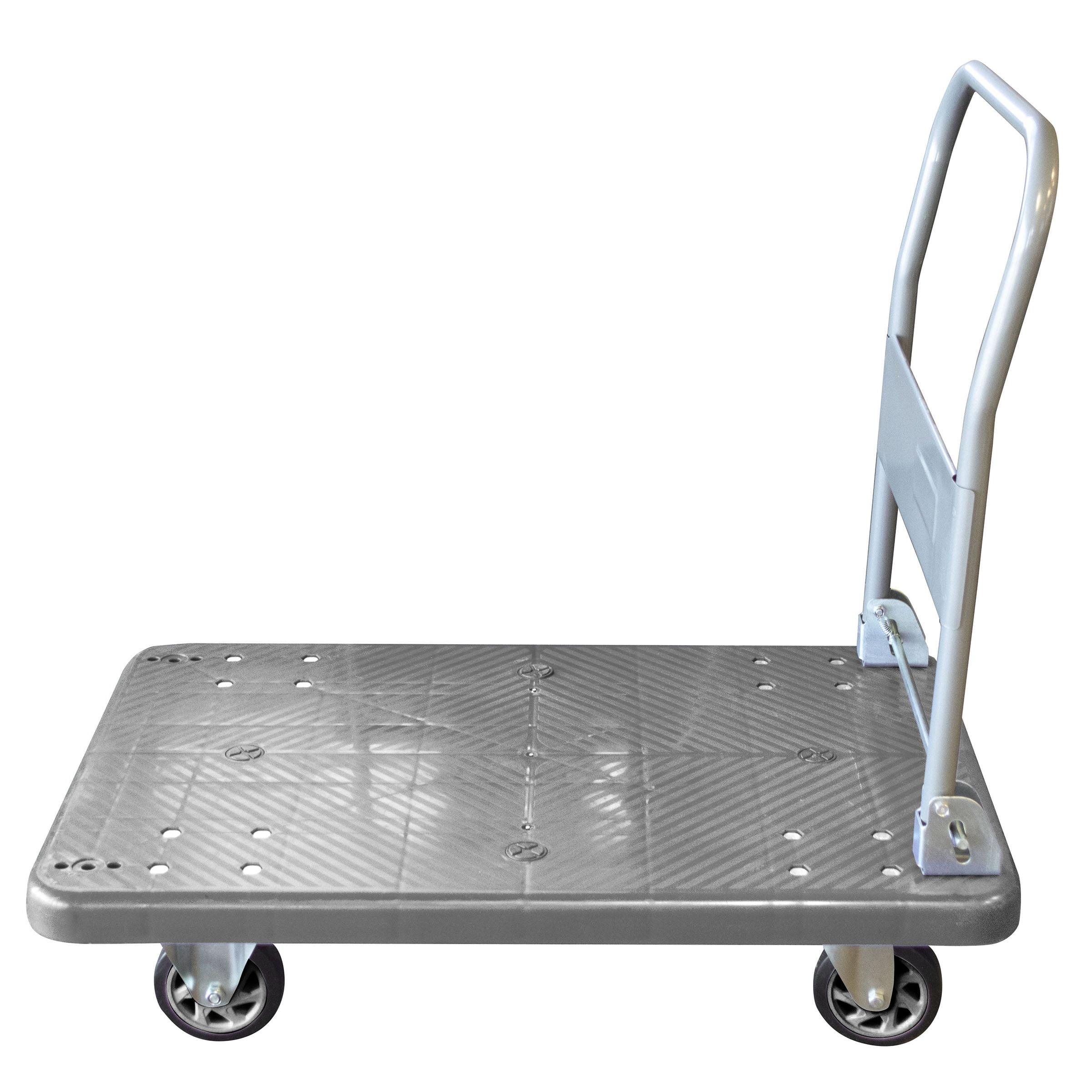 Keep the Pro-Series Folding Platform Truck close at hand to make moving bulky loads easy and safe. With a 660 lbs load capacity, the Folding Platform Dolly will move paper and equipment at the office, boxes and supplies in the warehouse, and purchases from the warehouse club. The Folding Cart handle easily folds flat against the platform, creating a slim profile, just 11.5 inches high, for easy storage. The 36 x 23.75 inch platform surface is constructed of durable PVC, and has a 34.5 inch high steel hand rail. Four heavy-duty 5-inch caster wheels make steering easy and stable. Great for use at the warehouse, office, or around the house Easily and safely move supplies and bulky items Steel hand rail folds down for easy storage, just 11.5 inches high when folded flat Durable 1.25 inch PVC platform measures 36 x 23.75 inch platform hold up to 660 lbs Heavy-duty, non-locking, 5-inch caster wheels make steering smooth and easy Platform stands 6 inches from the ground Overall size: 36 L x 23.75 W x 34.5 T inches when hand rail is raised