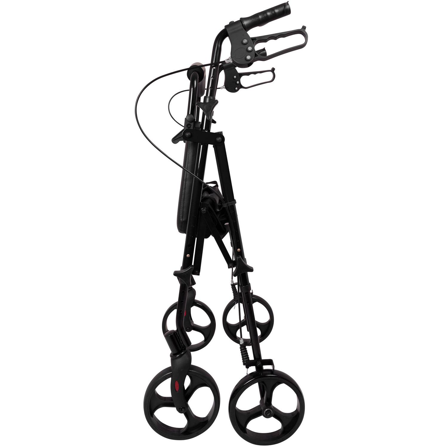 The ProBasics aluminum height adjustable rollator with 8″ wheels allows you to enhance your mobility while also providing you a place to sit down and take a rest. The seat can be adjusted from 18″ to 22″ in 1″ increments to accommodate a wide range of users. Lockable hand brakes and a versatile seat and backrest provide comfort and safety during use. This premium aluminum walker with wheels features 8 inch wheels for maneuverability, height adjustable handles & wheels with brakes, a padded seat and flip-up backrest, and a convenient storage compartment. The ProBasics aluminum height adjustable rollator offers large 8″ wheels to make getting around easier. Walker features lockable hand brakes that offer safety and the padded seat and backrest provide comfort during use. A convenient storage area is located beneath the seat to safely hold personal items. Lightweight and easy to fold design is ideal for travel, storage, or for just going on a drive. Quick tool free assembly, an ideal rollator walker for seniors, handicapped, elderly, disabled, or those recently home from surgery.