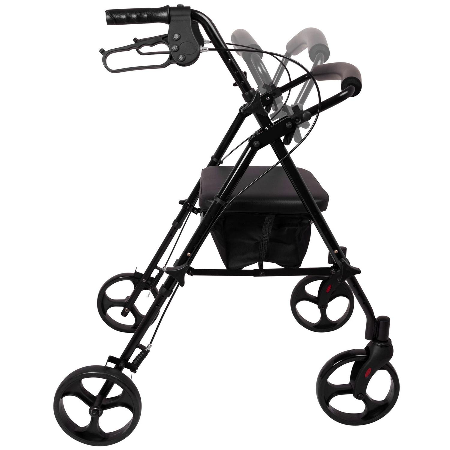 – WALKER WITH SEAT AND WHEELS: The upright walker has a seat with backrest so you’ll always have a place to sit & rest. Adjustable lockable brakes add safety to this walker so it won’t roll when you sit down or stand up. Includes 8-inch premium wheels.