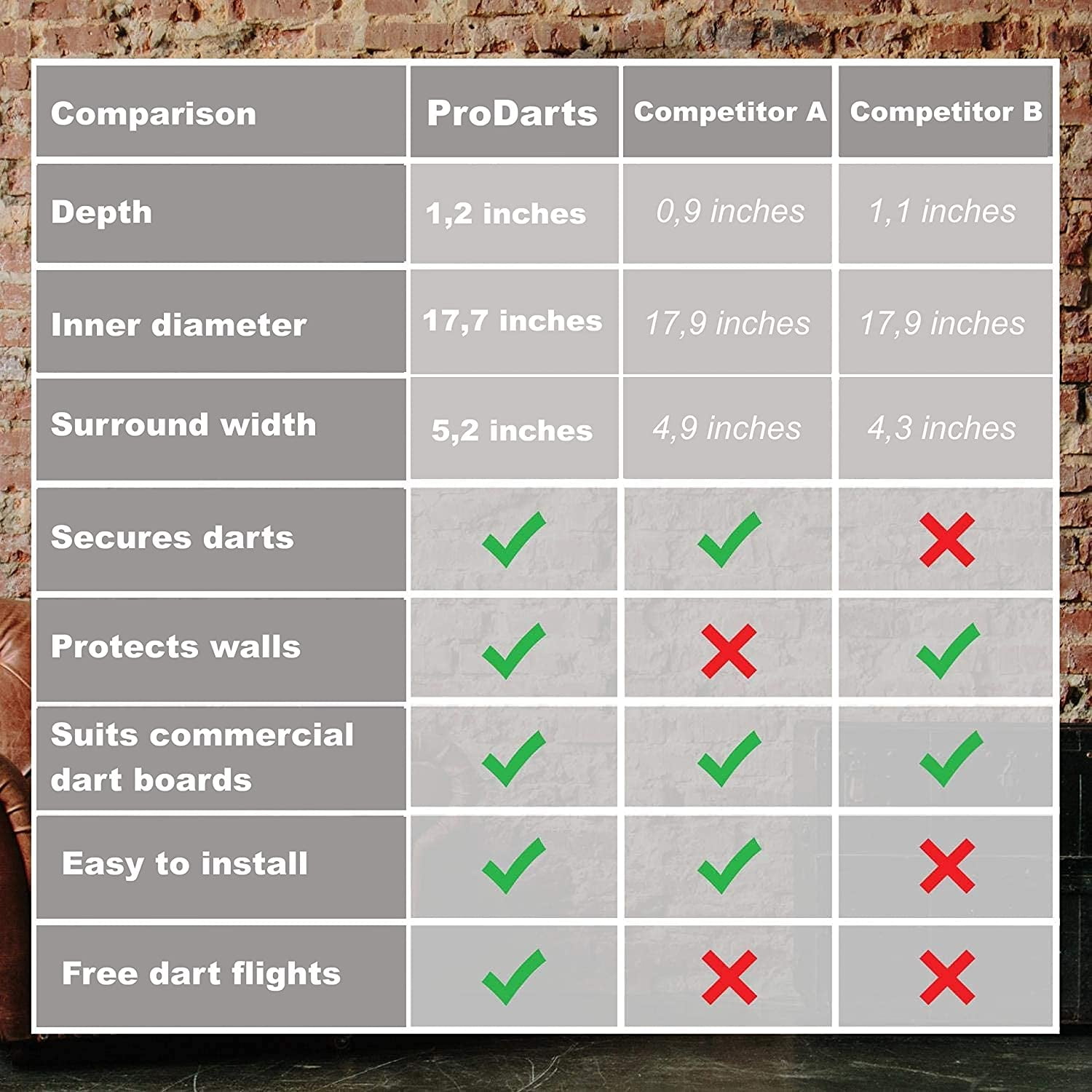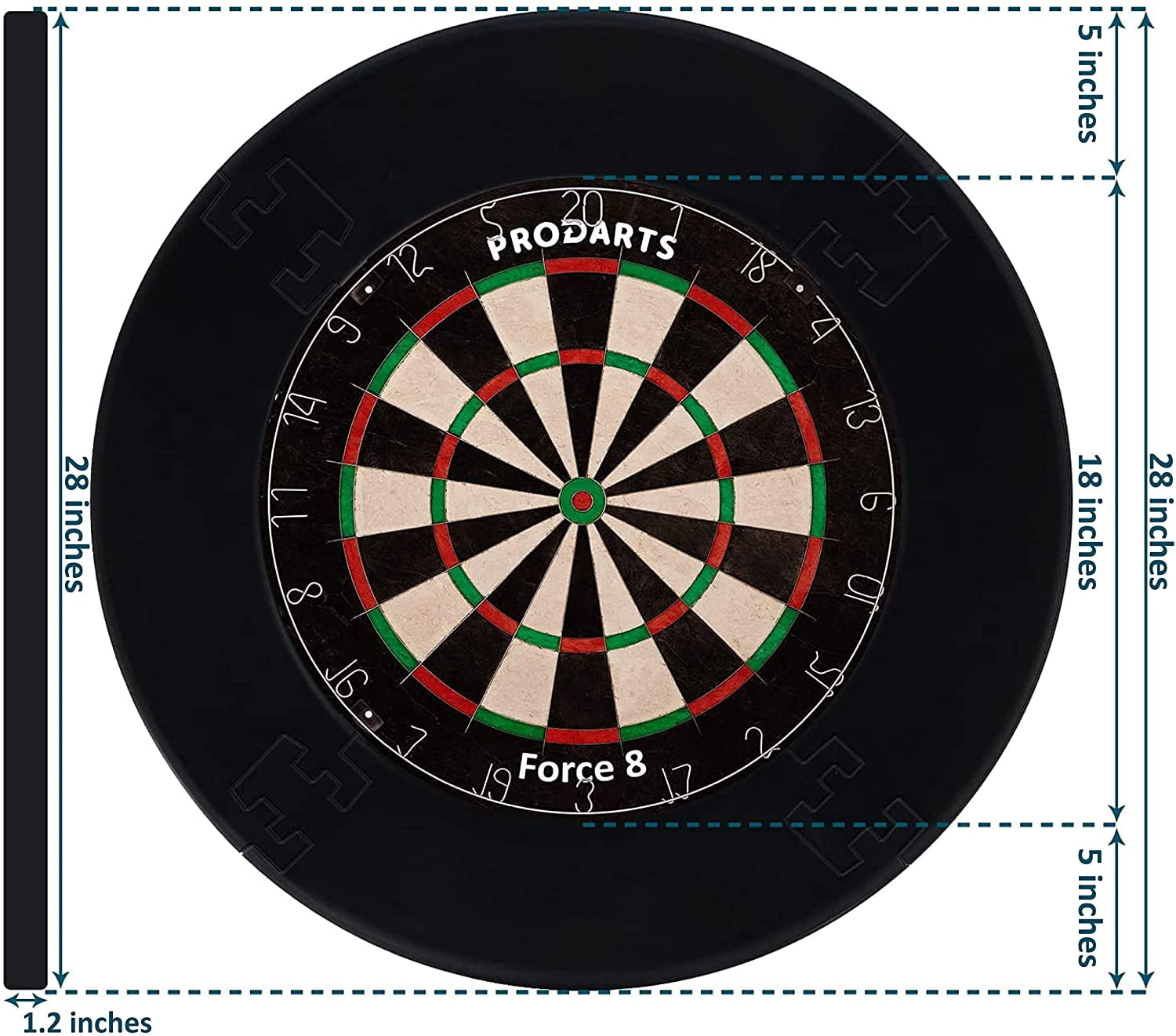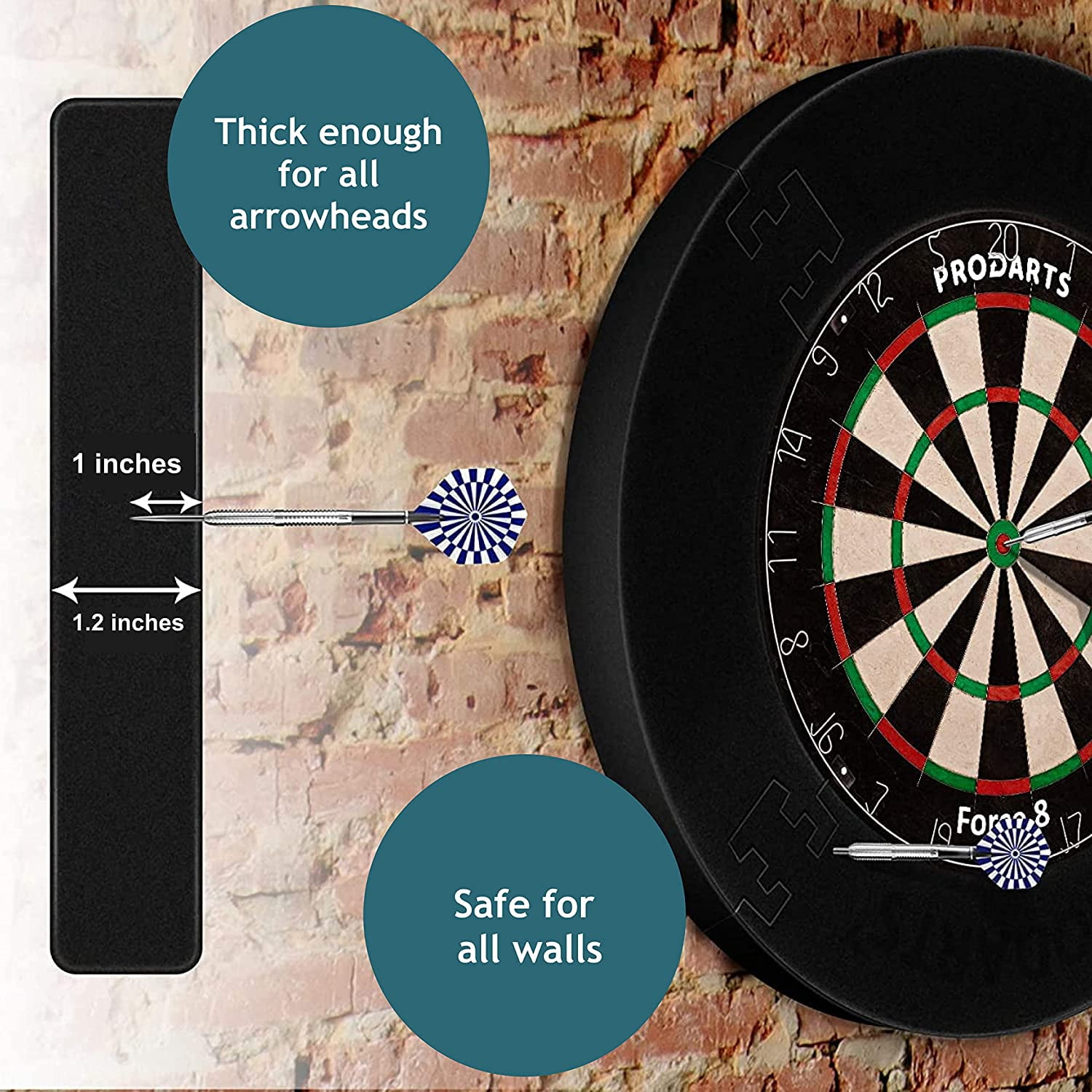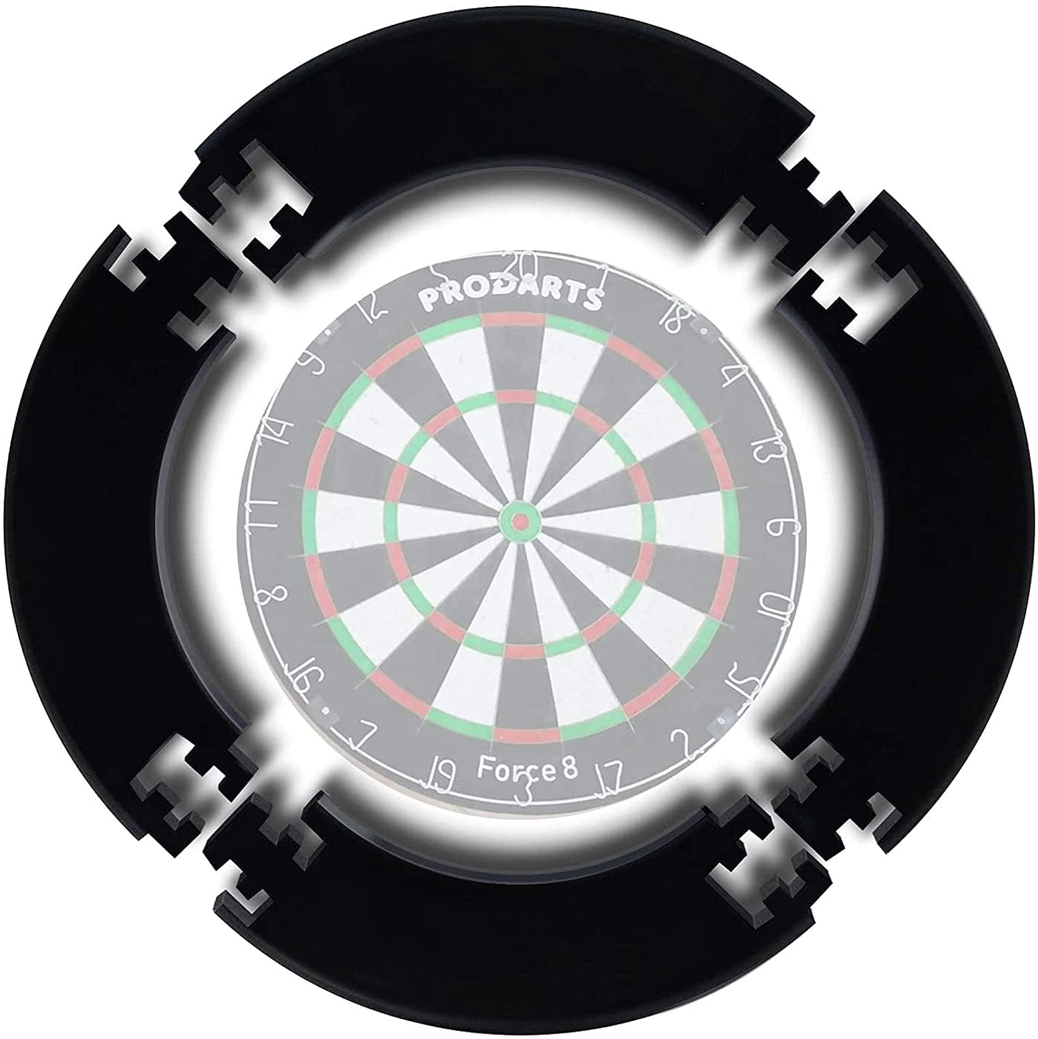 The ProDarts Dart Surround is a must-have for all dart enthusiasts. This dartboard backboard not only protects your walls and dart tips from damage but also gives your dart area a professional look with its traditional black catch ring. It’s designed to perfectly fit boards like the Unicorn Eclipse, with an internal diameter of 17.9″ and a width of 5.2″. The surround is 1.2″ thick, wider than a steel tip dart, ensuring maximum protection. Made from robust foam material, it securely holds darts and self-heals, leaving barely visible holes. The best part? It’s extremely easy to mount. The 4-piece dartboard wall protector can be placed over the dartboard without additional mounting or brackets. Plus, it’s reversible for extended use. Elevate your dart game with the ProDarts Dart Surround.