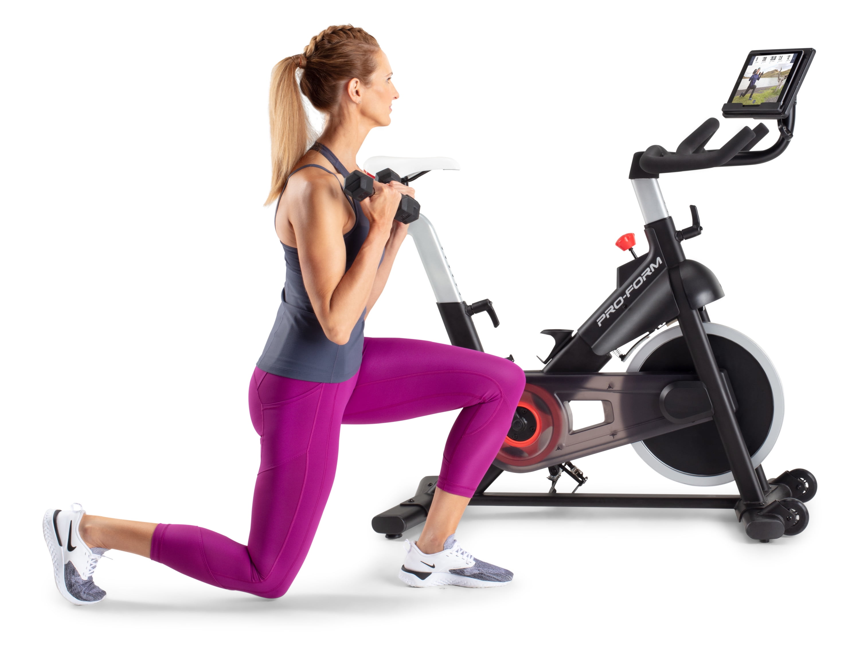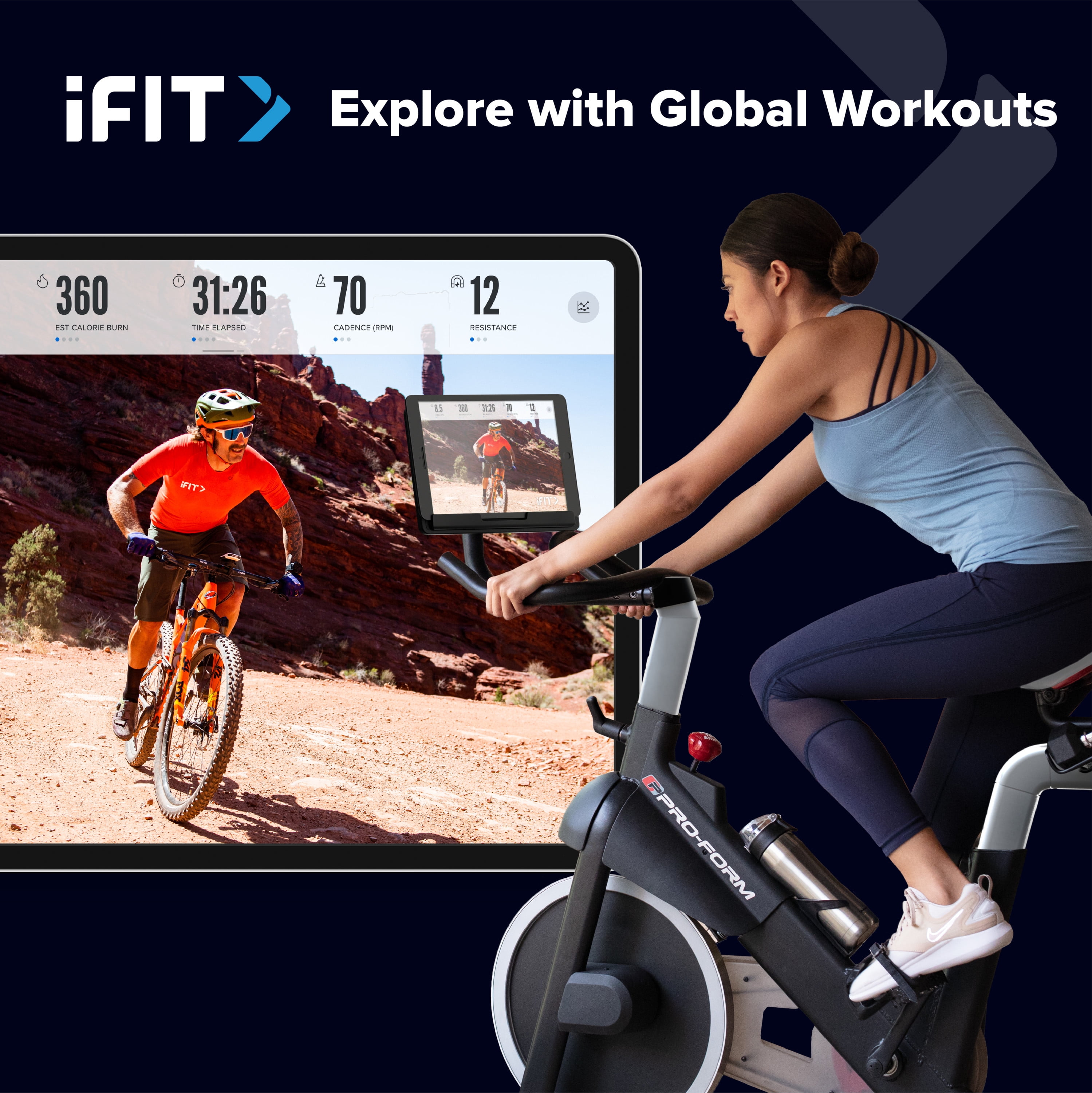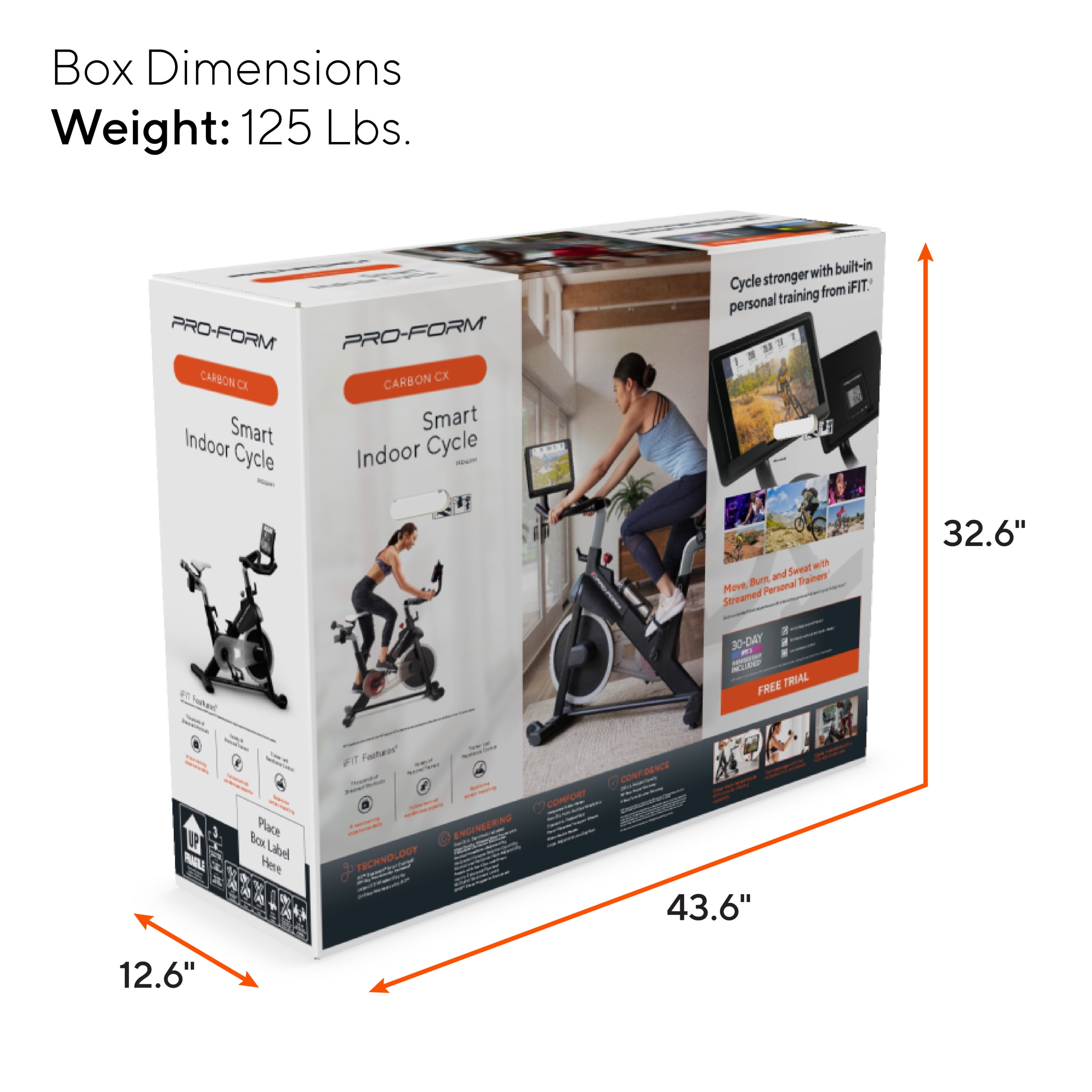 Get a complete fitness experience with interactive personal trainers in your living room. The ProForm Carbon CX home Exercise Bike comes with a 30-day iFIT membership, bringing the power of personalized training into the comfort of your living room. Embark on a virtual trip around the world, cycling from the breathtaking red rock deserts of Southern Utah to colorful Chilean streets. Transform your living room into a boutique studio class with on-demand video workouts led by charismatic coaches that automatically adjust your bike’s resistance to meet your workout’s requirements or mimic real-world terrain. An LCD window display with an incorporated device shelf provides a secure platform for your tablet or smartphone, and a SMART Bluetooth connection allows your iFIT Trainers to communicate with your exercise bike to automatically adjust your resistance. A set of 3 Lb. dumbbells gives you the ability to engage in full-body cross-training to develop comprehensive health, while 16 digital resistance levels give you total control of your workout while on your bike. Finally, an inertia-enhanced flywheel fortified with SMR Silent Magnetic Resistance delivers a smooth, quiet workout with every use – so you can train without waking the kids or bothering the neighbors.