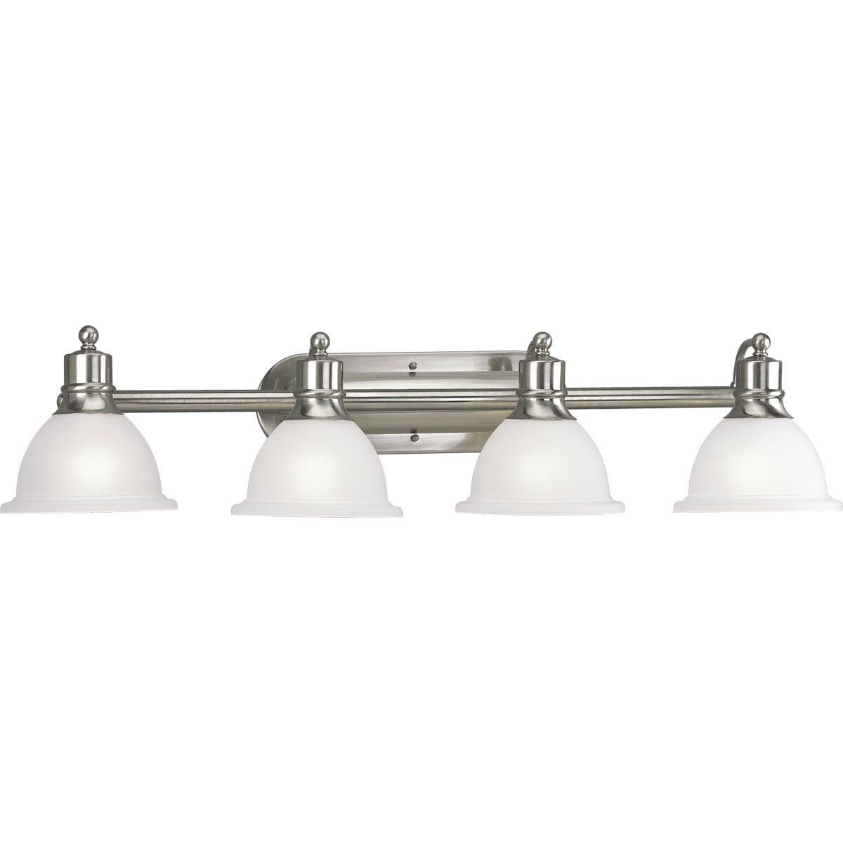 Collection: Madison, Material: Ceramic, Finish Color: Brushed Nickel, Width: 37.5″, Height: 8″, Depth: 9″, Height From Outlet Box: 4.88″, Backplate Width: 14.75″, Backplate Length: 4.75″, Lamping Type: Incandescent, Number Of Bulbs: 4, Wattage: 100 Watts, Moisture Rating: Damp Rated, Desc: Brushed Nickel Four-light wall bracket with white etched glass. Glass in a clean, simple domed shape provides even, diffused illumination. Fixture can be installed facing upwards or downwards. Mounting Direction: Up/Down / Back Plate Height: 4.75 / Back Plate Width: 14.75 / Shade Included: Yes / Shade Dimensions: 7.63 x 4.38 . ,-Madison – 4 Light – Bell Shade in Transitional and Traditional style – 37.5 Inches wide by 8 Inches high-Brushed Nickel Finish-Wall-Vanity, P3164-09, Madison, Bath & Vanity, finish type:plated, Transitional, Traditional, sconce, wall bracket, bath light, vanity light, vanity light, bathroom light, over sink light, bath bar, multi light wall sconce, vanity strip light, sink lighting-P3164-09