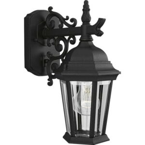 Progress Lighting-P5682-31-Collection: Welbourne, Material: Aluminum, Finish Color: Textured Black, Width: 6.25″, Height: 13.06″, Length: 9″, Depth: 9.75″, Height From Outlet Box: 3.5″, Backplate Width: 4.5″, Backplate Length: 7″, Lamping Type: Incandescent, Number Of Bulbs: 1, Wattage: 100 Watts, Moisture Rating: Wet Rated, Desc: The Welbourne collection features hexagonal framework with vine inspired scrolls and clear beveled glass panels. Cast aluminum construction with durable powder coat finish. One-light 6-1/2″ top mount outdoor wall lantern. Back Plate Height: 7.00 / Back Plate Width: 4.50 / Shade Included: Yes . ,-Welbourne – Outdoor Light – 1 Light in Traditional style – 6.25 Inches wide by 13.06 Inches high-Textured Black Finish