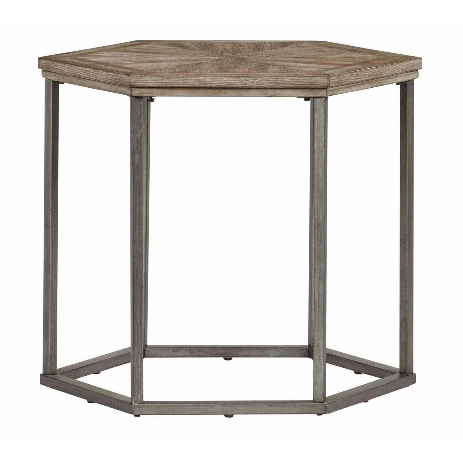 The Progressive Furniture Adison Cove Hexagon End Table lends your table lamp or sculpture a stunning modern or industrial perch. This table is slim and tall with an open hexagon base made of squared metal in a brushed gray finish. The hexagonal top is made from lightweight engineered wood with an ash veneer overlay. The veneers are finished in an ash blonde for a light, open feel.