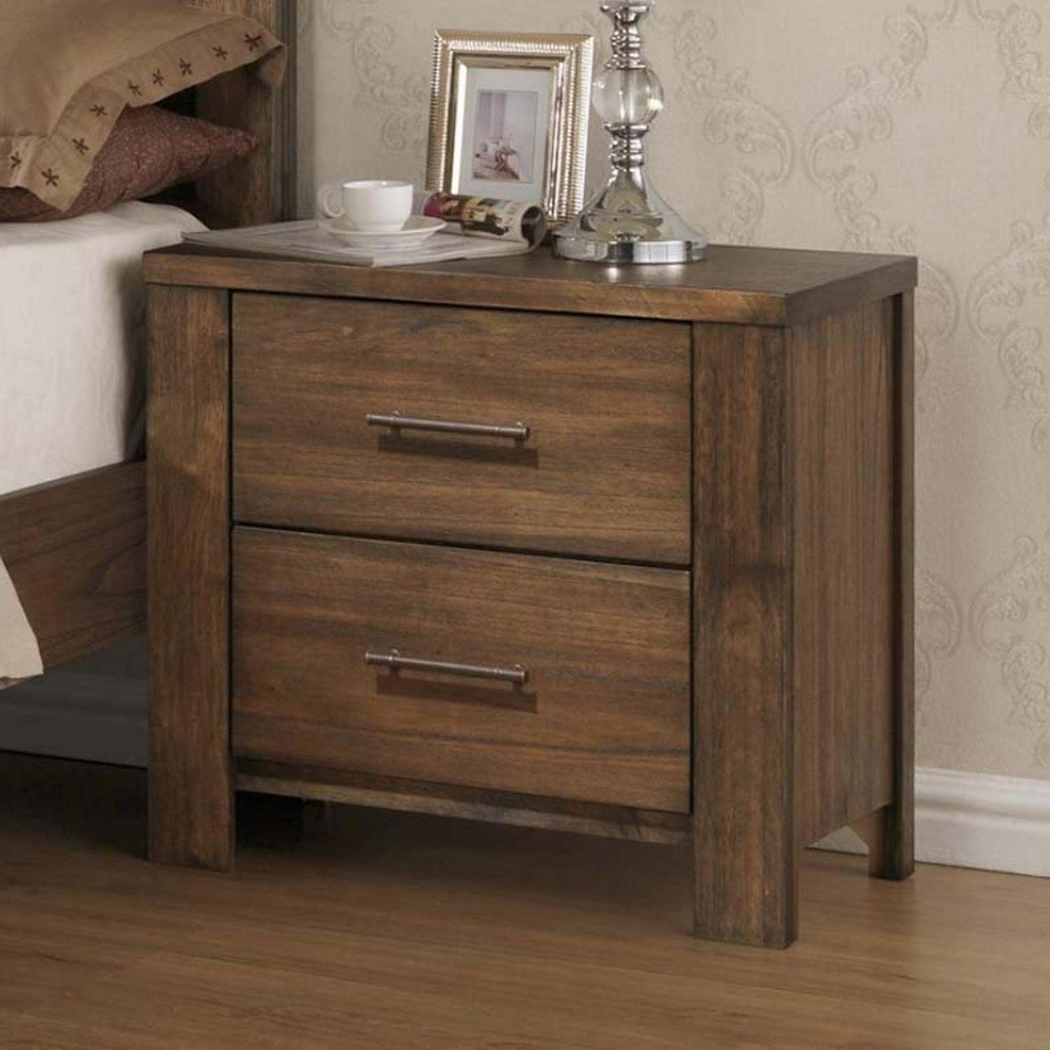 This Progressive Brayden 2 Drawer Nightstand is a practical and stylish bedside companion. This supremely functional nightstand boasts a spacious top and two soft-close drawers featuring French and English construction plus Kenlin guides. Slender bar pulls in a bronze finish and wide pilasters add to the transitional appeal. This nightstand is well-crafted from rubberwood solids and distressed mindi veneers with wormholes and a warm satin finish.
