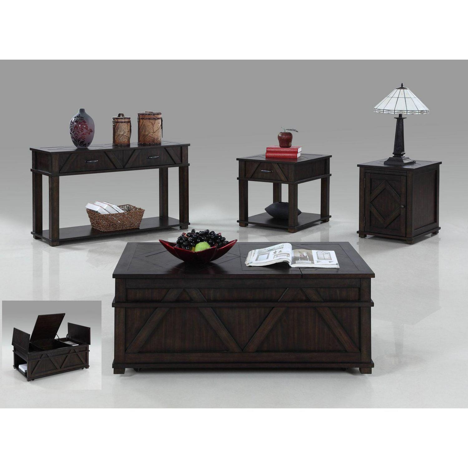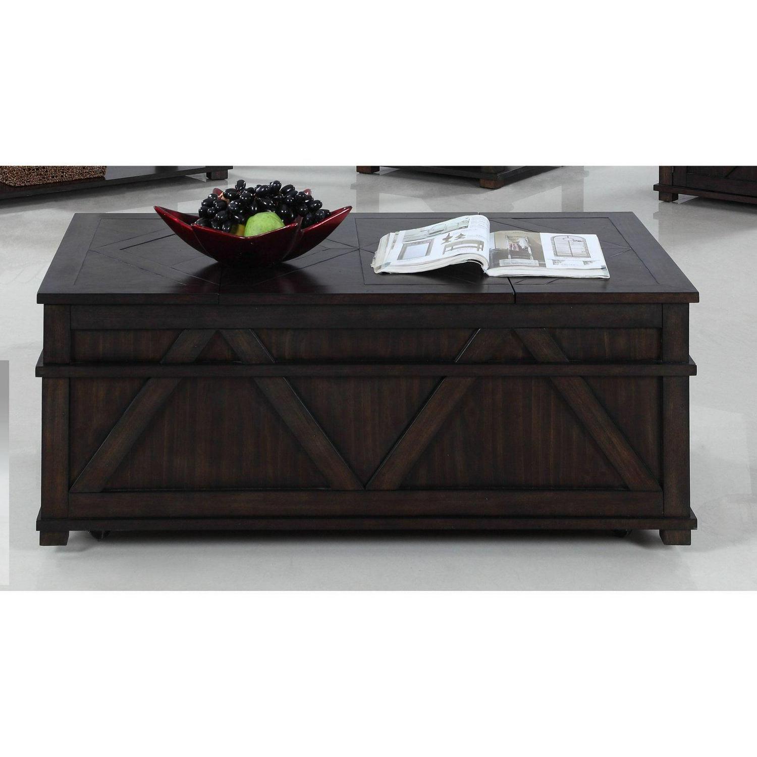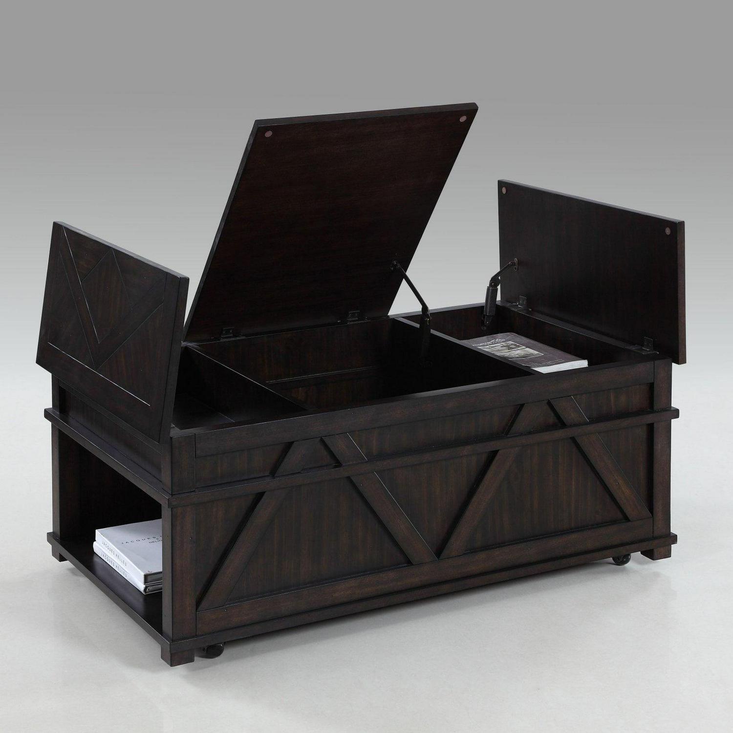 – Unique chest style cocktail table features storage everywhere! This storage chest cocktail features 3 lift tops and concealed casters for storage and mobility