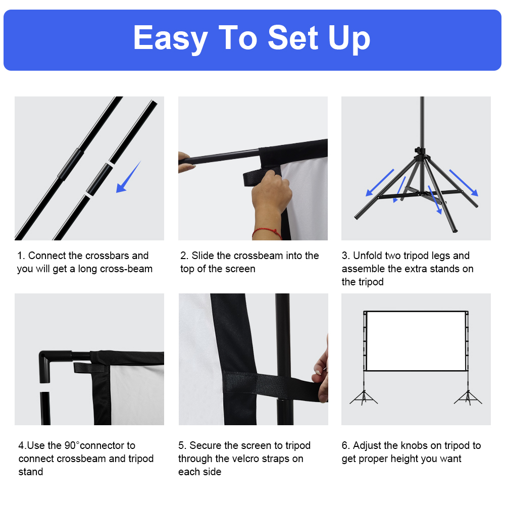 Made of high-quality polyester fiber that is durable, wrinkle-free, and easy to clean and maintain, making it a perfect choice for home or office use. Lightweight and portable design with a foldable construction, allowing you to easily carry and set up the projection screen anywhere. Offers a large 100-inch diagonal projection screen with a 16:9 aspect ratio, providing a cinematic viewing experience. Suitable for both indoor and outdoor use, making it versatile for a variety of settings such as home theaters, outdoor movie nights, classrooms, and business meetings. Backed by a 90-day limited warranty, ensuring your satisfaction with the product. Features a gain of 1.1 and a wide viewing angle of 160 degrees, delivering clear and vibrant images from multiple viewing positions. Comes with a projection screen, 2 stands, a carrying pouch, a rope, and floor plugs for easy manual assembly and setup.