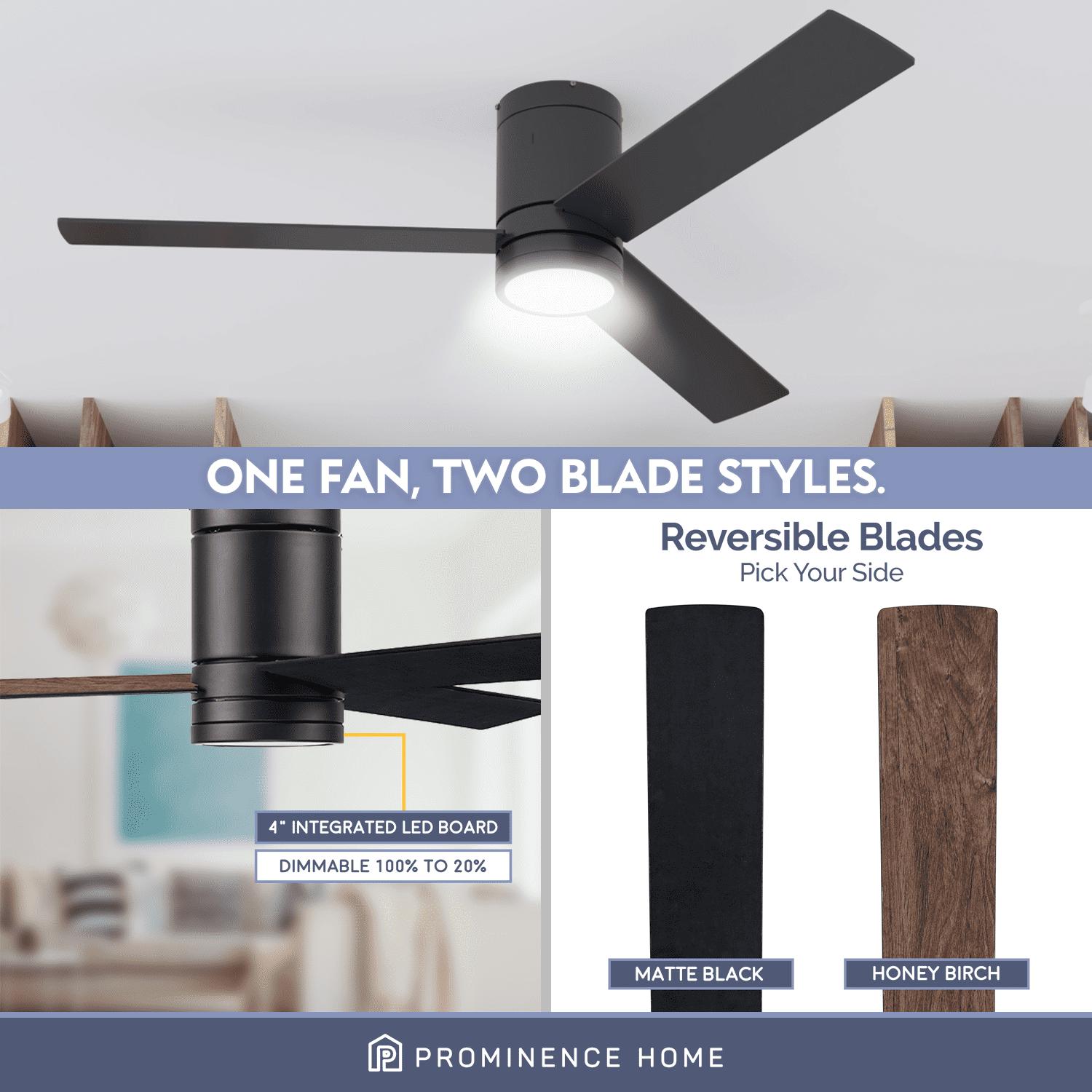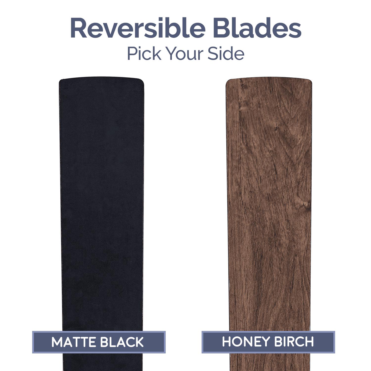– DUAL-FINISH REVERSIBLE BLADES: The style is up to you! This ceiling fan comes with a different finish on each side of the blades. One side comes in a beautiful Matte Black finish, while the other side showcases a lovely Honey Birch finish. Pick the look that best fits your space!