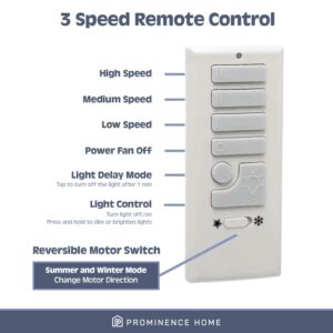 A contemporary fan with a clean, streamlined look, the Prominence Home Espy fits flawlessly in your modern spaces. The Espy features a bright white finish with 3 sleek, reversible blades are expertly designed to enhance the look and provide the perfect complement to your piece. One side has a white finish for a uniform look and modern appeal, while the other side has gray wash finish for a rich depth and beautiful contrast. These blades are easily and quickly adjustable- the choice is yours! Designed for rooms with shorter ceilings, its sleek cylindrical body houses a powerful, integrated dimmable LED light adding simplicity to style. The high contrast of angles throughout the 3 blade design provides adjustable, reversible air movement that is ultra-efficient whether you want to cool down on those sweltering summer days or circulate warm air in the cold months of winter. The included remote controls the power, 3 speed settings of the fan, the reversible airflow and light as well for the ultimate convenience. The Prominence Home Espy gives you all the quality functions you deserve while providing the impressive eye-catching style you crave.