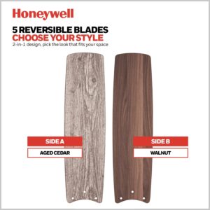 Elevate your farmhouse spaces with the beautifully rustic Honeywell Foxhaven indoor ceiling fan. This industrial farmhouse ceiling fan features a matte black finish showcasing a finely crafted lantern-light design featuring both beautiful clear seeded glass and stylish Edison bulbs for a look that is truly impressive! Each blade is easily adjusted and reversible with an aged cedar finish on one side and a medium walnut finish on the other side – choose the side that best suits your space and change it anytime! The Foxhaven is easy to install and comes with 3 rotation speeds and two mounting options standard down rod (as pictured) or angled. The down rod is 4 inches in length with an accompanying 54 lead-wire should you wish to use a longer down rod. The reversible motor housing enables it to not only cool during the summer but help circulate warm air during the winter. For added ease and elevated luxury, the features and fan functions are adjustable by the included remote control. Offering a unique style, splendid air flow and superior quality, just like all else Honeywell, you ll be able to rely on this fan for years to come.