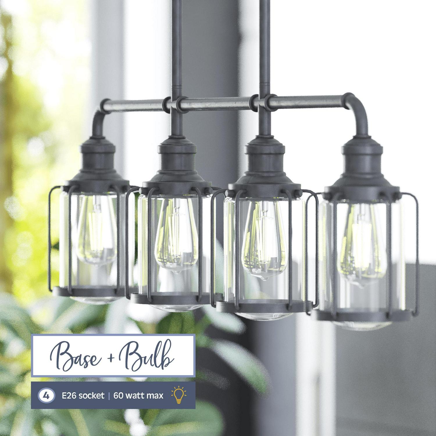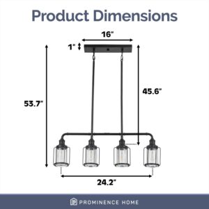 The Prominence Home Lincoln Woods industrial farmhouse style pendant light provides bright, beautiful light and eye-catching charm. This steel-crafted light fixture features a matte black finish with 4 lantern-style steel cages surrounding clear glass shades to add striking style to your home. This stunning bar light looks amazing over a kitchen island or dining room table. This bar light fixture comes with comprehensive instructions and a troubleshooting manual making it easy to have installed in no time!