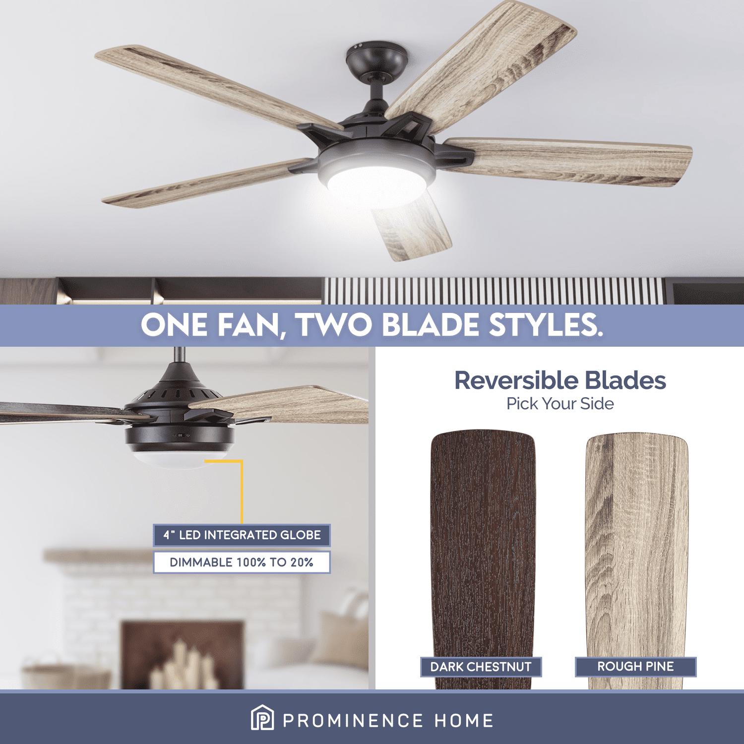 The Prominence Home Lorelai smart fan combines a sleek, streamlined look with innovative state-of-the-art technology for the ultimate in luxurious comfort and style! This modern farmhouse ceiling fan is part of the Prominence Home Smart Fan Collection powered by FansIO. The Lorelai works with home automation applications such as Amazon Alexa and Google Assistant giving you the option to use your voice to control the fan functions. Additionally, the unit can be controlled via the included FansIO smart ceiling fan remote as well as the FansIO app which is downloadable at the App Store and Google Play. Being smart has never been so cool! The Lorelai is not just innovative and functional, it is fashion-forward as well! This 52-inch ceiling fan features a beautifully rounded integrated circular light which provides a perfect contrast to the sharp angles of the modern peep-hole blade arms creating a striking focal point. The Lorelai showcases a gorgeous bronze finish expertly paired with reversible blades with a different finish on each side. The easily adjustable blades feature a rough pine finish on one side and a dark chestnut finish on the other. Each combination is expertly designed to add extra flair and perfectly accent a variety of different looks (especially coastal and farmhouse styles) to have mass appeal. The powerful motor and design provides adjustable, reversible air movement that is ultra-efficient whether you want to cool down on those sweltering summer days or circulate warm air in the cold months of winter. To ensure your long-term satisfaction, this fan is backed by a limited lifetime warranty. The Prominence Home Lorelai gives you all the luxurious functions and technology innovations you deserve while providing the impressive eye-catching style you crave.
