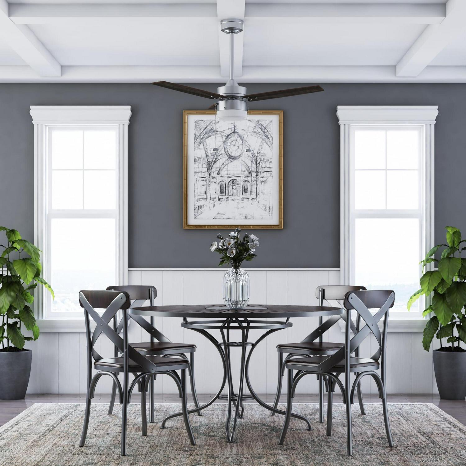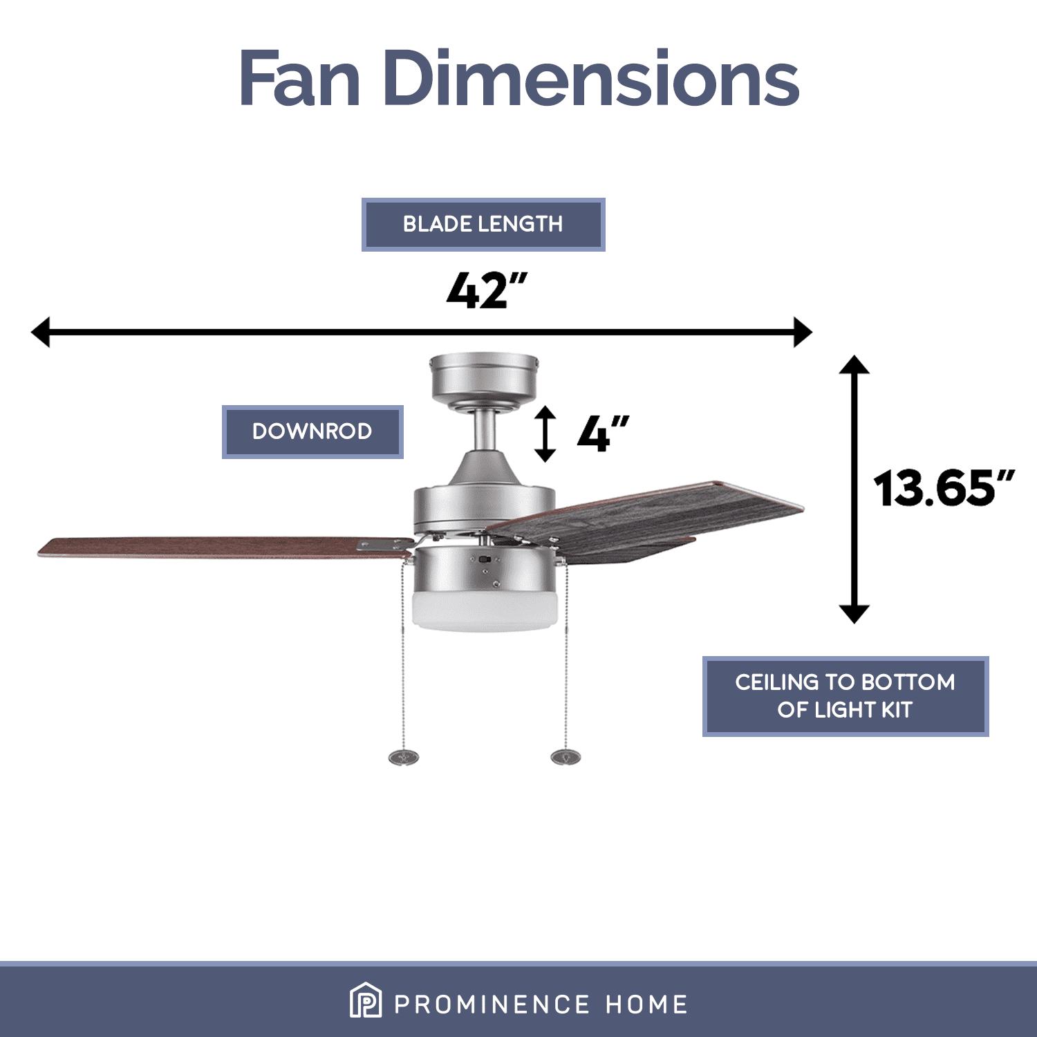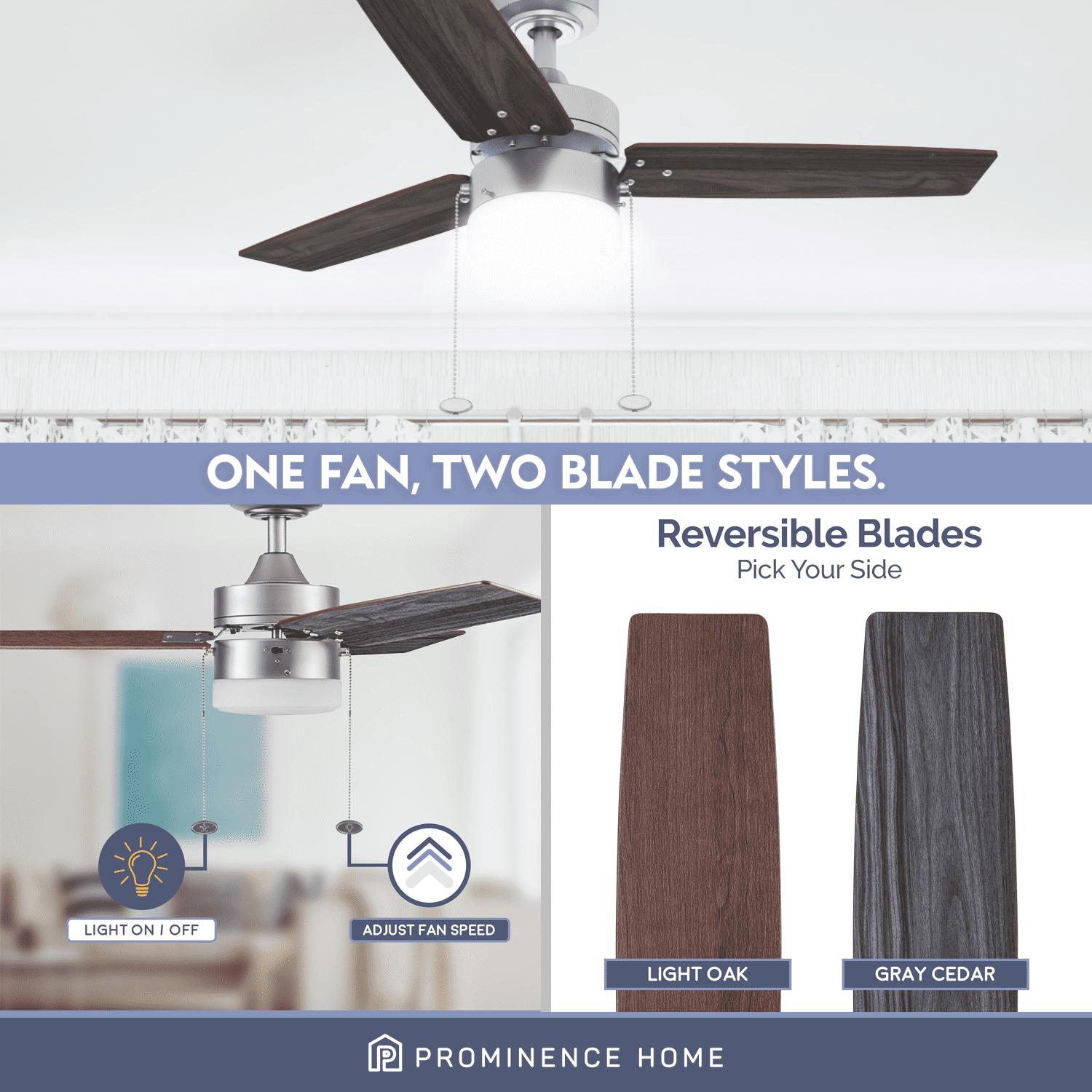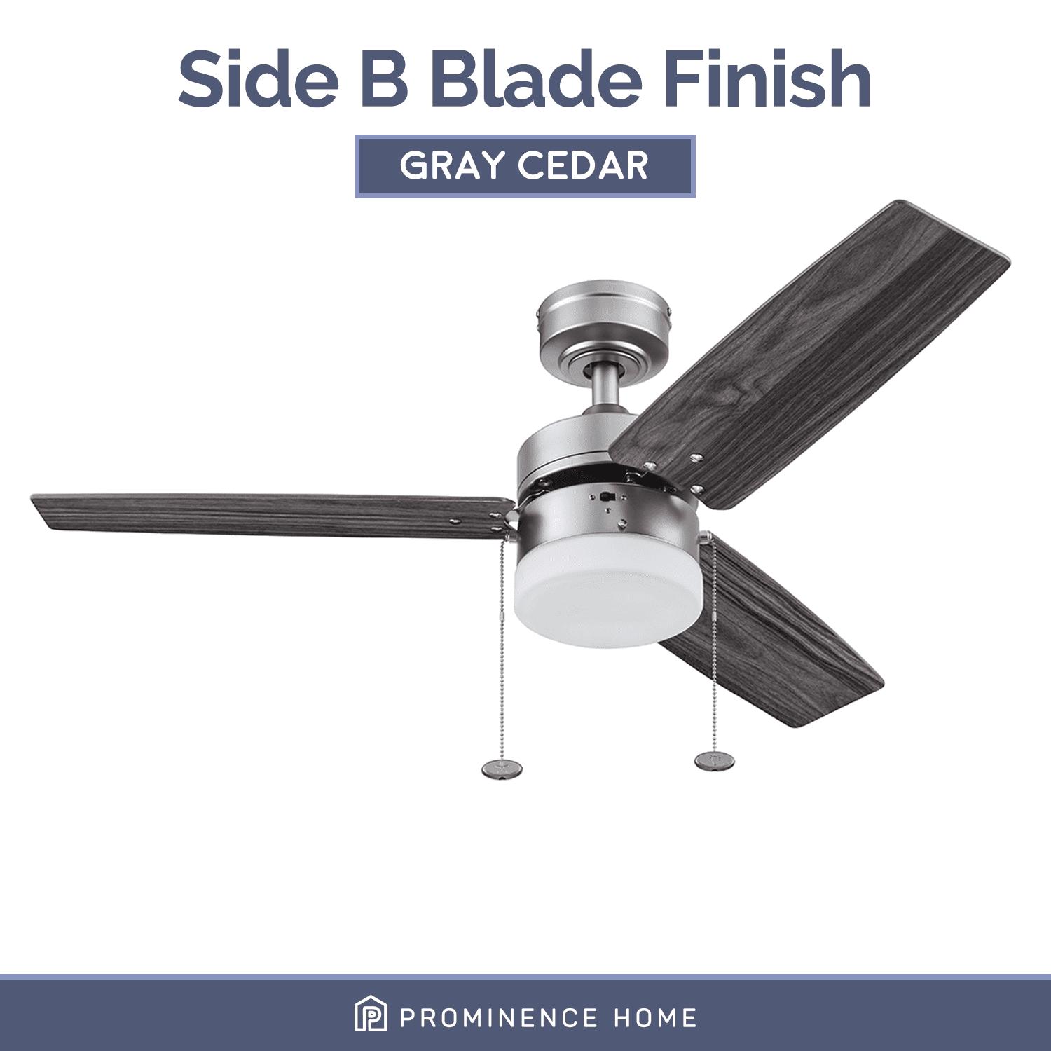 The 42-inch Prominence Home Reston is a clean-cut contemporary ceiling fan perfect for modernizing your spaces. The sleek pewter finish paired with gray cedar/ light oak reversible blades bodes well with coastal and modern farmhouse decor.Its gleaming cylindrical body houses an integrated white frosted globe light adding simplicity to style while providing dimmable LED illumination to your indoor areas. The quiet, reversible motor and design provide adjustable air movement that is ultra-efficient whether you want to cool down on those sweltering summer days or circulate warm air in the cold months of winter.The Prominence Home Reston gives you all the quality functions you deserve while providing the impressive eye-catching style you crave.