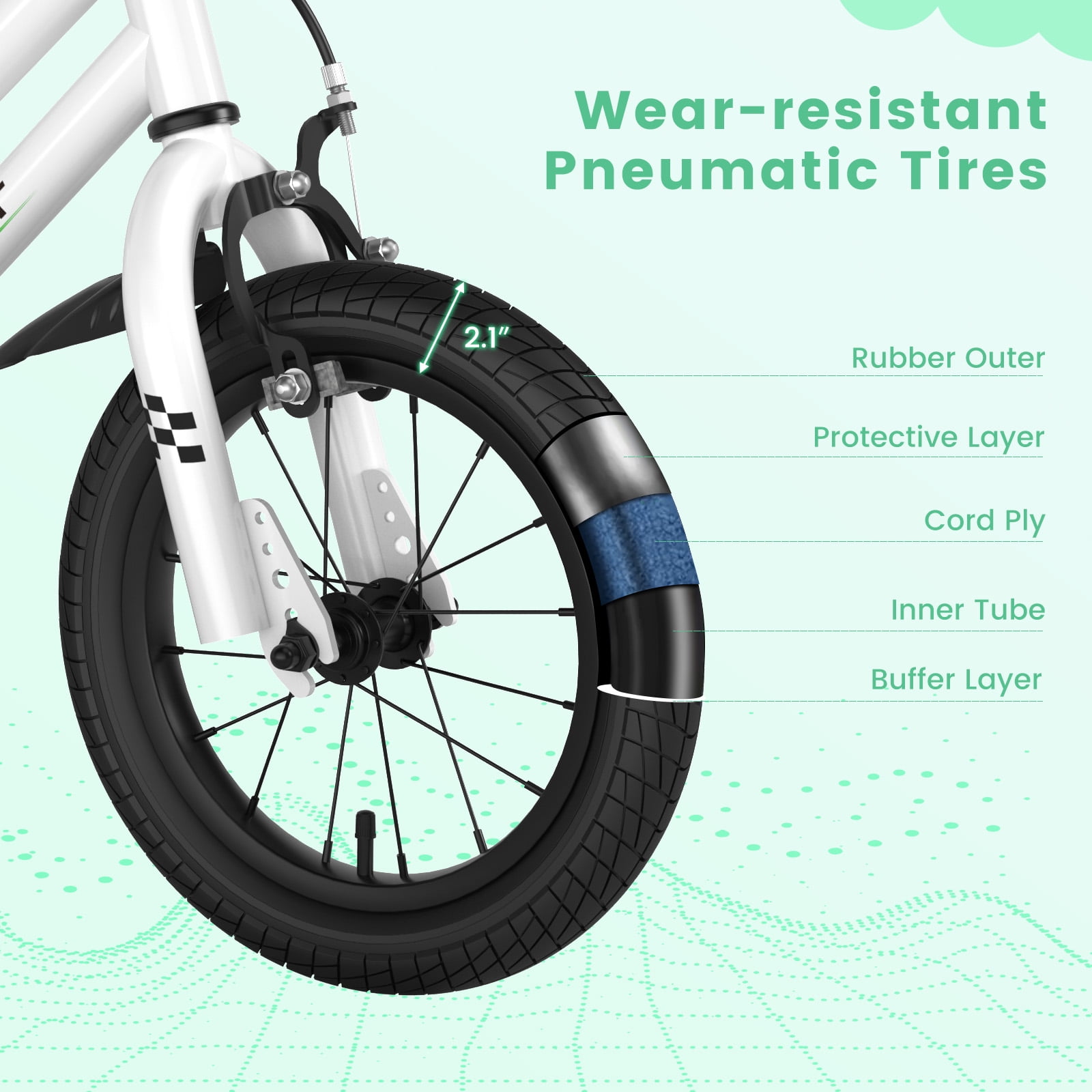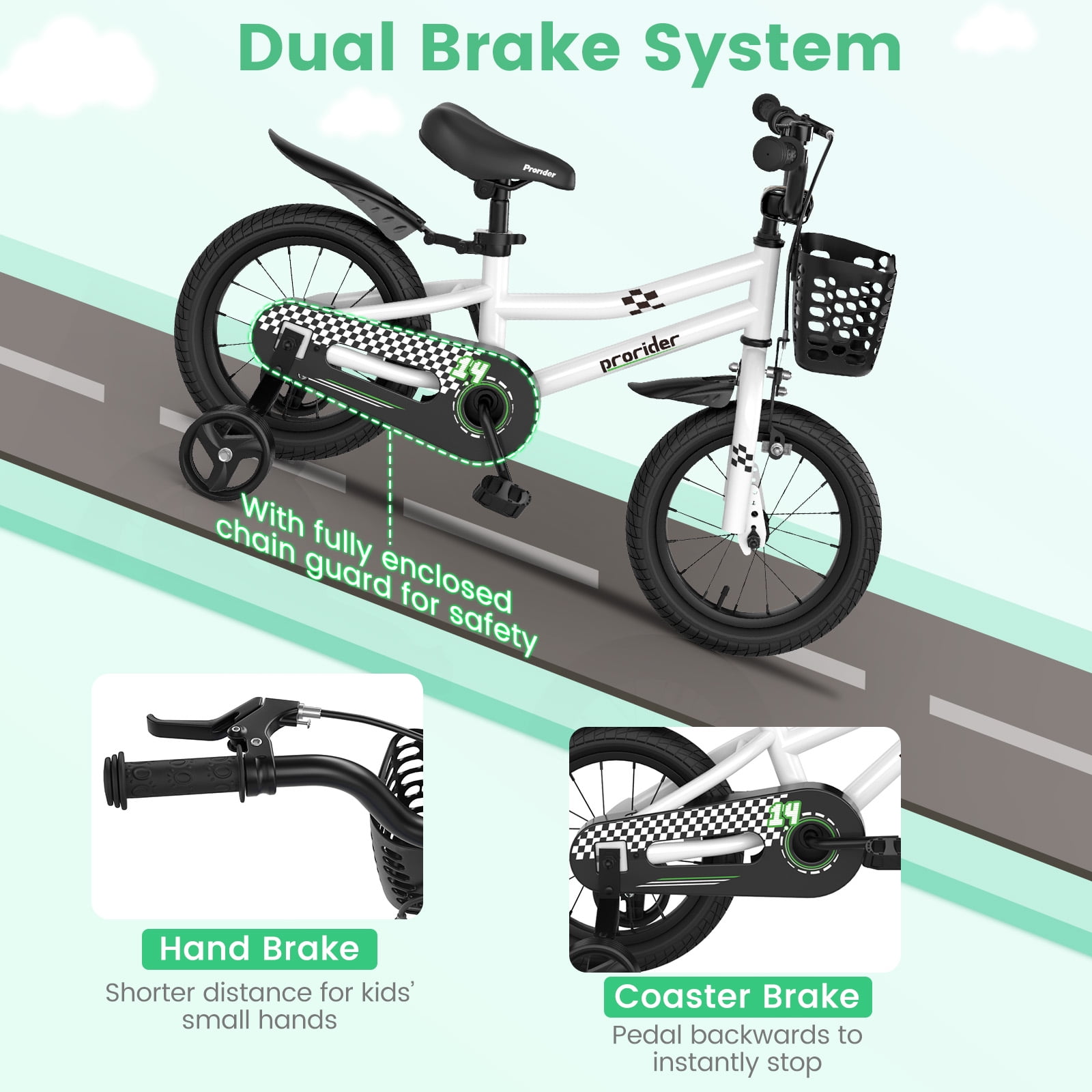 It’s time for kids to take the adventure with a cool toddler bike. Our 14” children training bicycle is equipped with height-adjustable handlebar(26”-28.5”) and saddle(20”-24”) to meet your kids’ needs, and allows your little ones to ride with the most comfortable position. Besides, it is equipped with a dual brake system( including hand brake and coaster brake) and fully enclosed chain guard for high safety. The anti-slip pedals and wear-resistant tires enable kids to ride on various flat roads. Besides, 2 training wheels add more stability. The front detachable basket is a perfect place for kids to store their toys. Last but not least, this toddler bicycle comes with 95% pre-assembled design, which is easy for you to install it quickly and effortlessly. Note: Measure kid’s INSEAM and compare with SADDLE HEIGHT to check if the rider can touch the ground. Feature Height-adjustable handlebar & seat accompany kids to grow up Designed with hand brake which is shorter distance for kids’ small hands Equipped with coaster brake (pedal backwards to instantly stop) Removable storage basket for kids to place toys and snacks Ours: 95% pre-assembled design, better than others: 85% pre-assembled Wear-resistant pneumatic tires feature multiple layers: rubber outer, buffer layer, cord ply, inner tube and protective layer Extra training wheels make it suitable for beginners to ride Both training wheels can be removed if you need Fully enclosed chain guard to keep kids away from the drivetrain for safety Soft padded seat for kids to ride with utmost comfort Allows for hassle-free installation Premium carbon steel frame is durable and solid for long-term use Bell on the bar can help your boys and girls to remind others for safety Specification Color:White Material: Carbon Steel, PP, PVC, PP, TPR Overall Dimension: 41” x 20” x 26”-28.5” (L x W x H) Handbrake Height: 26”-28.5” Saddle Height: 20”-24” Saddle Size: 8.5” x 5.5”(L x W) Inseam Height: 18.5″-22.5″ Suitable Height: 37.5”-43.5” Suitable Age: 3-5 Years Old Weight Capacity of Seat: 99 lbs Net Weight: 21 lbs Package includes: 1 x Kid’s Bike 1 x Instruction