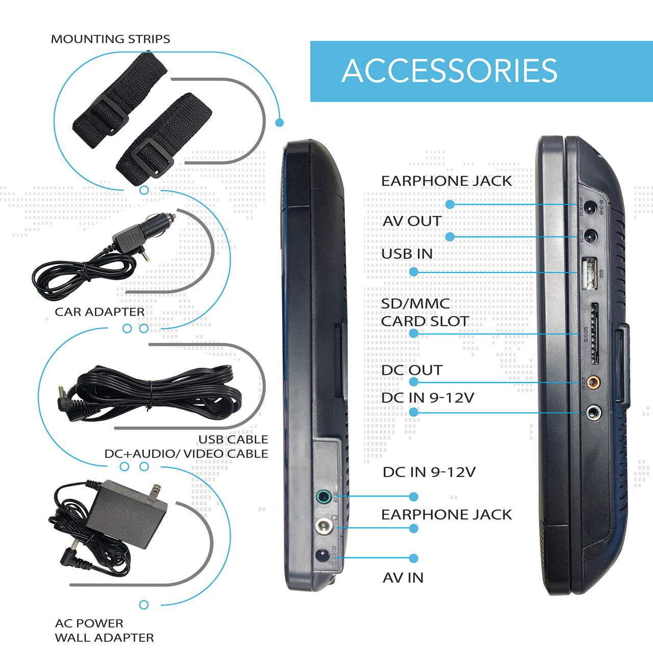 Versatile Media Compatibility: Supports a wide range of media formats, including DVD, DVD+/-R/RW, VCD, CD, CD-R/RW, MP3, and JPEG, making it perfect for various entertainment options. Dual 10.1″ Display: Features two 10.1-inch screens for simultaneous viewing, allowing you to watch movies or display images from the main unit on one screen, while the second screen mirrors content from the master unit. Multiple Connectivity Options: Equipped with a USB port and an SD card slot, providing convenient access to external media sources for an enhanced entertainment experience. AV Out Capability: Enables you to connect the device to an external display or TV, expanding your viewing options for a larger audience. High-Quality Audio: Enjoy a superior listening experience with stereo audio output and a headphone jack for personal or shared audio. Text-to-Speech Function: Enhances accessibility with text-to-speech functionality, providing audio descriptions or narration for your content. Complete Package: Comes with 2 mounting straps, a DC Audio/Video Cable, and a DC power car adapter, ensuring you have everything you need for setup and convenience. Sleek Black Design: Aesthetically pleasing in black, seamlessly fitting into various car interiors and entertainment setups.