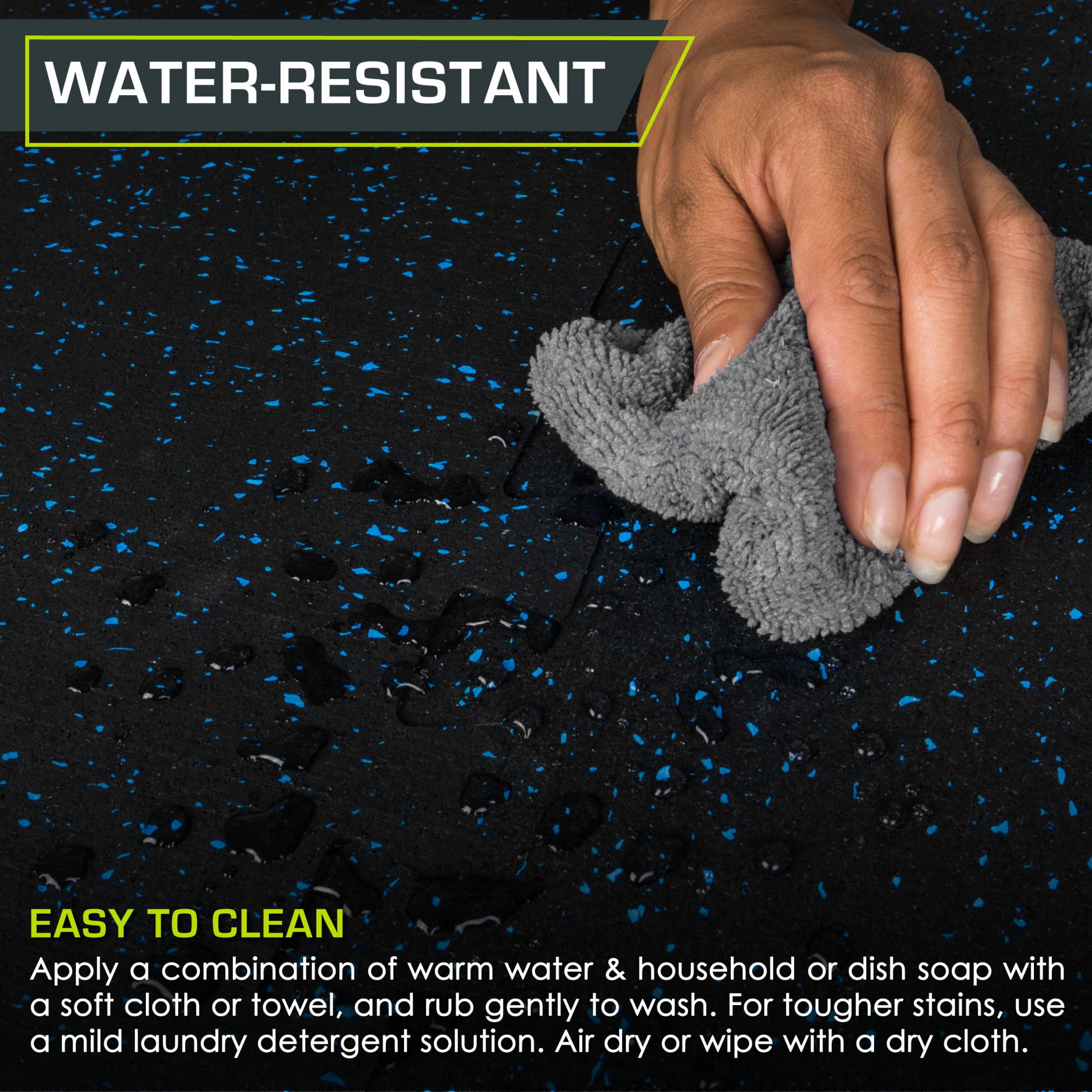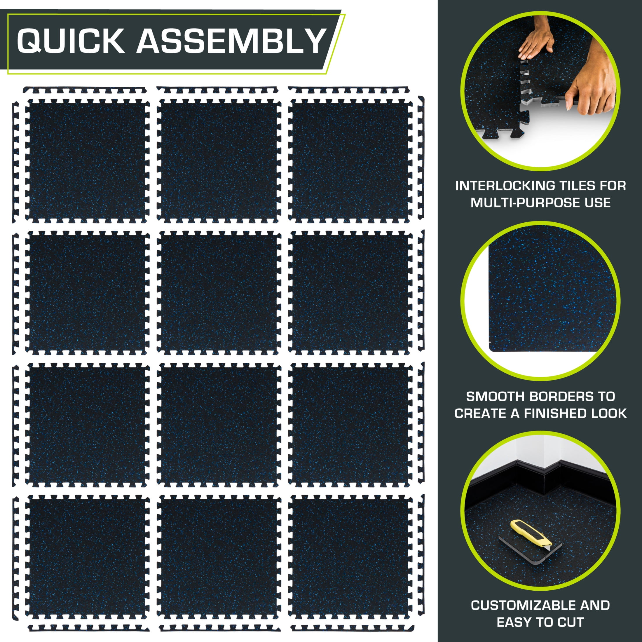 Rubber Top Exercise Puzzle Mat 1/2-in, Blue, 48 Sq Ft – 12 Tiles CUSHIONED WORKOUT SPACE: Turn hard floors into comfortable, impact-absorbent surfaces for fitness and equipment with foam floor tiles; the ½-inch gym mat protects floors against scratches and dents from heavy equipment TWO LAYERS OF SUPPORT – Textured rubber top layer with high-density EVA foam bottom layer creates the perfect shock-absorbent and non-slip surface QUICK ASSEMBLY – The jigsaw design makes assembly quick and easy. Simply connect edges together and easily disassemble and move tiles around whenever you need COVERS 48 SQ FT: Each foam mat tile measures 24-inch x 24-inch x ½-inch; the floor mats for home gym include end borders for clean edges and polished look NON-SLIP & ABSORBS IMPACTS – The speckled rubber top offers a non-slip, textured surface and the high-density foam underneath absorbs impact and protects your floors damage