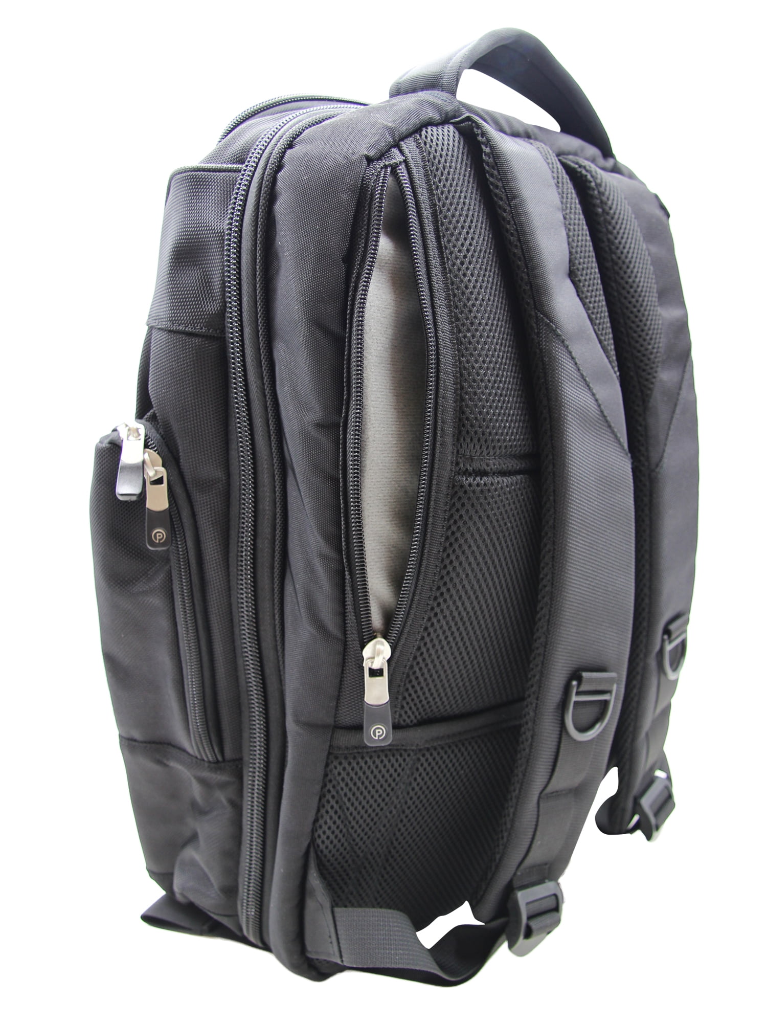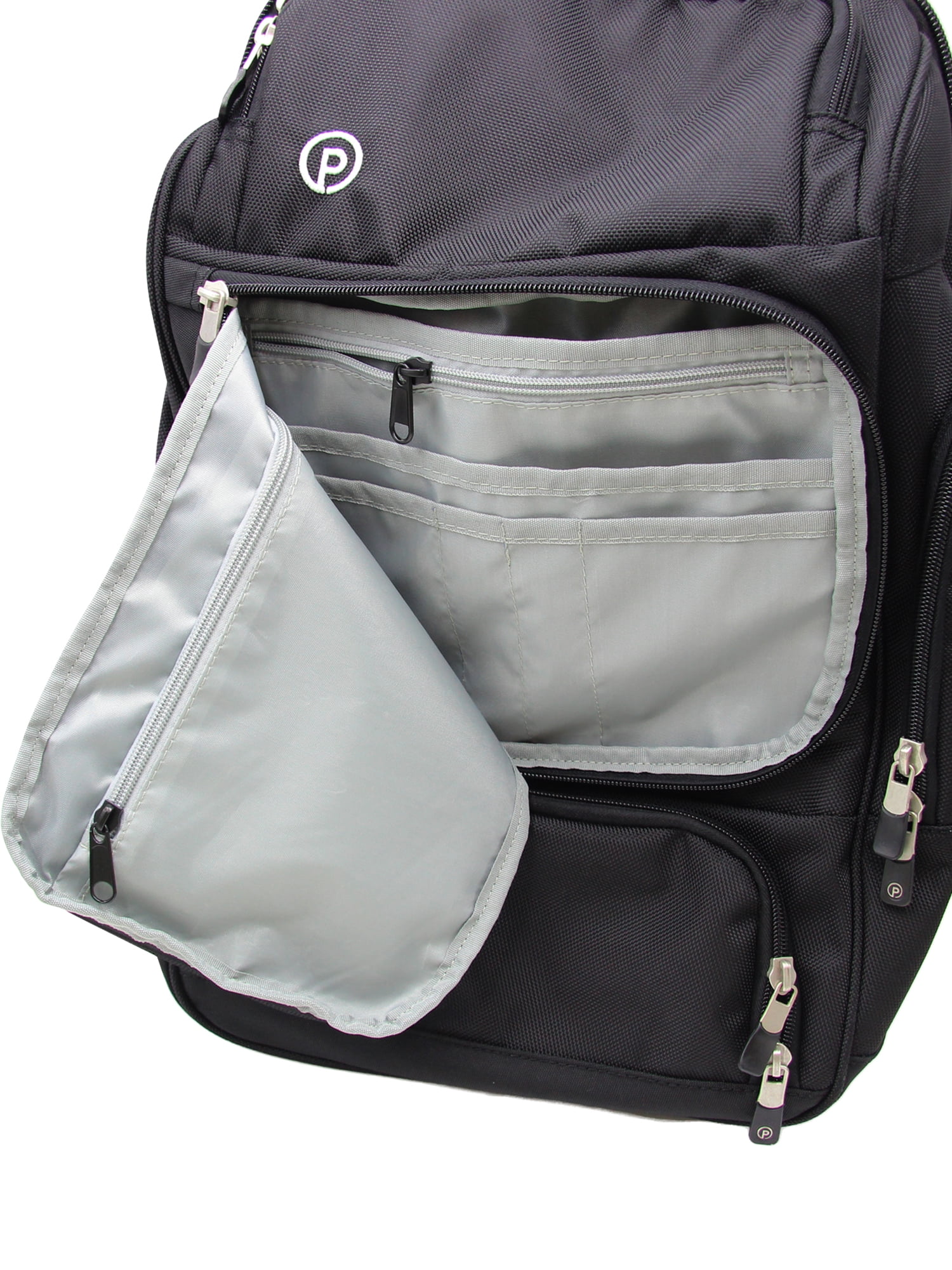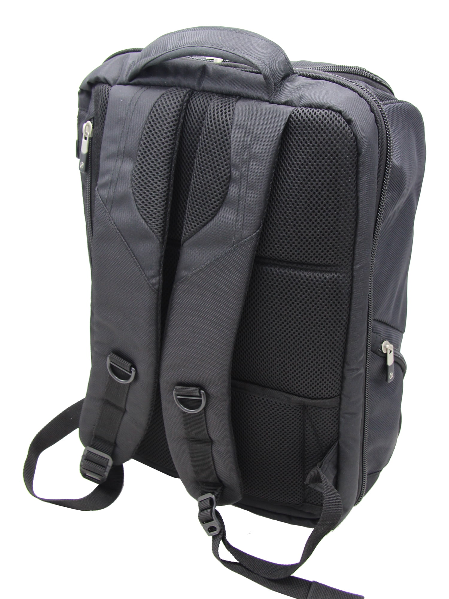 This adult, unisex 18″ Weekender backpack is the perfect size for use as a weekender, daily commuter, or an airline carry on bag. This backpack has plenty of organizational pockets and features. Made of durable, solid black, 100% recycled polyester fabric making it perfect for travel and a good choice for the environment. Featuring a laptop and tablet sleeve compartment, fleece media pocket perfect for cell phones or sunglasses, padded handle and shoulder straps, as well as a trolly sleeve to slid over your luggage when travelling.