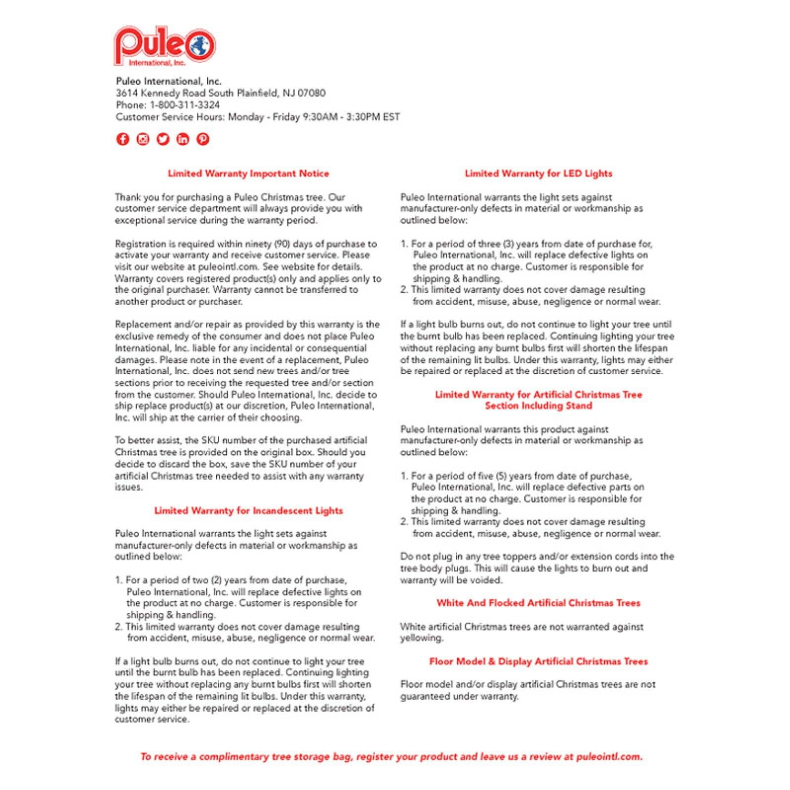 During the holiday season, your home is not complete without the addition of a Puleo Christmas Tree. Puleo is The Oldest Family Name for Christmas Trees in America and our trees will bring joy and holiday spirit year after year. Puleo Christmas trees are hand-crafted using only the highest quality materials to achieve an incredibly realistic appearance. Our 7.5 foot tall Pre-lit Northern Fir White Artificial Christmas Tree features 1354 branch tips with room for many treasured Christmas ornaments and 600 Clear lights that warmly illuminate the room.