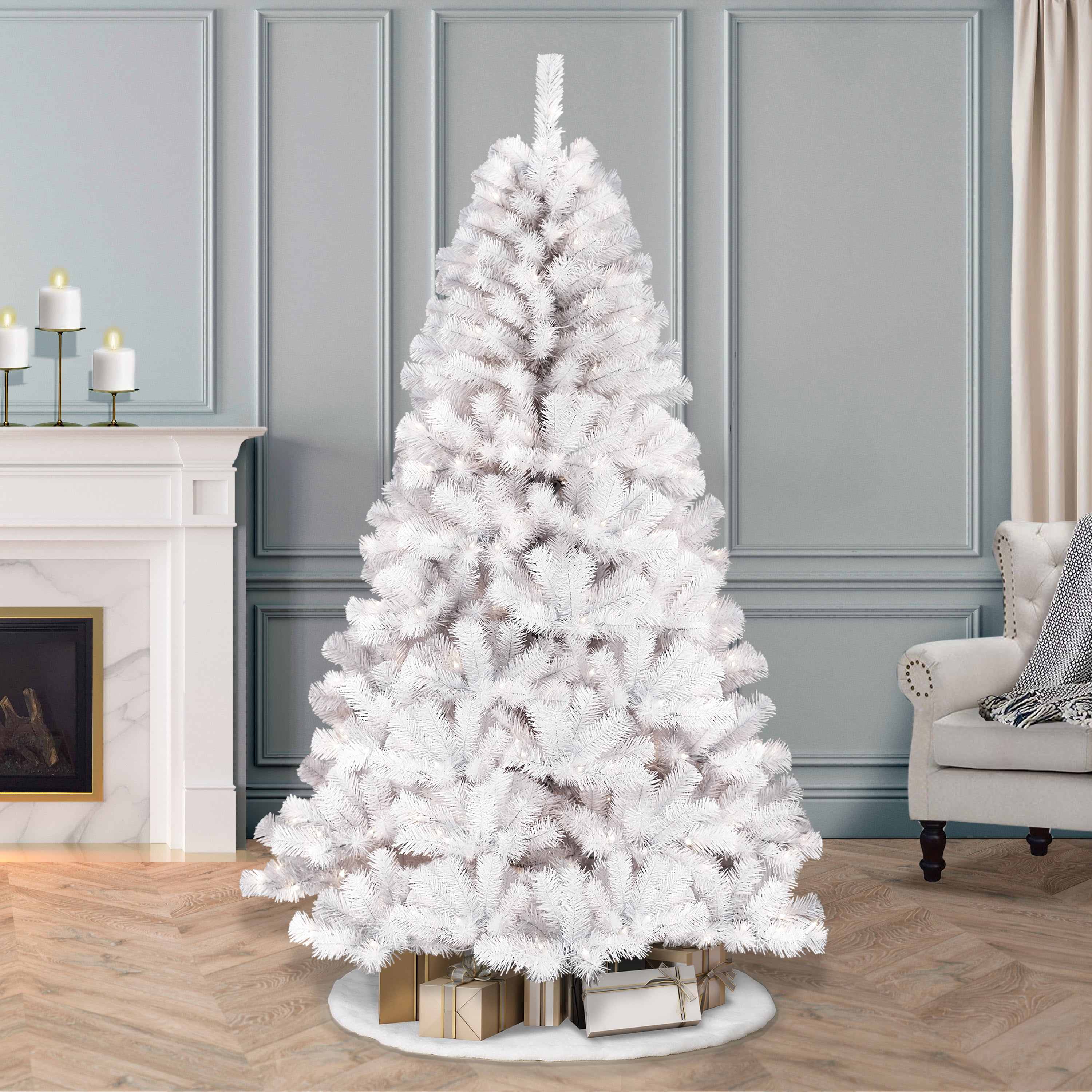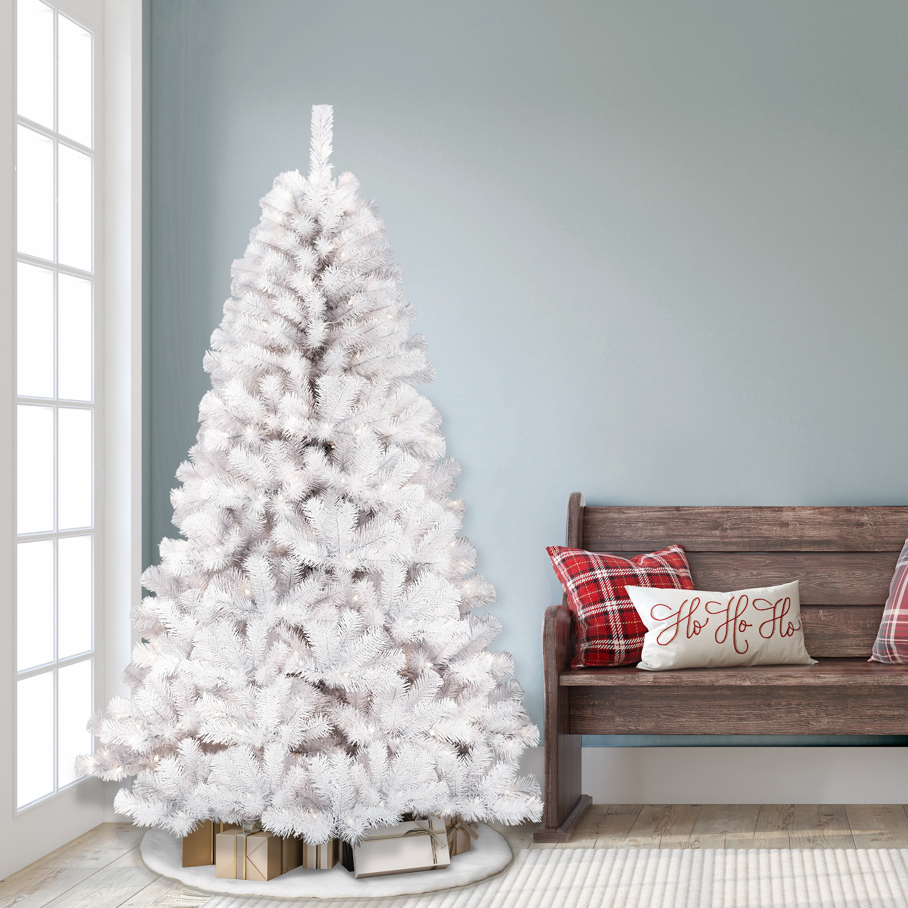 Puleo International 7.5 ft. Pre-lit Northern Fir White Artificial Christmas Tree 600 UL listed Clear Lights Flocked northern fir design Hinged branches for simple assembly Flame retardant Hypoallergenic 100% PVC and Metal Metal stand included