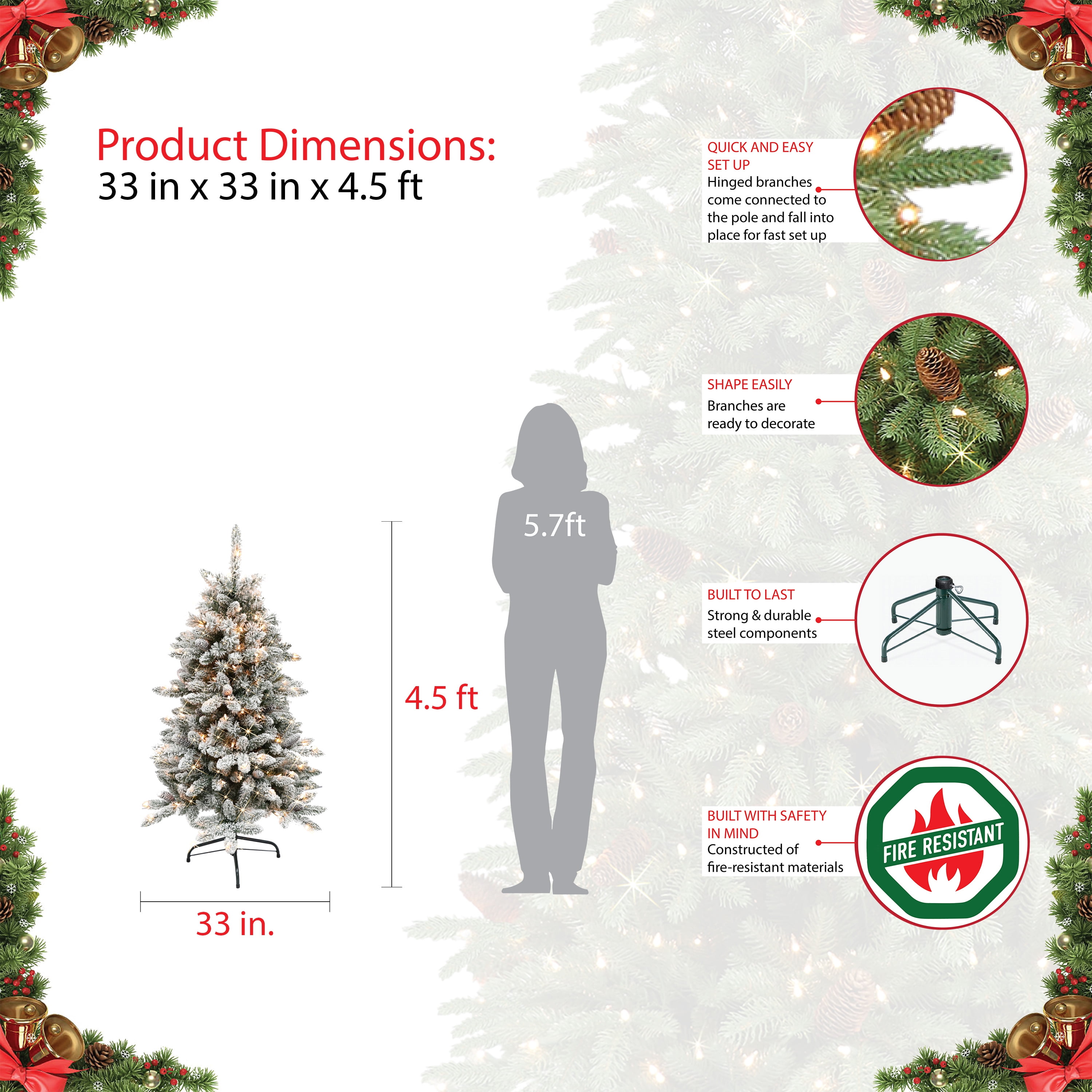 Choose from available size options Based on real-life fir trees 354 to 983 tips depending on size choice 150 to 350 lights depending on size choice Strand lights stay lit after one burns out Hypoallergenic and flame retardant UL Listed Flocked in white with pinecone accents