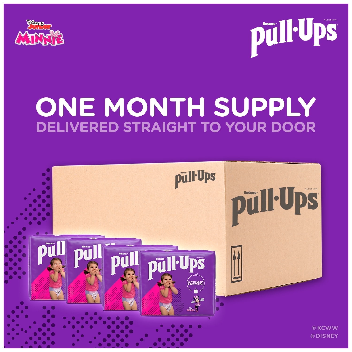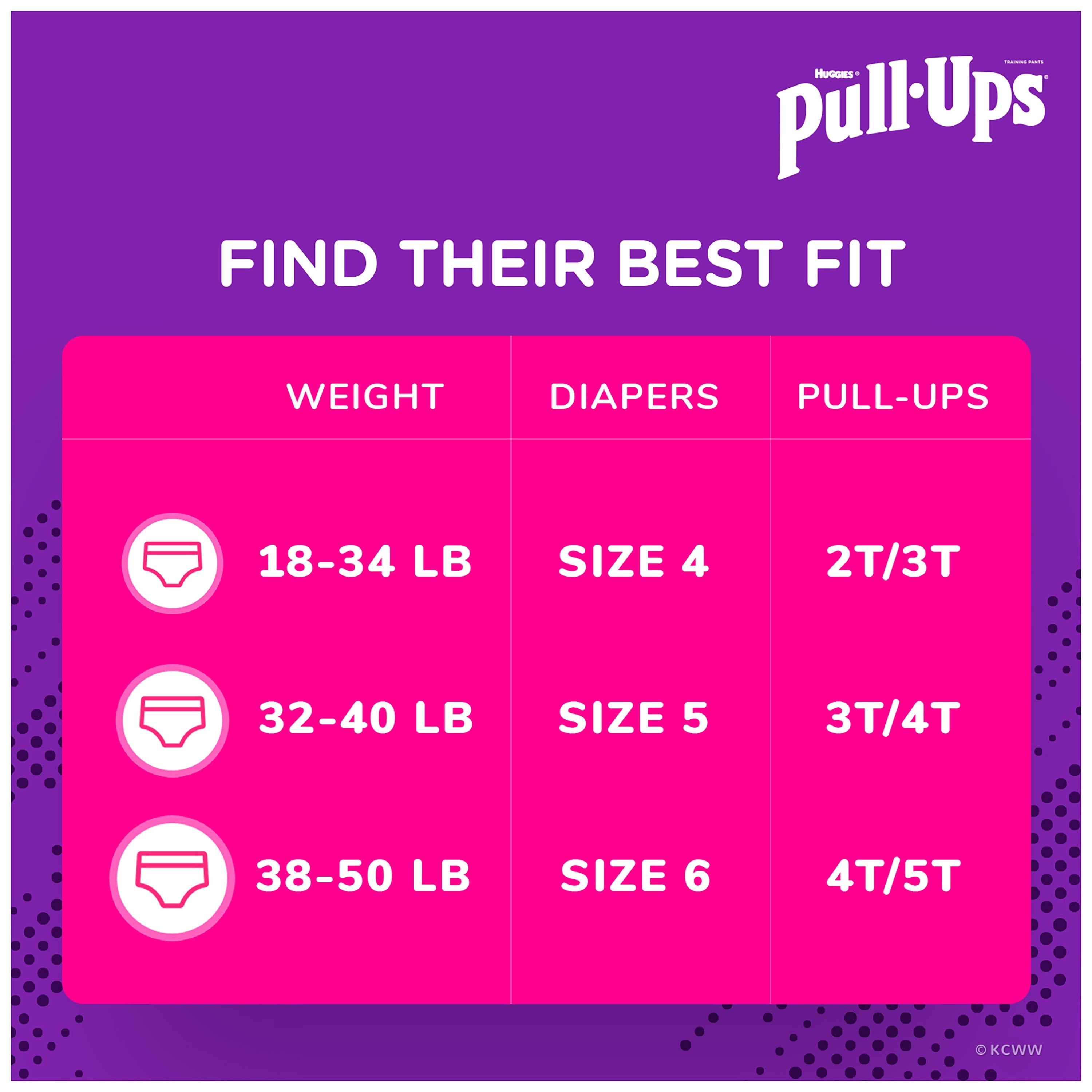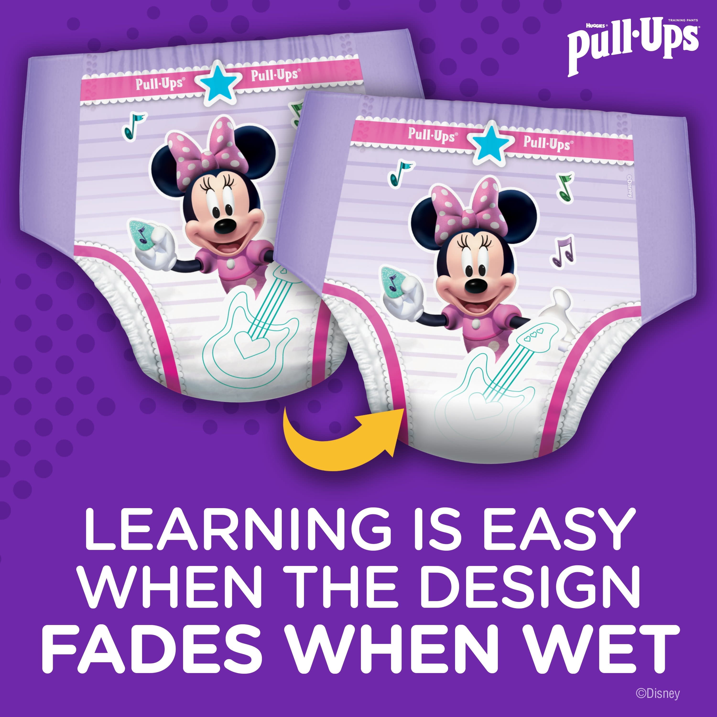 Disposable training diapers with leak protection you can trust – day or night Helps teach toddlers the concept of easy up and down in a pull-up diaper – girls’ training pants that fit like cotton underwear Exclusive Disney graphics with Minnie Mouse & Jessie and Bullseye that fade when wet Quick check & easy changes – diaper pants with easy open sides that can be refastened for an adjustable fit Available in sizes 12-24 Month (14-26lb.), 2T-3T (18-34 lb.), 3T-4T (32-40 lb.) and 4T-5T (38-50 lb.); visit Pull-Ups.com for tips, resources, games and more!
