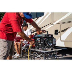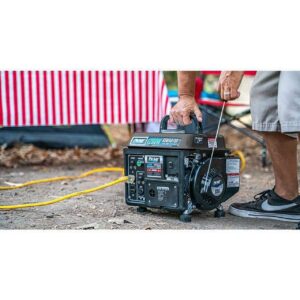 – 1, 200 peak watts/ 900 running watts of power|The single cylinder, 2-stroke engine with recoil start and durable, compact design are perfect for camping and other outdoor recreation|A 1. 1 gallon fuel tank gives you up to 5 hours of continuous operation at half load|(2) 120V outlets and (1) 12V DC output provide you with ample space for powering tools and other devices|Oil mix 30:1