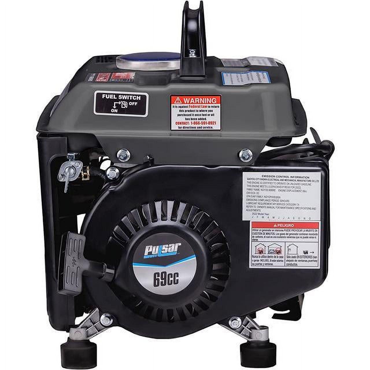 his Pulsar gas 2 Stroke peak 1200W generator has a maximum output of 1200W/60Hz & rated output of 900W/60Hz. It has a 69cc single cylinder 2 HP air cooled Engine. It runs 8. 5 hours at half load & includes a recoil start & 12V DC output.