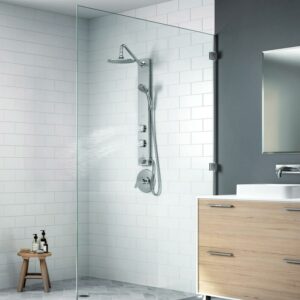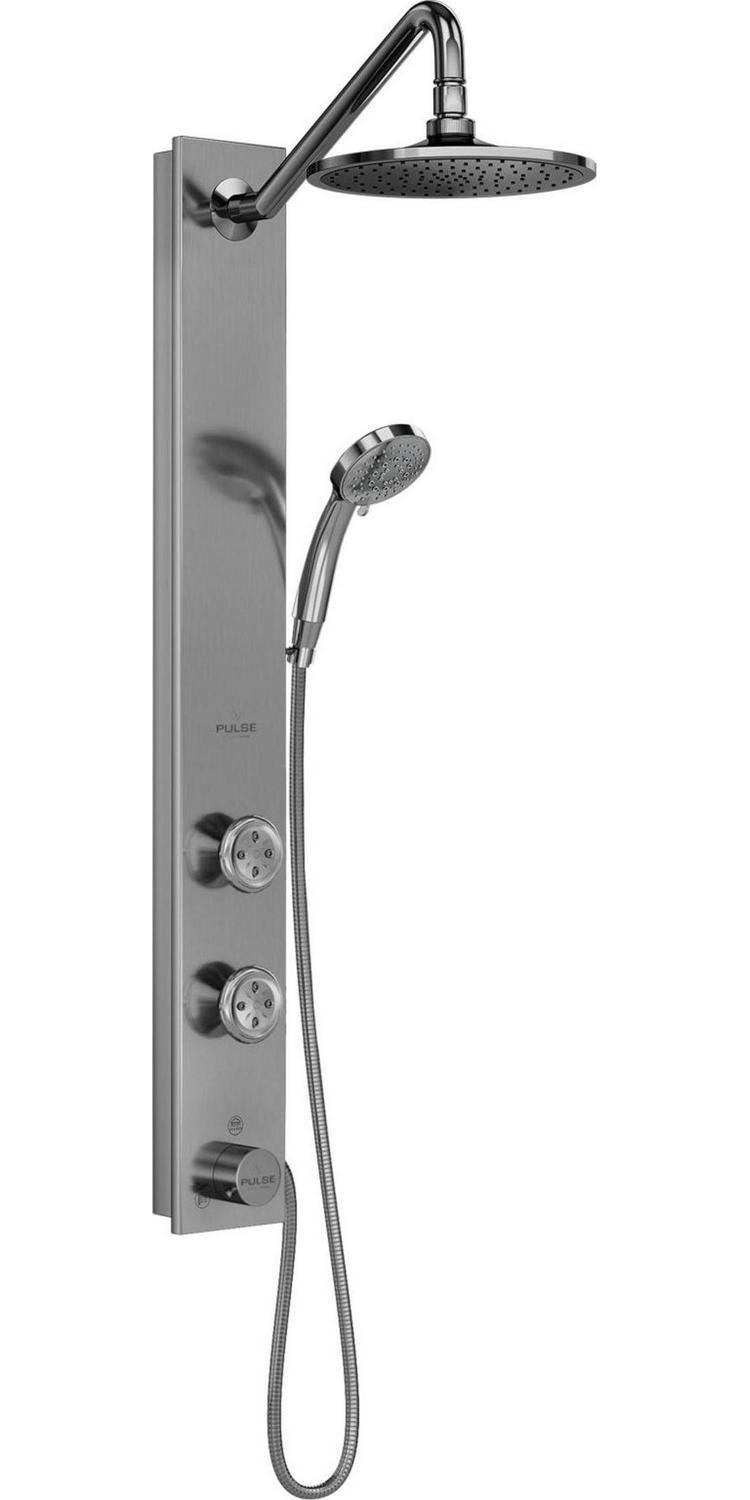 ,Surface mounted and completely pre-plumbed, easily retrofit your existing shower without a remodel,Durable brushed stainless steel or tempered glass with chrome fixtures,8″ Rain showerhead with soft tips to clear mineral buildup for long lasting performance,2 Pulsating body jets provide a soothing spray with adjustable positioning,1-function (1021-W) or 3-Function (1021-SSB) hand shower with 59″ (1.5m) double-interlocking stainless steel hose,Brass diverter easily switches functions-place between functions for further enjoyment,Rub tips clean with Spray Straight technology,Simply replaces your existing showerhead/shower arm
