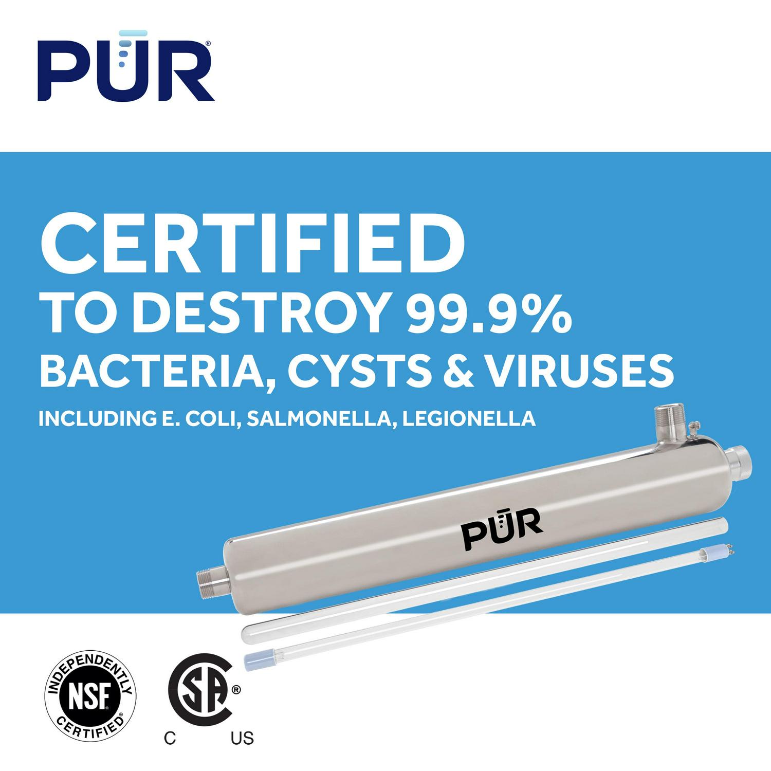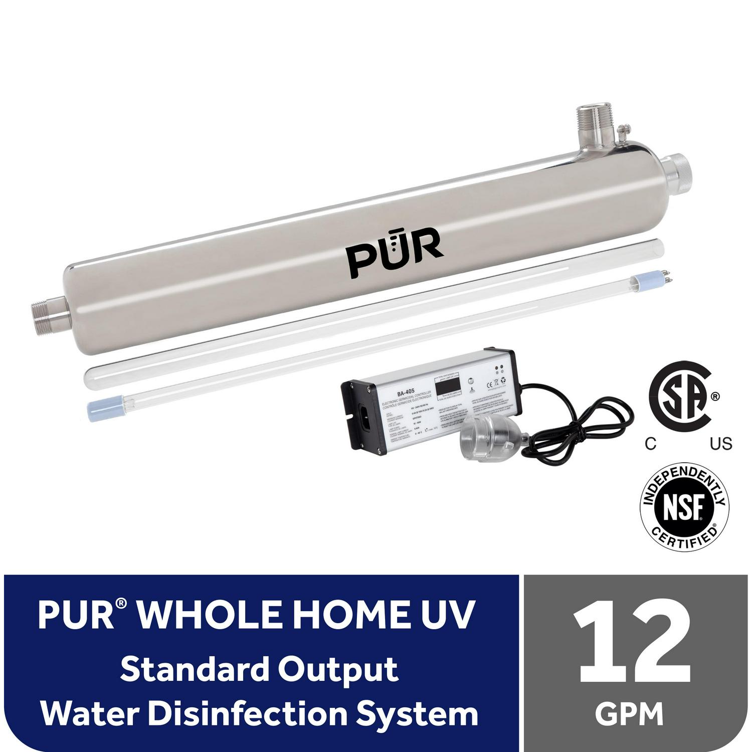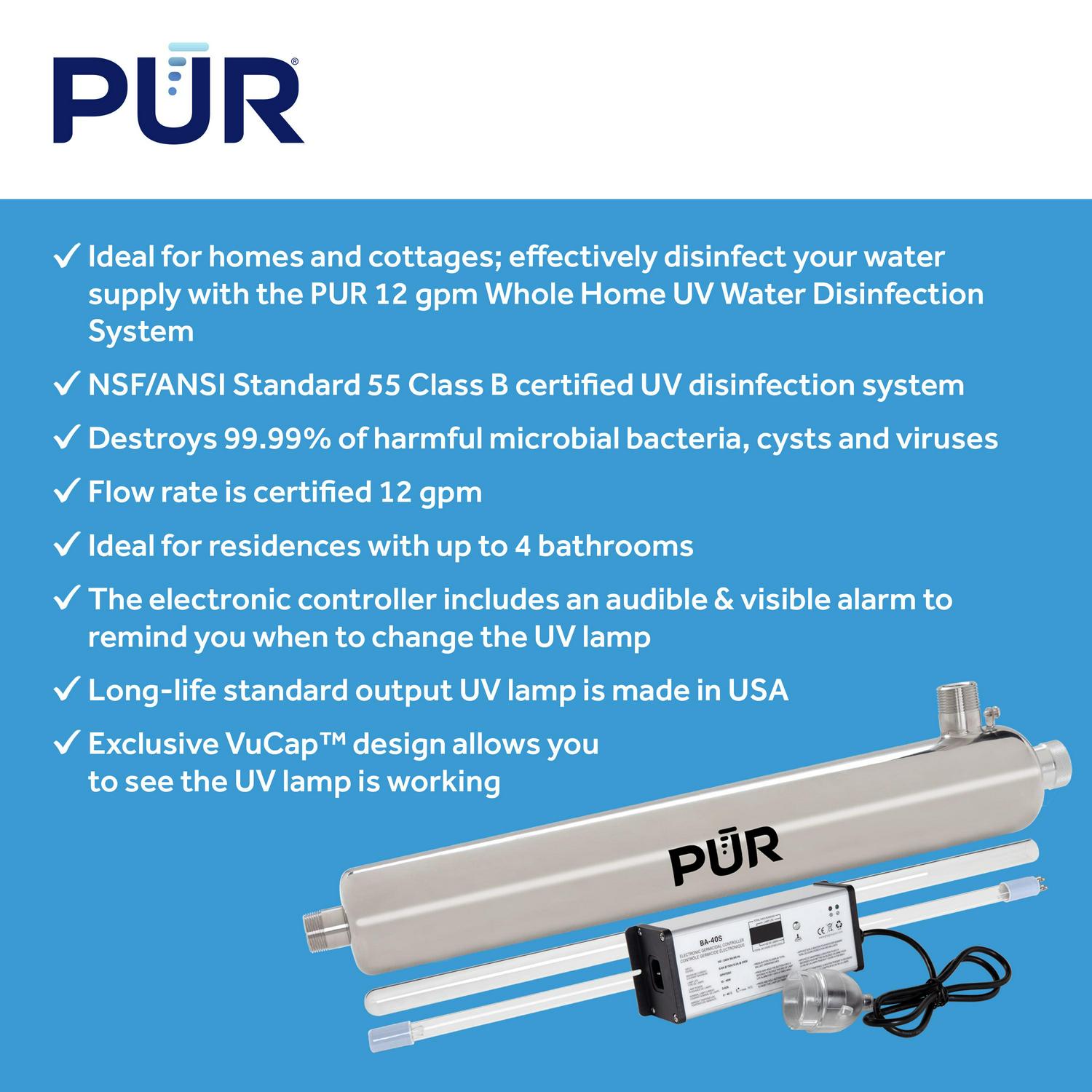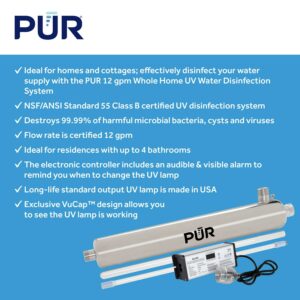 Enjoy safer water throughout your home by disinfecting your entire water supply with the PUR 7 gpm Ultraviolet (UV) Disinfection Water Treatment System. This water disinfection system uses a UV lamp to disinfect and protect your water from 99.99% of harmful microbial bacteria like cysts, as well as viruses, such as E coli, salmonella and legionella, without adding any chemicals. It features a compact axial flow design for improved water disinfection and the long-life UV lamp is . Equipped with an audible/visible UV lamp change reminder, the electronic controller will ensure your system is always functional and that your water remains safer. The system is easy to service and requires very little maintenance by replacing the UV lamp and quartz sleeve annually. The VuCapTM allows you to easily see that the UV lamp is operating. Great for homes or cottages, this UV water Purifier & disinfection system is easy to install and includes the necessary mounting and assembly hardware.