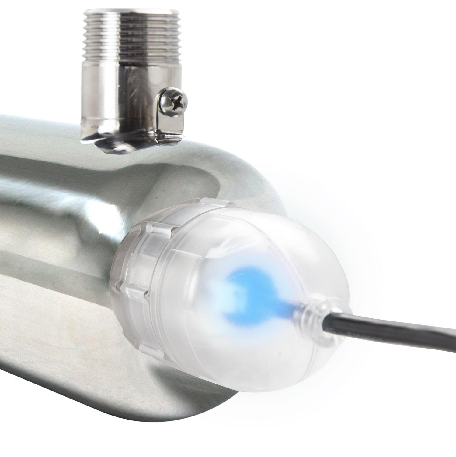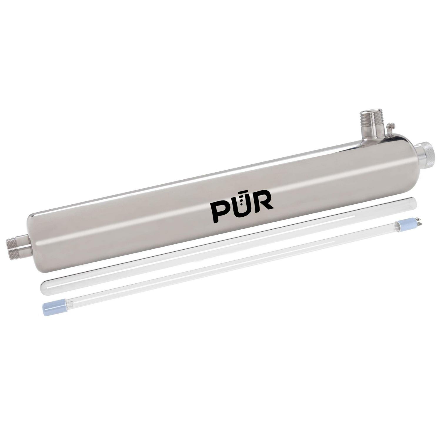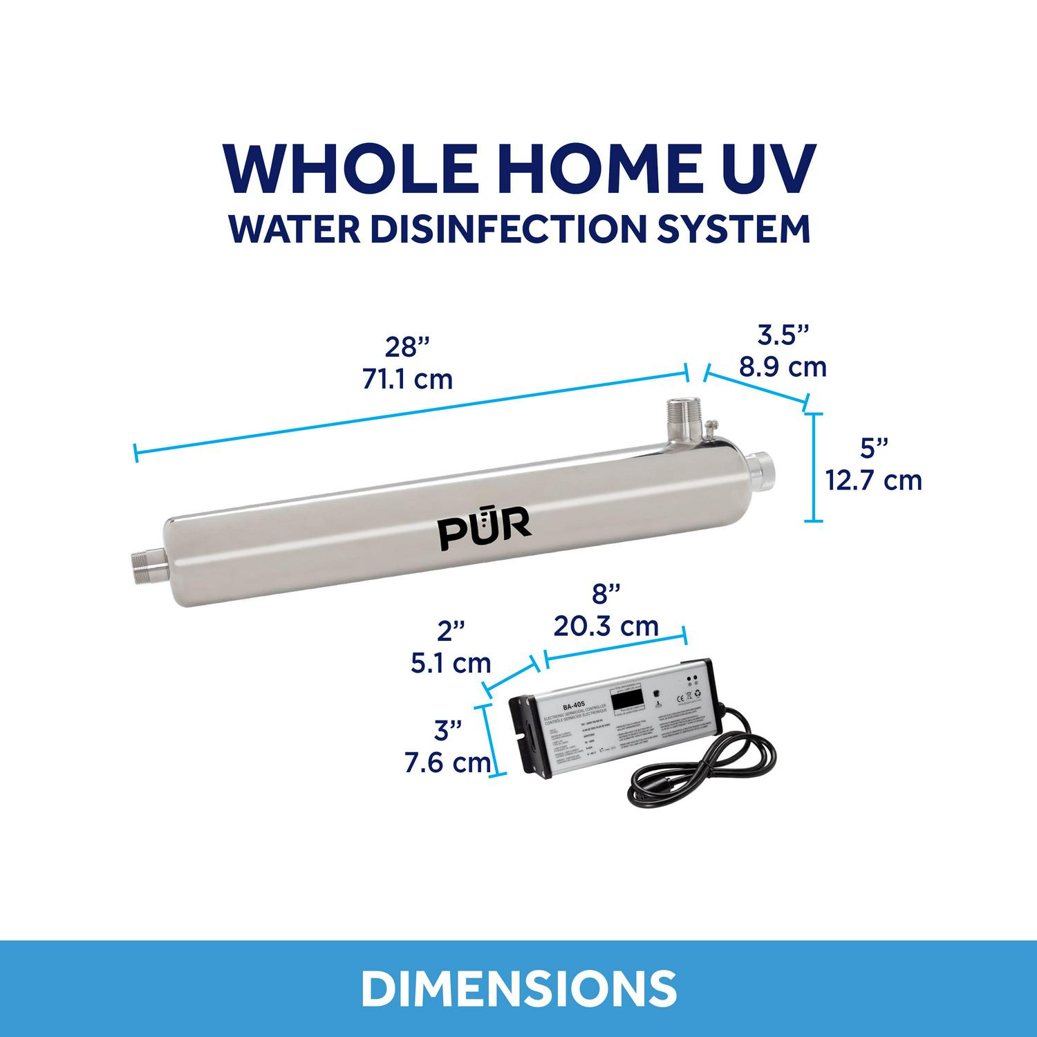 Enjoy safer water throughout your home by disinfecting your entire water supply with the PUR 7 gpm Ultraviolet (UV) Disinfection Water Treatment System. This water disinfection system uses a UV lamp to disinfect and protect your water from 99.99% of harmful microbial bacteria like cysts, as well as viruses, such as E coli, salmonella and legionella, without adding any chemicals. It features a compact axial flow design for improved water disinfection and the long-life UV lamp is . Equipped with an audible/visible UV lamp change reminder, the electronic controller will ensure your system is always functional and that your water remains safer. The system is easy to service and requires very little maintenance by replacing the UV lamp and quartz sleeve annually. The VuCapTM allows you to easily see that the UV lamp is operating. Great for homes or cottages, this UV water Purifier & disinfection system is easy to install and includes the necessary mounting and assembly hardware.
