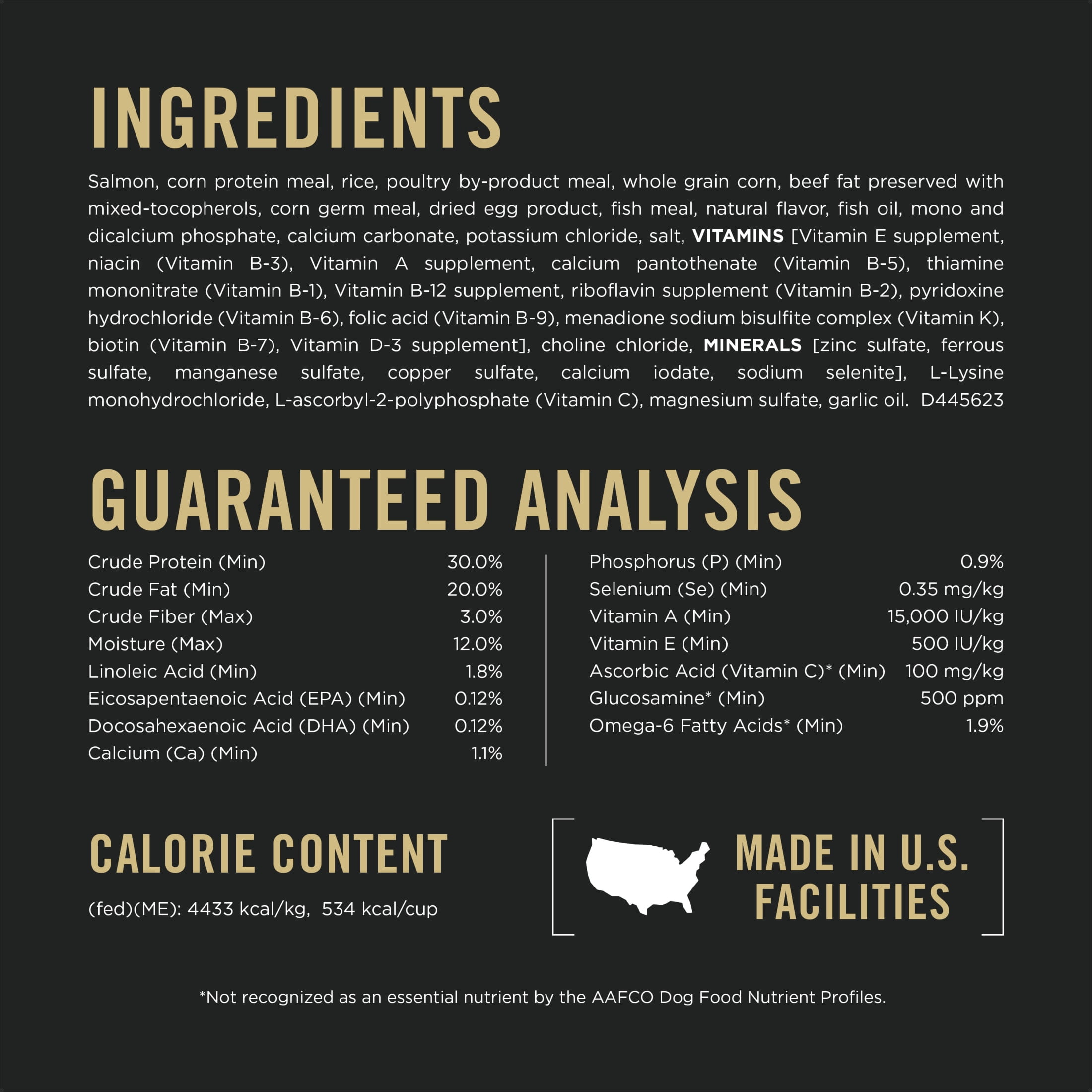 This Purina Pro Plan dry dog food has concentrated nutrition that optimizes oxygen metabolism (Vo2 MAX) for increased endurance High protein dry dog food delivering complete and balanced nutrition with real salmon as the first ingredient Dog kibble offering amino acids to nourish muscles, including the crucial time after exercise, and a blend of 30 percent protein and 20 percent fat fuels metabolic needs and maintains lean muscle Dry dog food with glucosamine and EPA, an omega-3 fatty acid, helps support joint health and mobility, while Omega-6 fatty acids and vitamin A nourish skin and coat Purina Pro Plan Sport formula offering 100 percent complete and balanced nutrition for highly active dogs at all life stages, including puppies and reproducing females Spoil your pet with Purina products. Reward yourself with points on every purchase. Download the myPurina app today